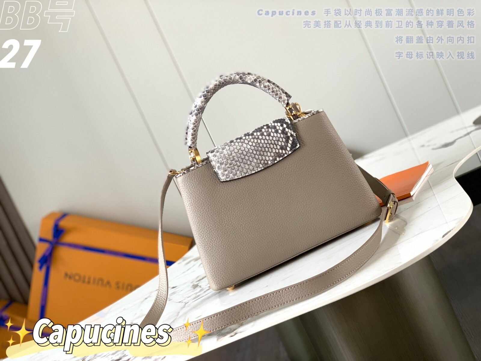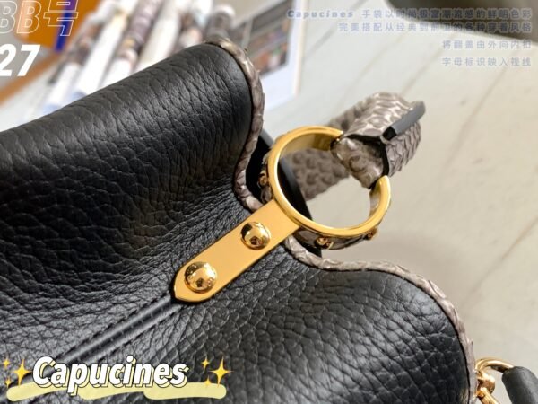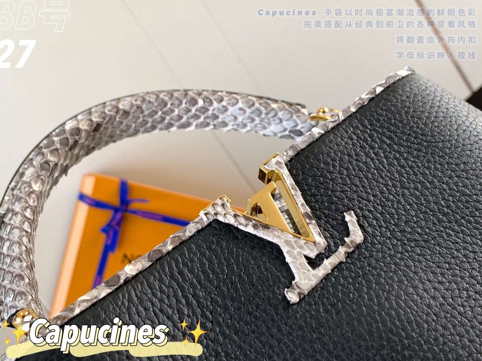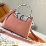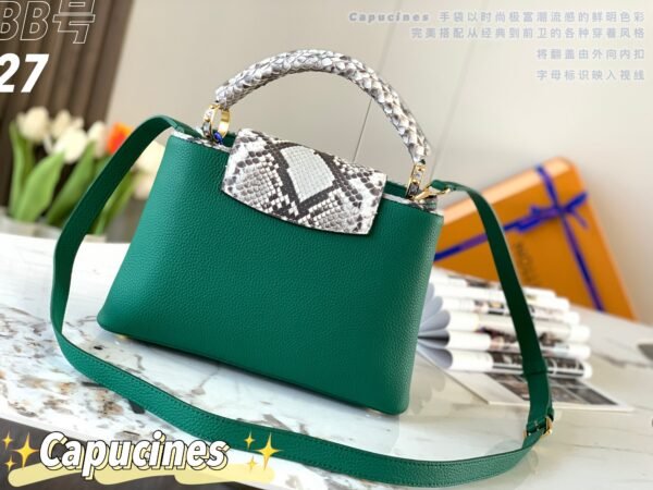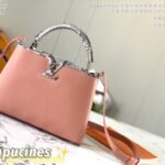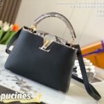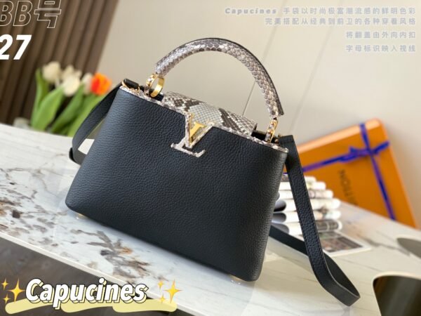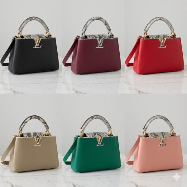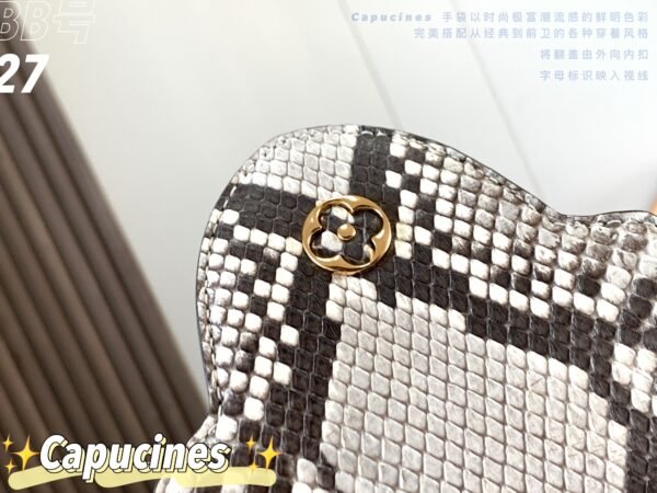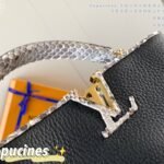 The exotic python gracefully adorns the sturdy top handle and the signature top flap, creating a breathtaking visual and textural contrast against the solid-colored leather body. The design is proudly anchored by the house’s signature traditional details, including the prominent LV initials on the front and the unique jewelry-like metallic side rings. It features the iconic Capucines two-way flap: wear it on the outside to subtly display a delicate Monogram Flower, or tuck it inside to reveal the bold LV logo. Designed for the dynamic modern lifestyle, it comes equipped with a fully detachable, matching leather shoulder strap that effortlessly unlocks multiple carrying styles to suit any outfit or mood.