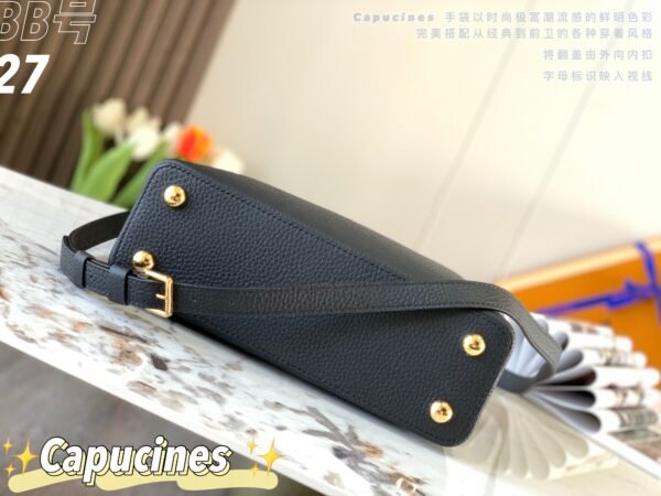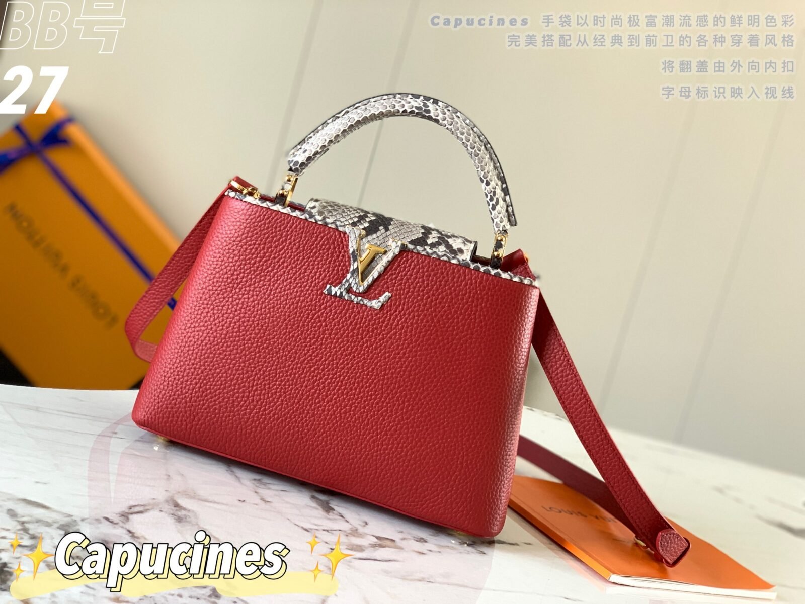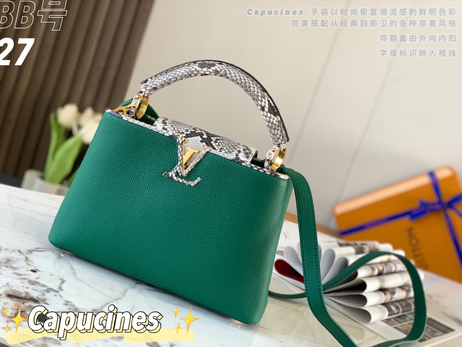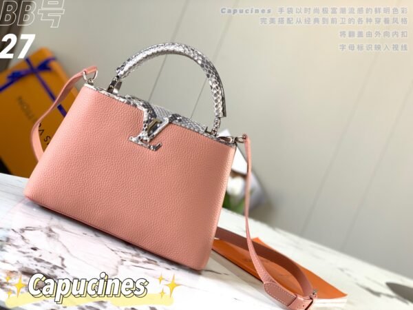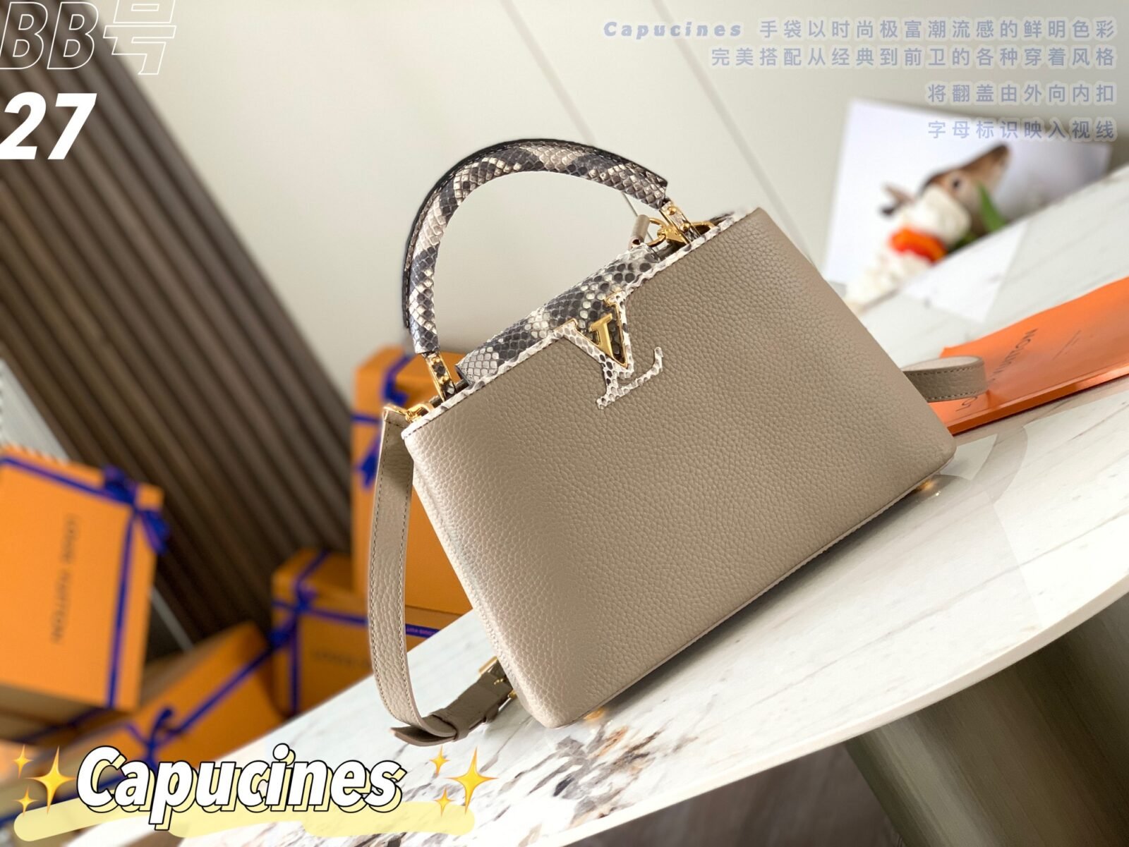 The exotic python gracefully adorns the sturdy top handle and the signature top flap, creating a breathtaking visual and textural contrast against the solid-colored leather body. The design is proudly anchored by the house’s signature traditional details, including the prominent LV initials on the front and the unique jewelry-like metallic side rings. It features the iconic Capucines two-way flap: wear it on the outside to subtly display a delicate Monogram Flower, or tuck it inside to reveal the bold LV logo. Designed for the dynamic modern lifestyle, it comes equipped with a fully detachable, matching leather shoulder strap that effortlessly unlocks multiple carrying styles to suit any outfit or mood.
