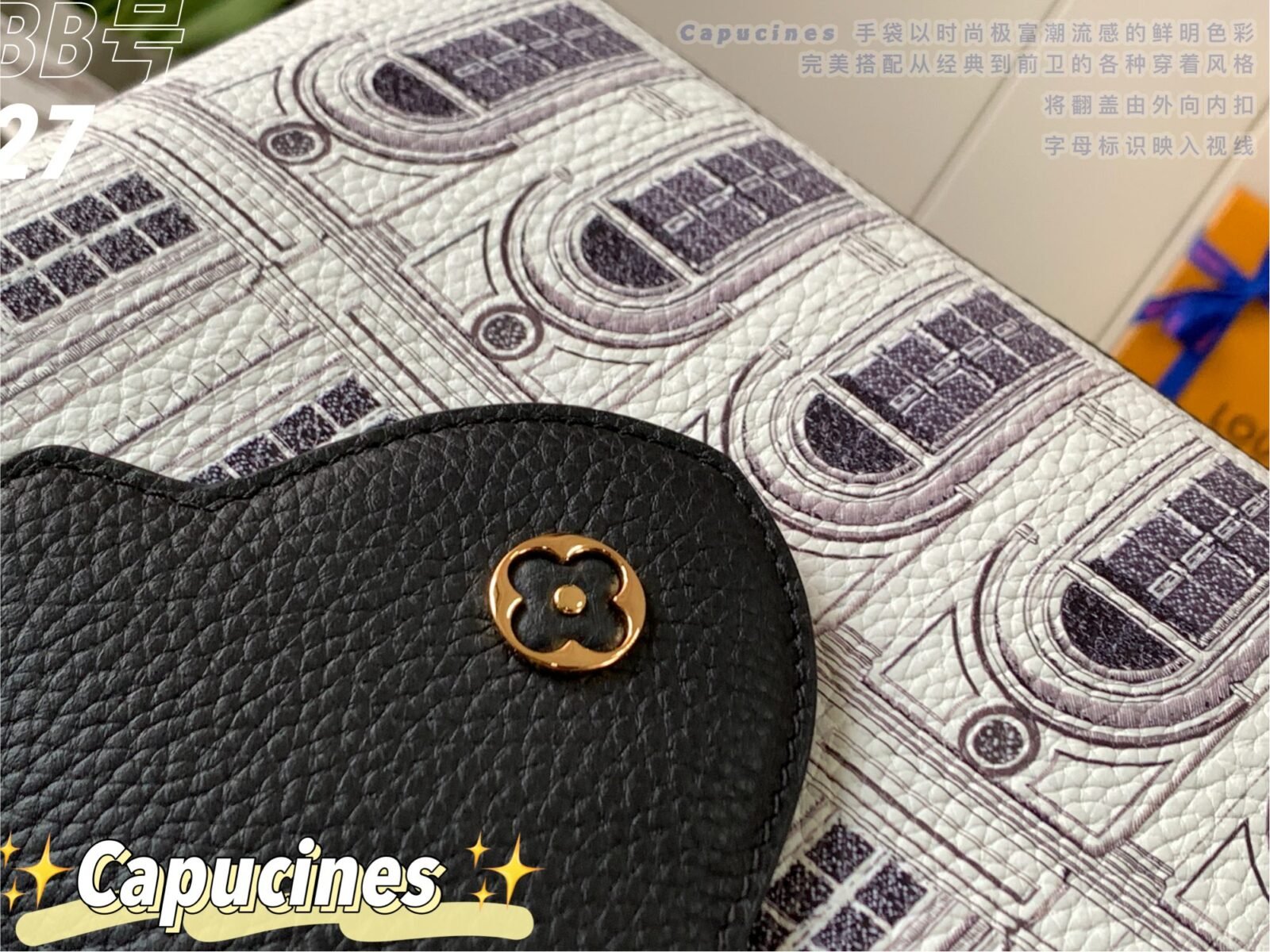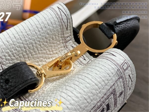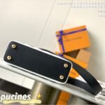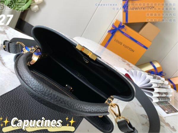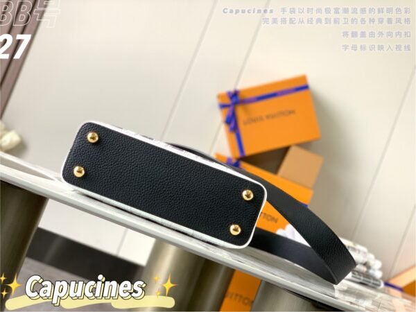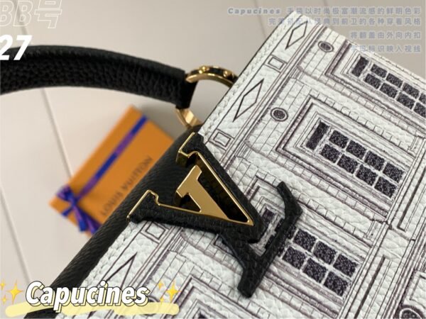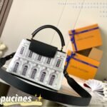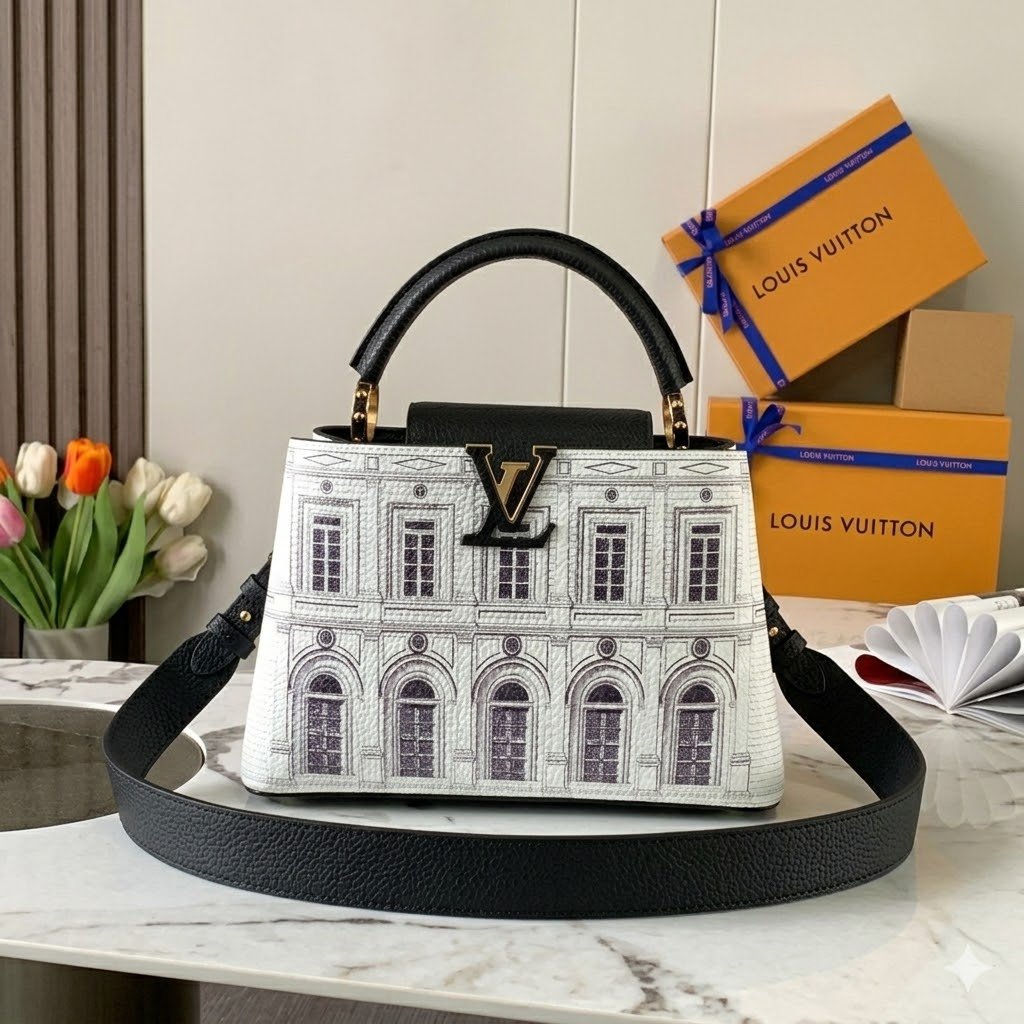Masterfully crafted from premium matte calfskin that has been specially treated to mimic the tactile texture of stone, the bag acts as a stunning canvas for designer Piero Fornasetti’s imaginative, classical architectural illustrations. This striking, highly detailed black-and-white illustrated body is perfectly framed by a solid black leather top flap, a sturdy top handle, and a matching black leather shoulder strap. The design is beautifully anchored by the signature LV initials in matching black, elegantly outlined by gold-tone hardware. As a true collector’s item, it offers both breathtaking artistry and the versatile, everyday functionality the Capucines silhouette is renowned for.