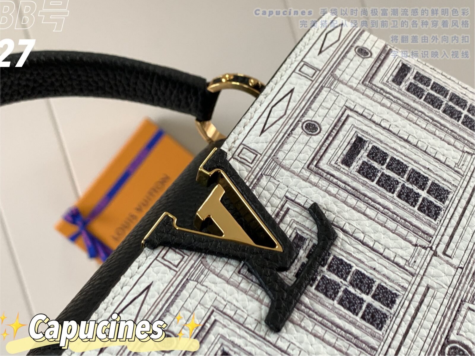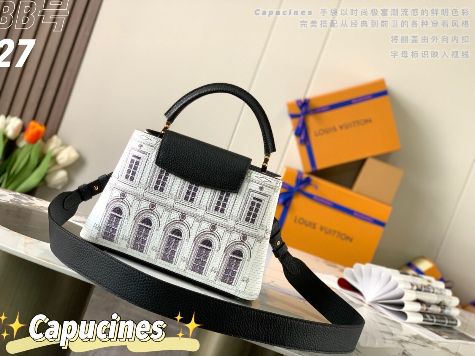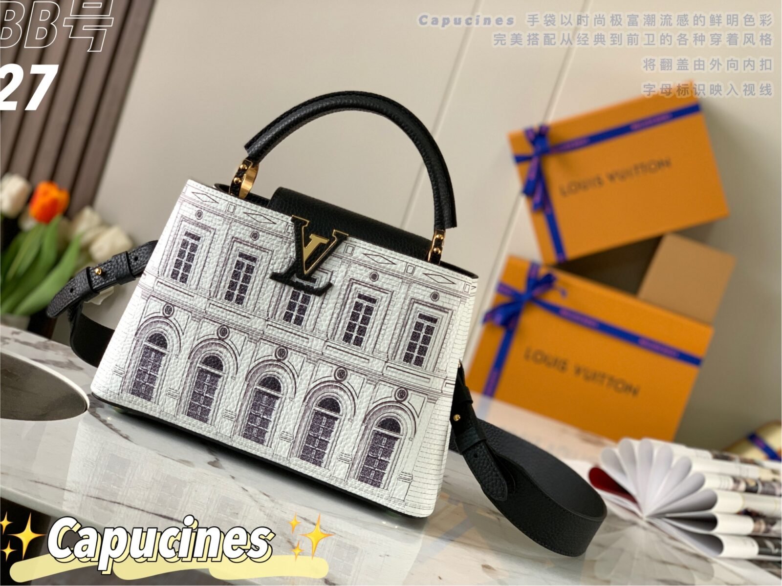 Masterfully crafted from premium matte calfskin that has been specially treated to mimic the tactile texture of stone, the bag acts as a stunning canvas for designer Piero Fornasetti’s imaginative, classical architectural illustrations. This striking, highly detailed black-and-white illustrated body is perfectly framed by a solid black leather top flap, a sturdy top handle, and a matching black leather shoulder strap. The design is beautifully anchored by the signature LV initials in matching black, elegantly outlined by gold-tone hardware. As a true collector’s item, it offers both breathtaking artistry and the versatile, everyday functionality the Capucines silhouette is renowned for.
