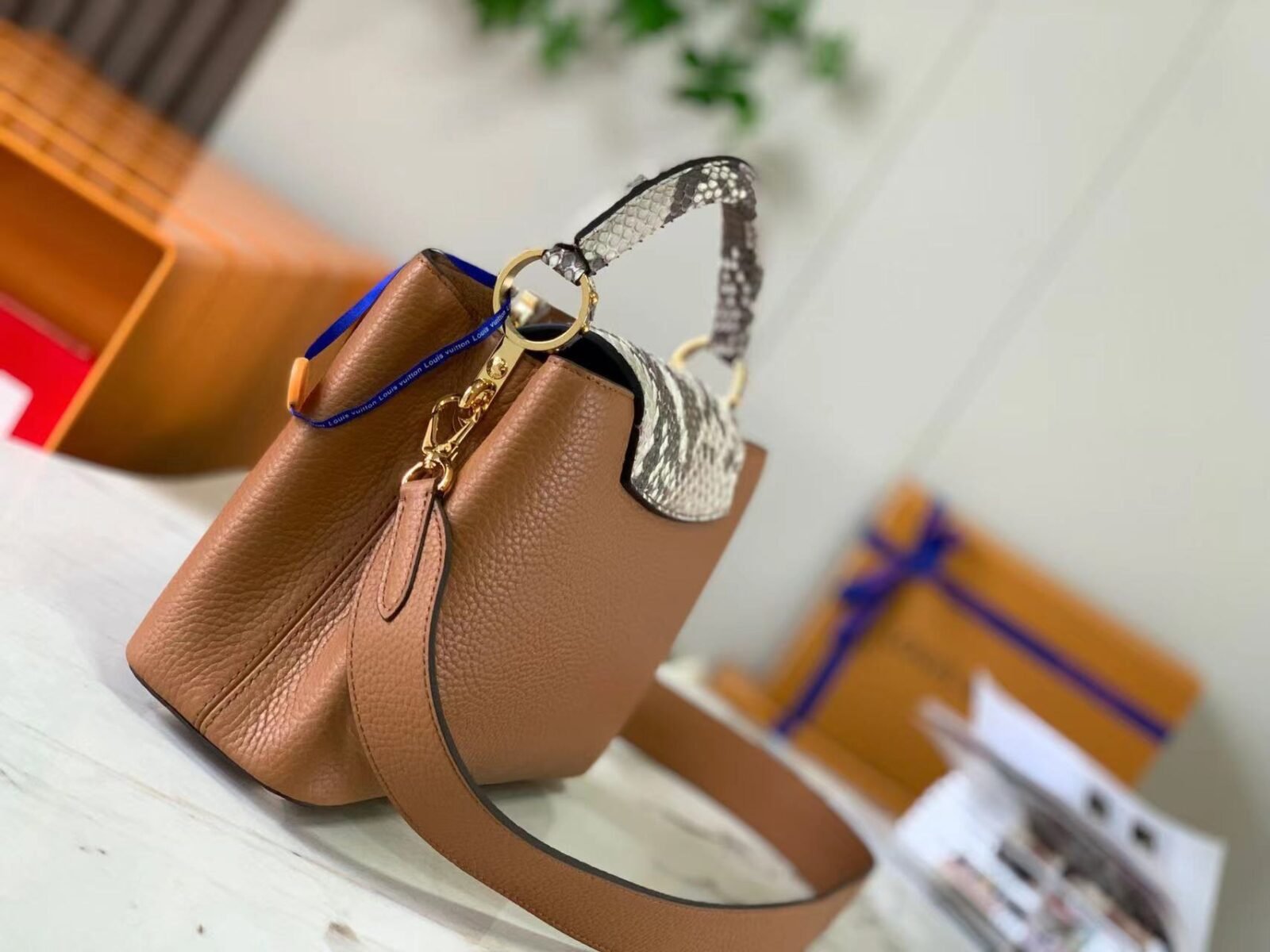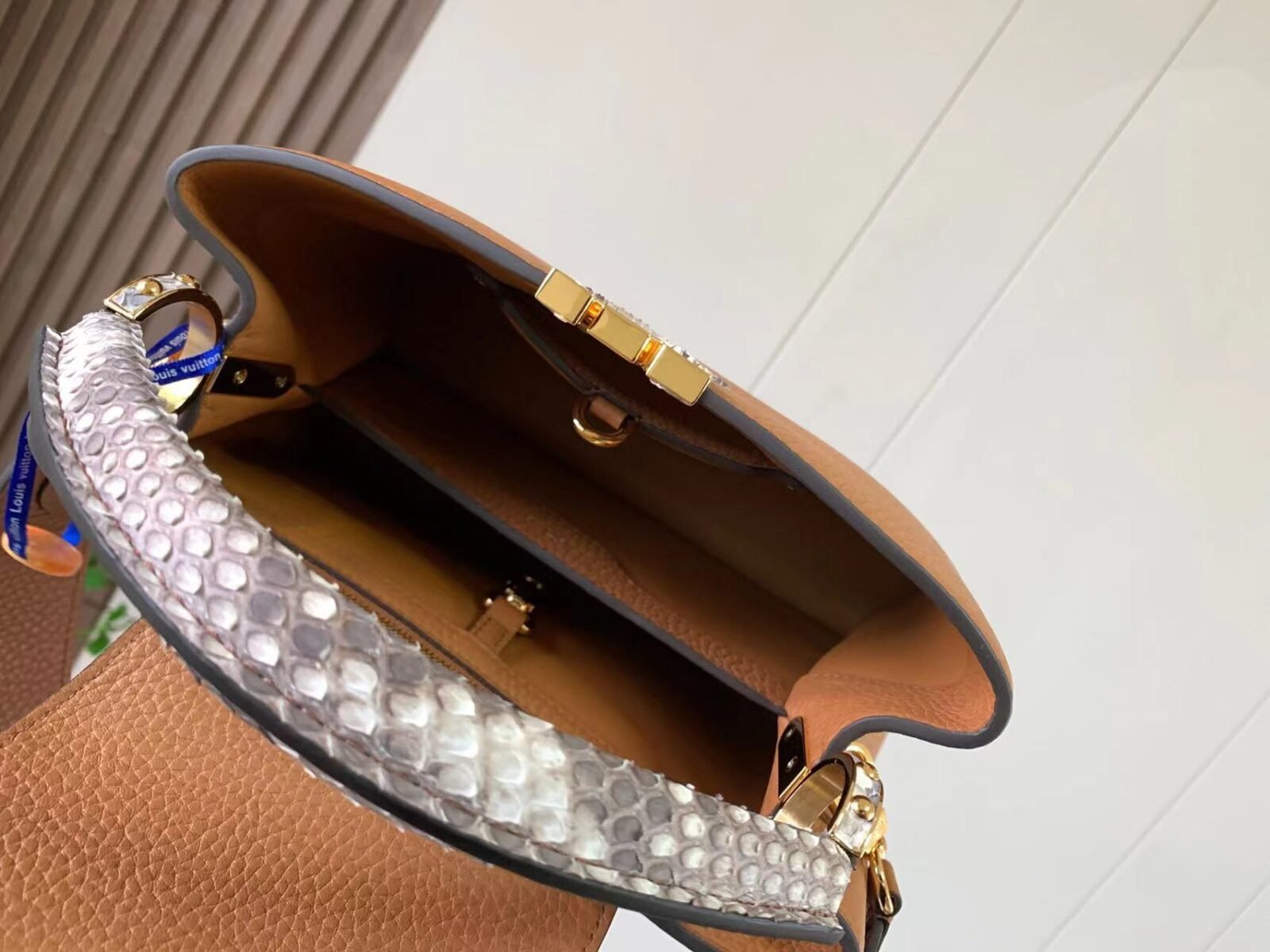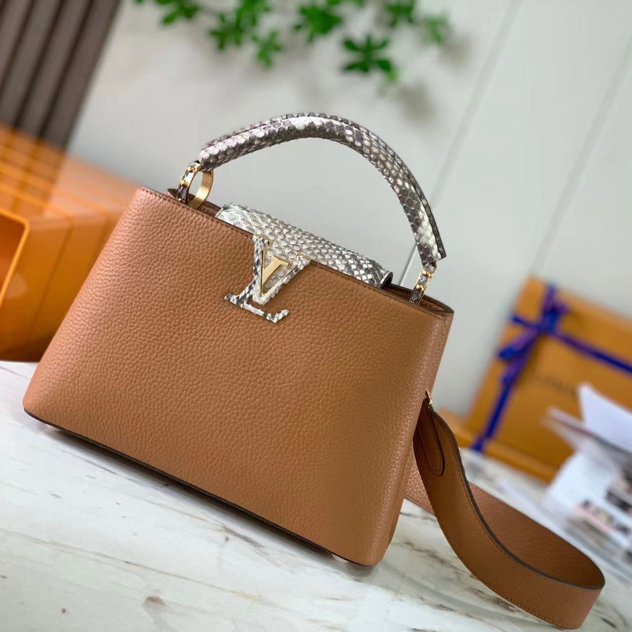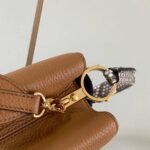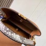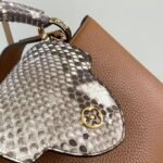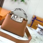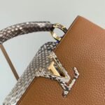 The design showcases the hallmark versatility of the Capucines line with its clever two-way front flap. You can tuck the flap inside the bag to proudly display the prominent, python-inlaid LV initials, or wear it on the outside to reveal a delicate, shining gold-tone Monogram Flower resting on the striking snakeskin surface. Designed for modern sophistication and effortless day-to-night styling, the bag features gleaming gold-tone metallic hardware and comes equipped with a matching, detachable calfskin shoulder strap, allowing for a seamless transition from a classic hand carry to a comfortable shoulder or crossbody drape.