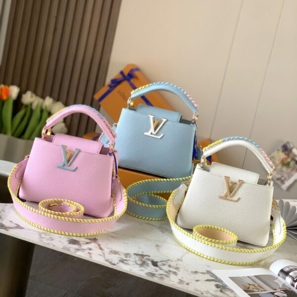 The true standout feature of this charming design is the intricate, multi-colored leather braiding that elegantly frames both the sturdy top handle and the edges of the wide, two-tone shoulder strap. This beautiful woven craftsmanship perfectly complements the soft, elegant pastel finish of the signature LV initials on the front, creating a cohesive and deeply sophisticated aesthetic. Designed for modern versatility, it comes equipped with a fully detachable wide strap for a highly comfortable shoulder or crossbody carry, alongside the classic top handle for a chic hand drape.