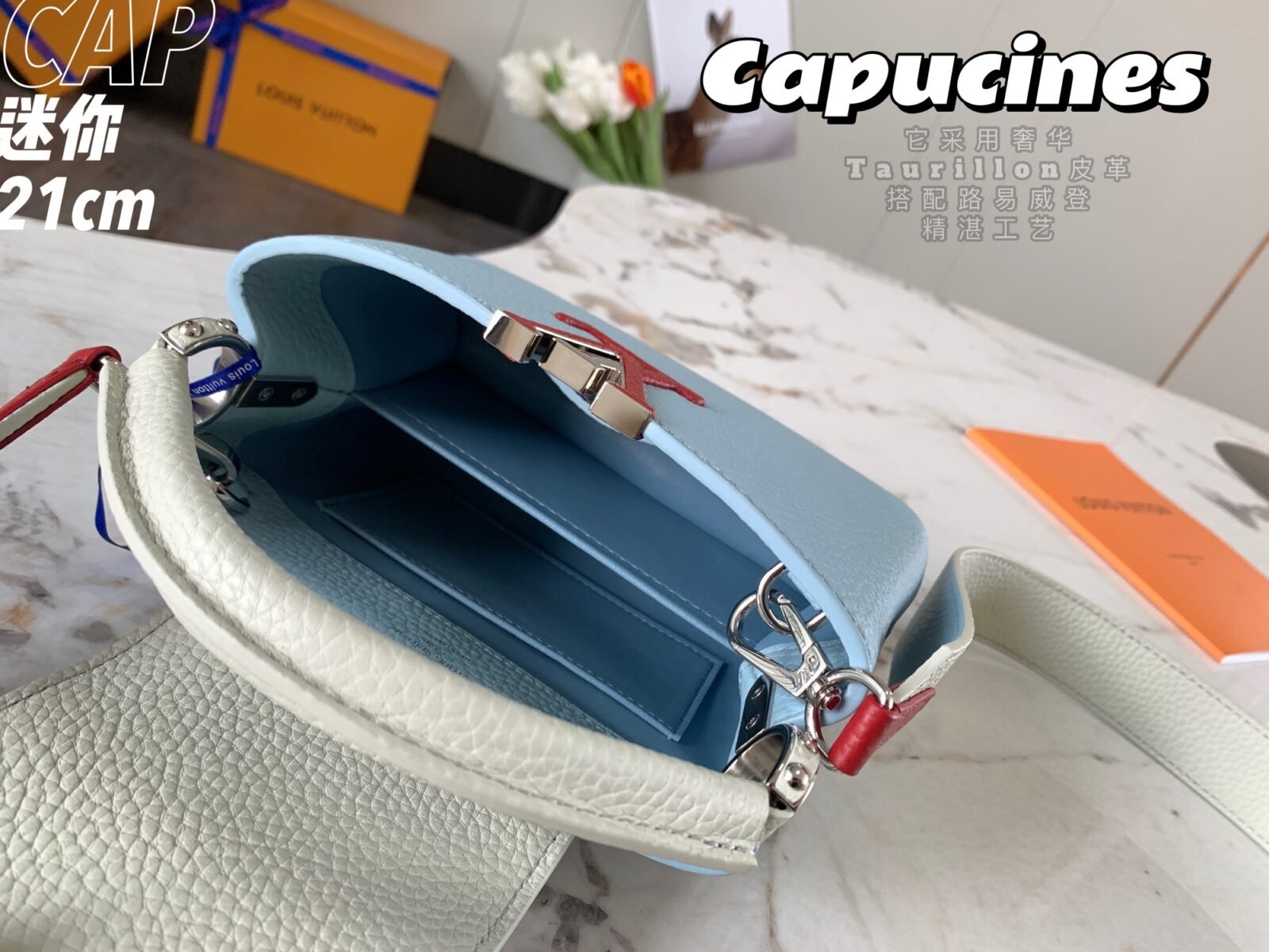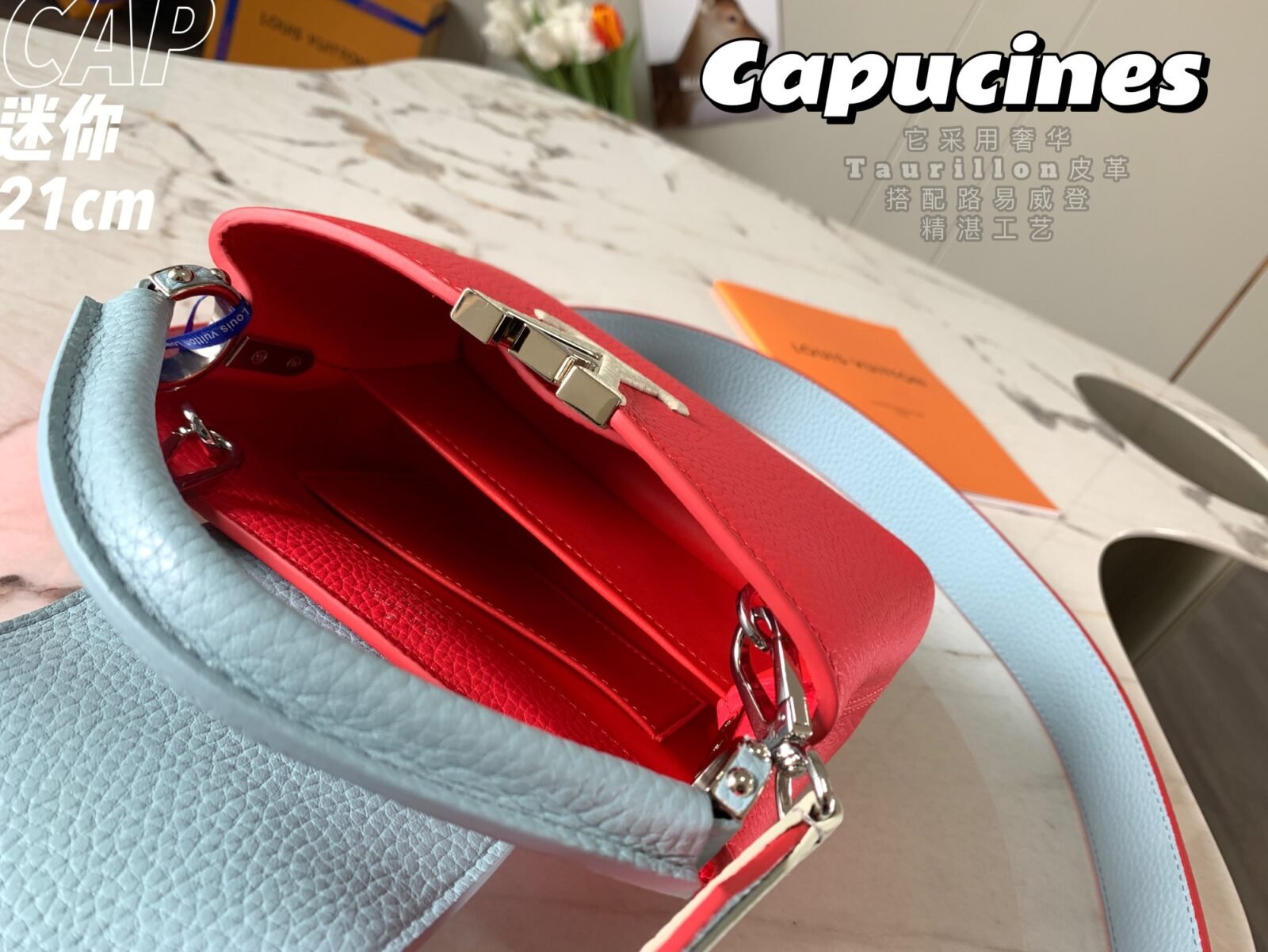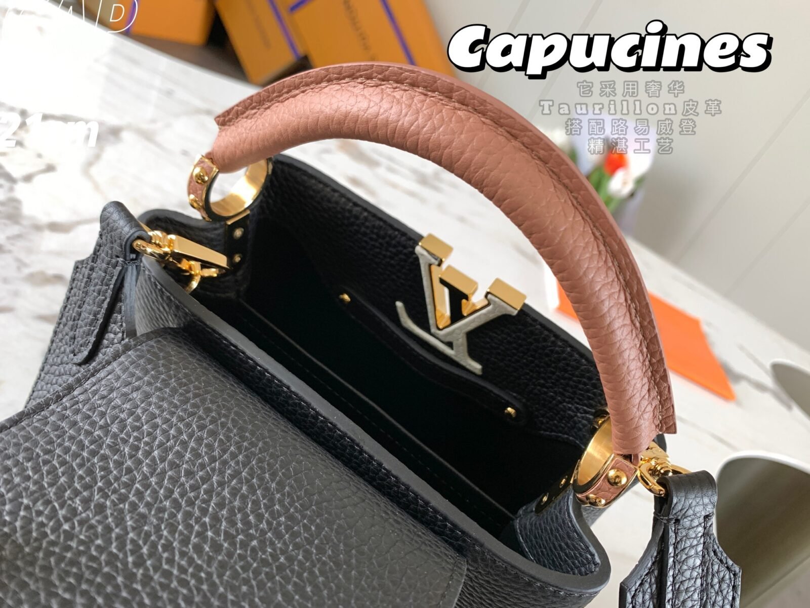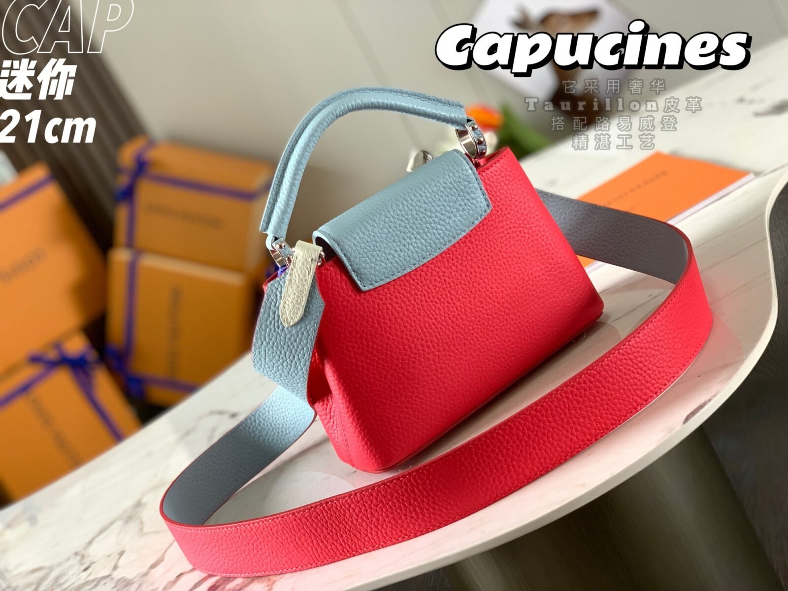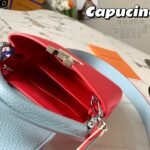 Named after the Parisian street where Louis Vuitton opened his first store, the Capucines handbag represents a timeless and sophisticated silhouette that is as enduring as the House itself. Exquisitely crafted from imported, full-grain Taurillon cowhide leather, this specific edition features a striking color-blocked design that brings a refined yet modern touch to any ensemble.