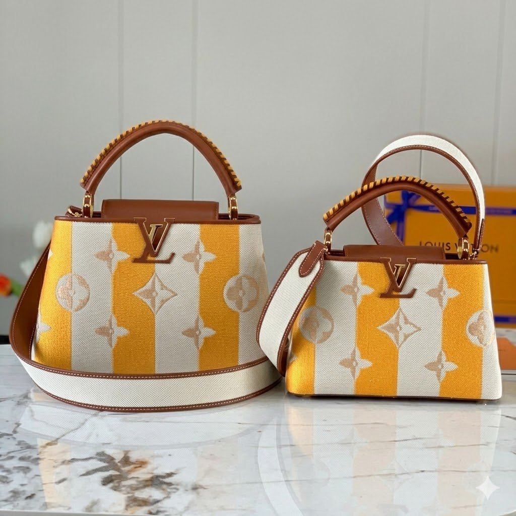 Step into the new season with the breathtakingly elegant Louis Vuitton Capucines MM, a standout piece originally introduced in the Spring 2021 collection. Radiating a glamorous and refreshing aesthetic, this beautiful medium-sized handbag brilliantly combines luxurious textures and vibrant patterns. The body is crafted from a premium linen fabric blend, showcasing striking yellow and white vertical stripes that are beautifully interwoven with oversized, signature Monogram flower motifs.