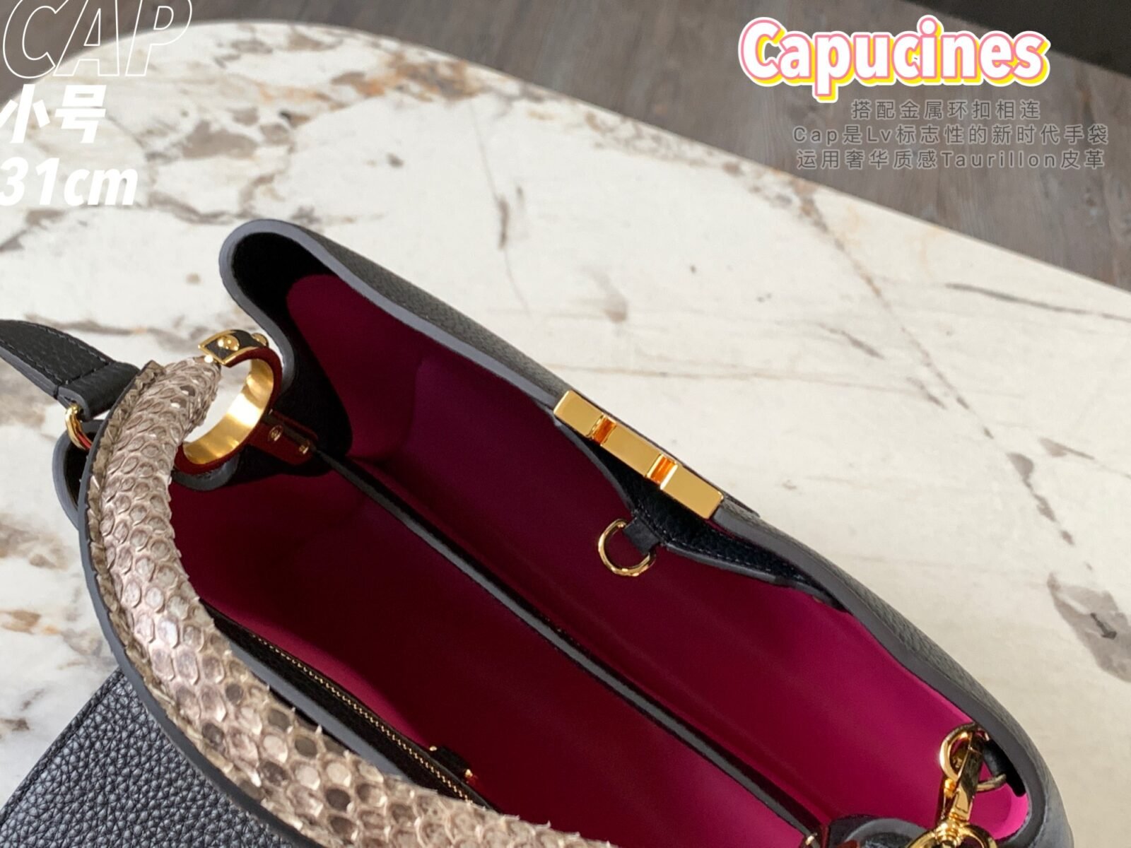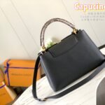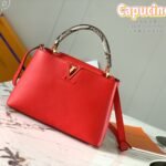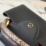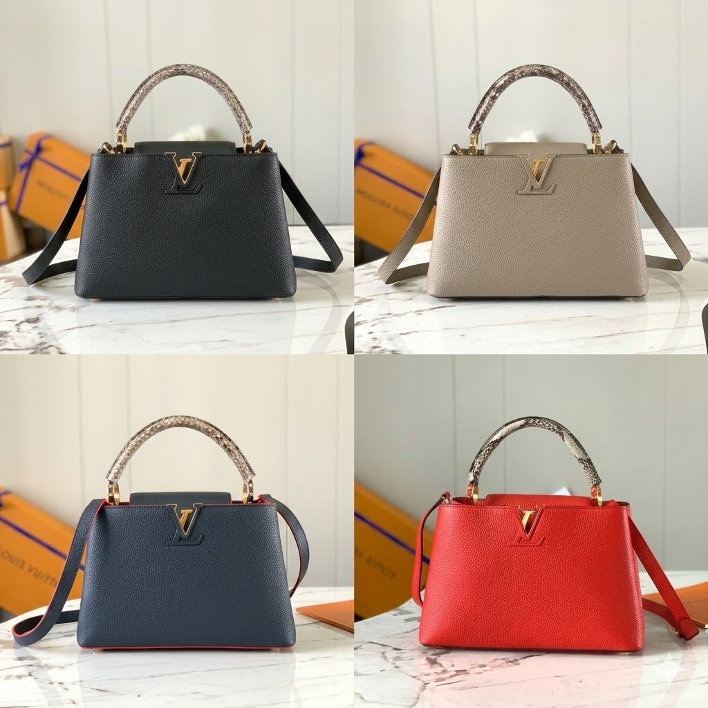 Named after the Rue des Capucines in Paris, where Louis Vuitton opened his very first store, the Capucines handbag is a timeless masterpiece designed to bring an unparalleled sense of elegance and refinement to any ensemble. This exceptionally luxurious edition is masterfully crafted from premium imported full-grain Taurillon cowhide leather—featuring a beautiful lychee grain texture—and is elevated by an exquisite, wide exotic python skin top handle.
