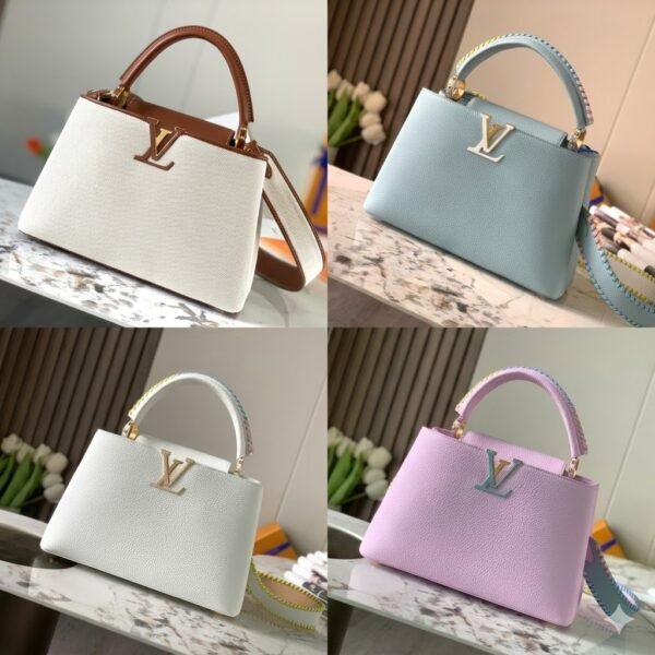 This specific model breathes fresh, colorful life into the classic silhouette. The exquisite leather craftsmanship is highlighted by a fully detachable, two-tone wide shoulder strap and playful, colorful leather details along the top handle. These vibrant accents perfectly complement the elegant, pastel-toned LV initials on the front flap, which is anchored by the signature gleaming metallic side rings. Designed for ultimate versatility and modern elegance, it easily transitions from a classic hand carry to a comfortable shoulder or crossbody style.