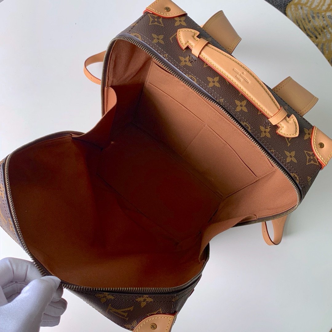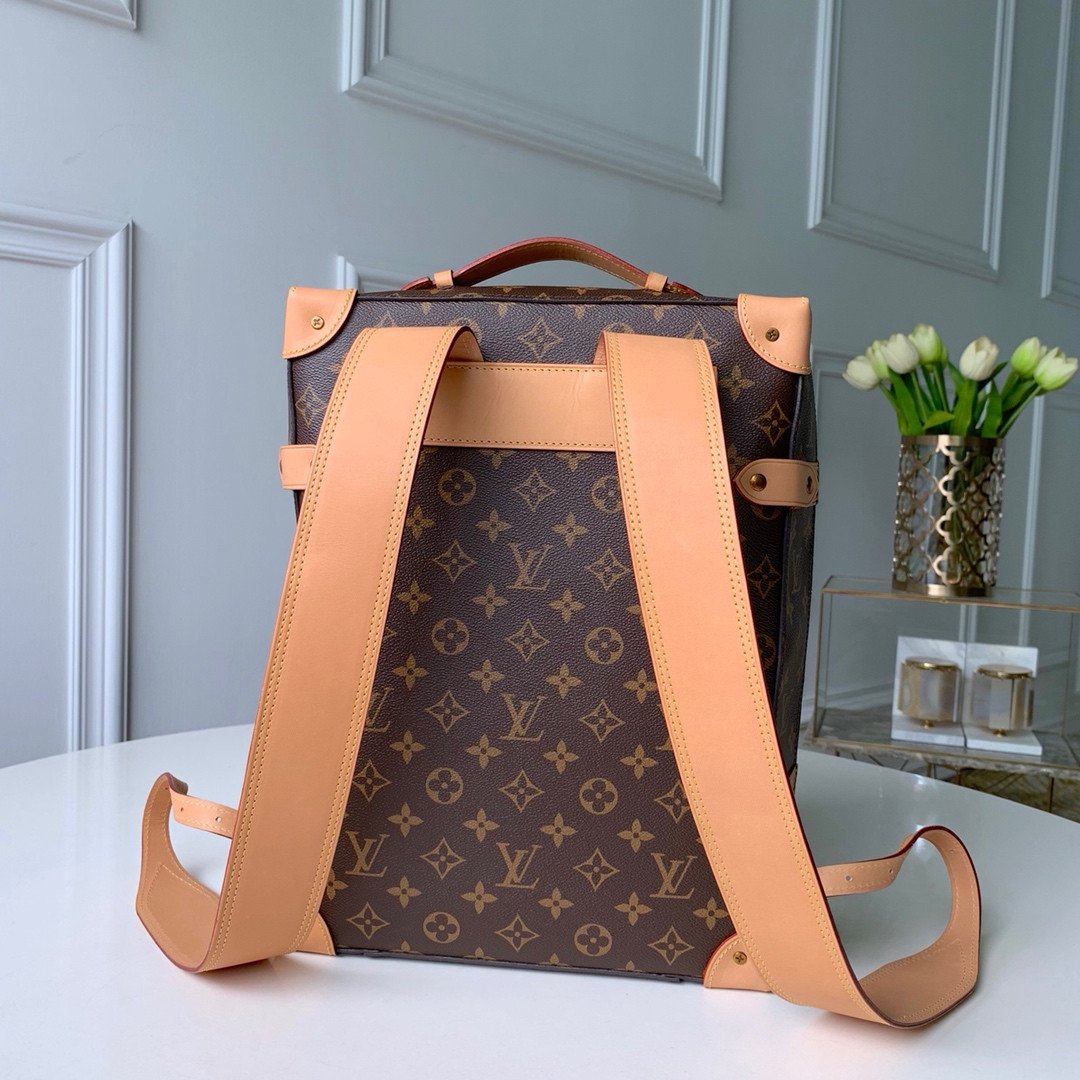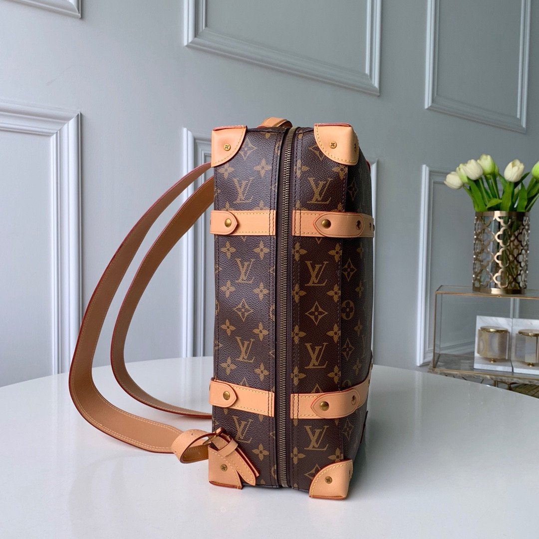 The backpack is beautifully accented with natural leather trims, including corner reinforcements and strapped detailing, reminiscent of classic LV trunks. It is perfectly complemented by aged gold-color hardware for a refined, vintage touch. Designed for both style and practicality, it features a secure zip closure to keep your essentials safe and a soft textile lining to protect your belongings. The adjustable leather shoulder straps ensure comfortable, versatile wear, making it an exceptional statement piece for any occasion.