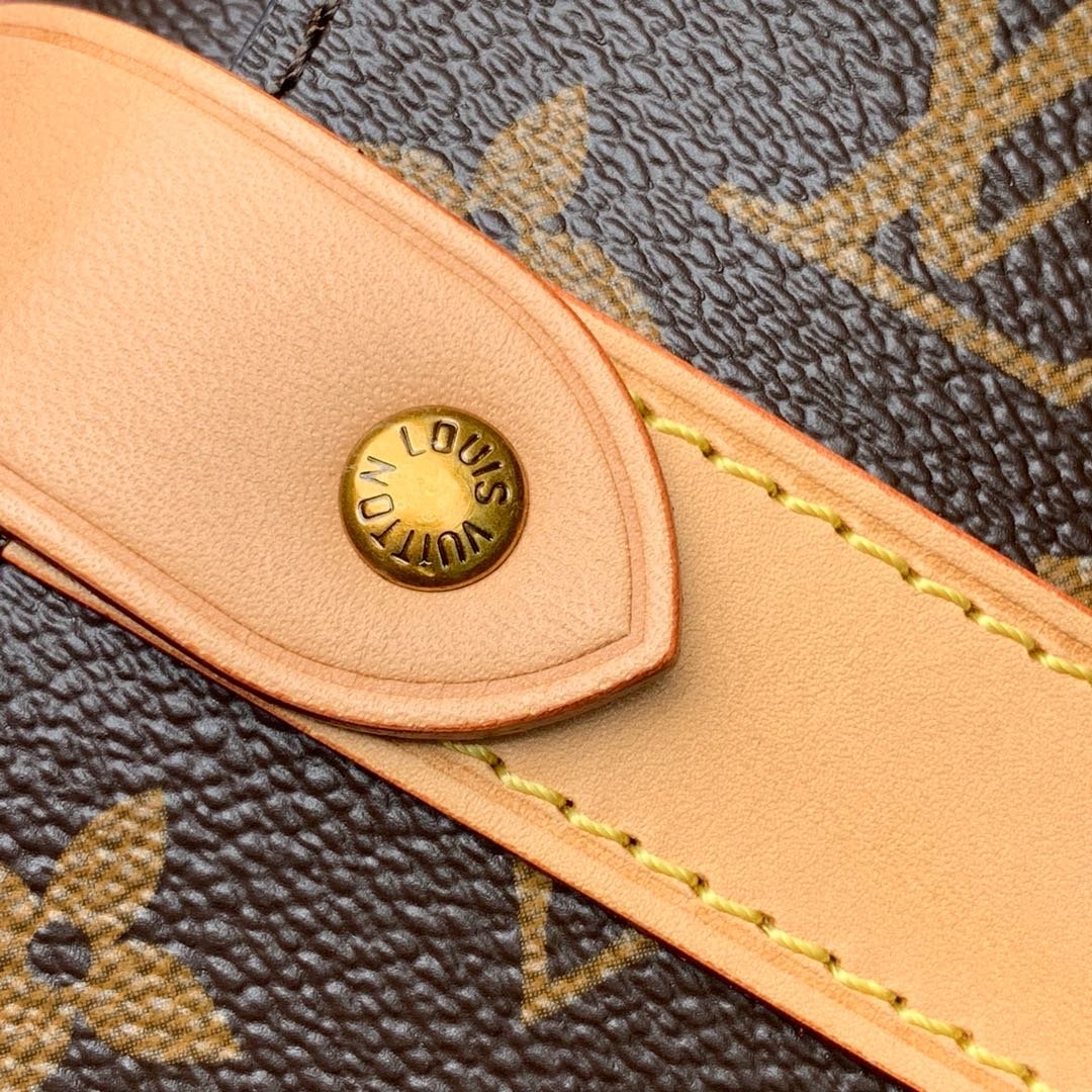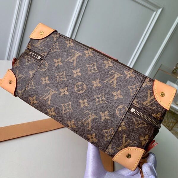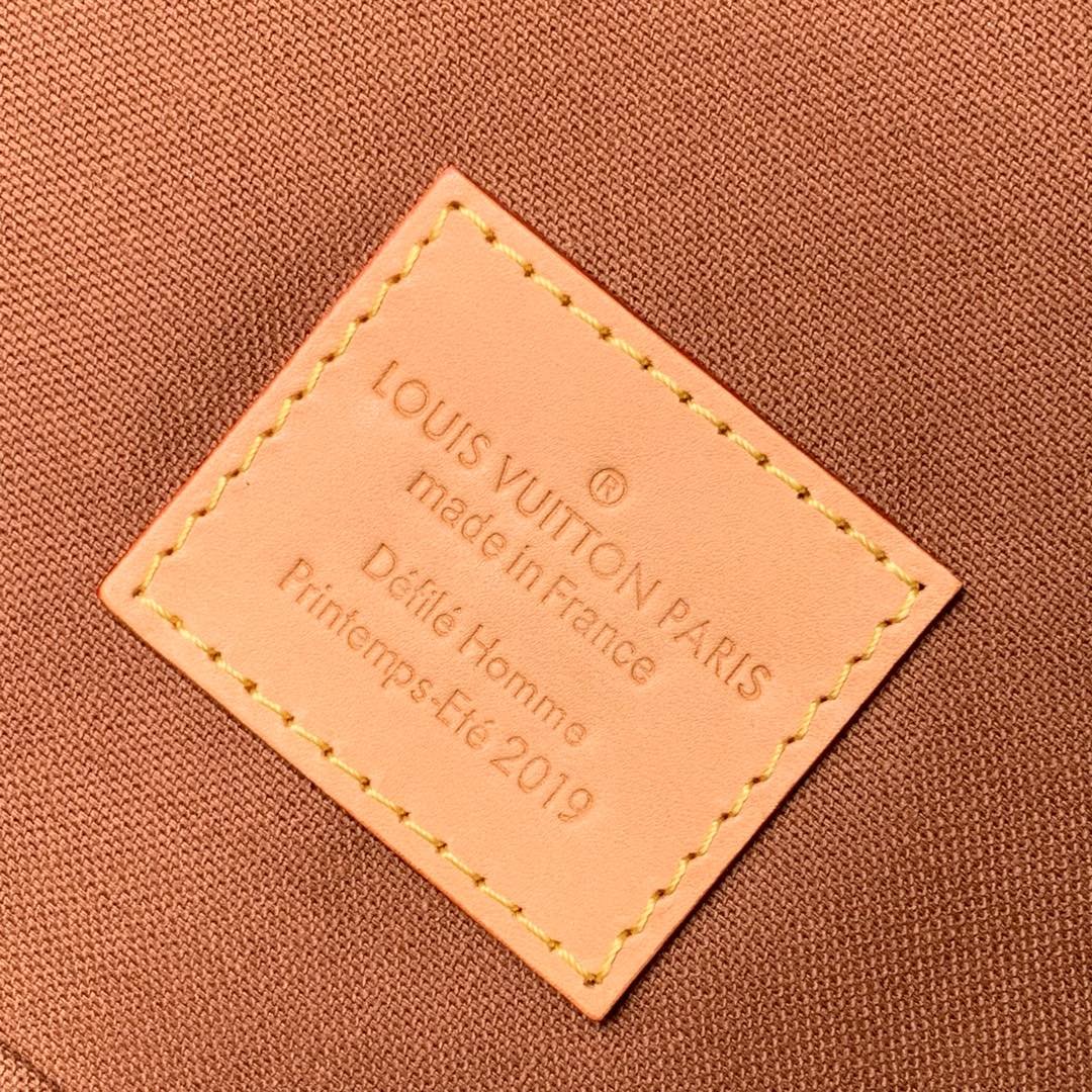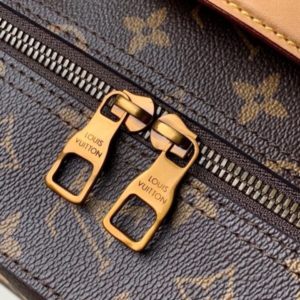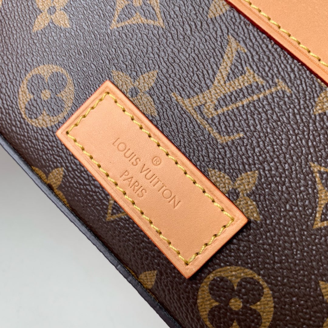 The backpack is beautifully accented with natural leather trims, including corner reinforcements and strapped detailing, reminiscent of classic LV trunks. It is perfectly complemented by aged gold-color hardware for a refined, vintage touch. Designed for both style and practicality, it features a secure zip closure to keep your essentials safe and a soft textile lining to protect your belongings. The adjustable leather shoulder straps ensure comfortable, versatile wear, making it an exceptional statement piece for any occasion.