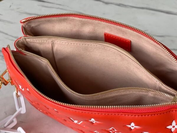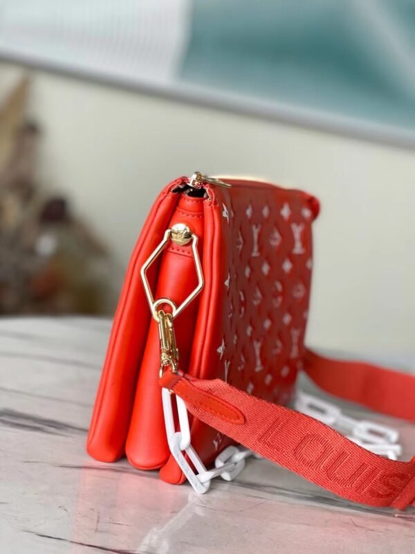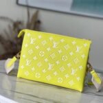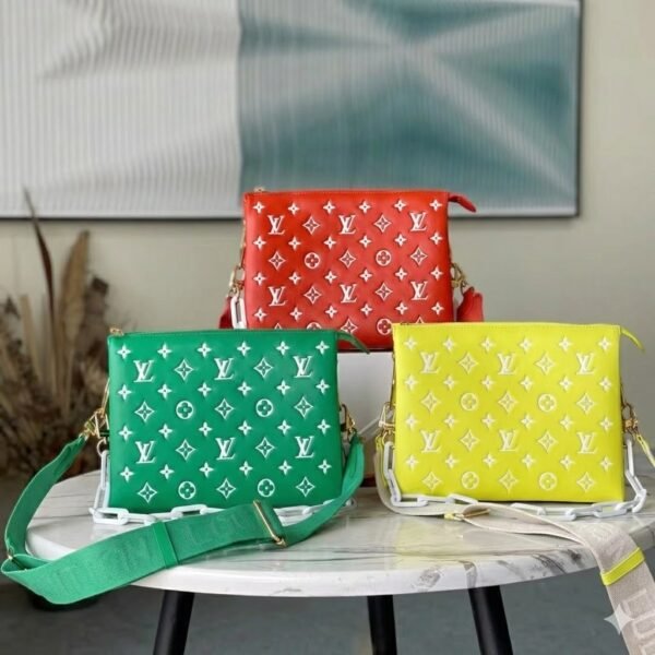 Ultimate Versatility & Effortless Wear The Coussin PM is designed to adapt to your ever-changing wardrobe. It comes equipped with two distinct, fully detachable straps: a wide, adjustable Louis Vuitton jacquard textile strap for a sporty, comfortable crossbody or long-shoulder carry, and the signature chunky fiber chain for a chic under-arm baguette look. Remove both, and it instantly transforms into a glamorous, oversized evening clutch.