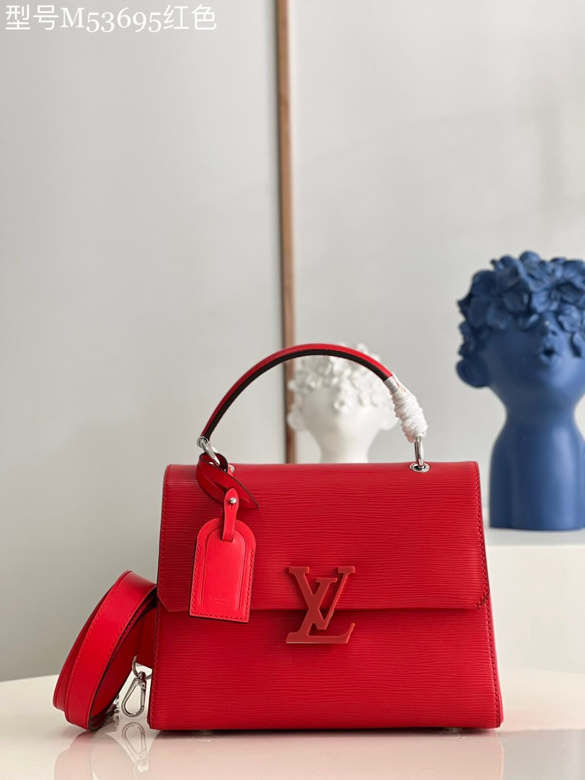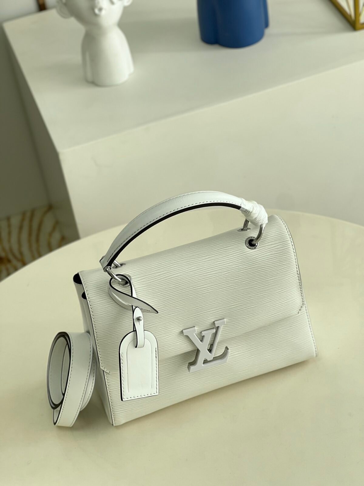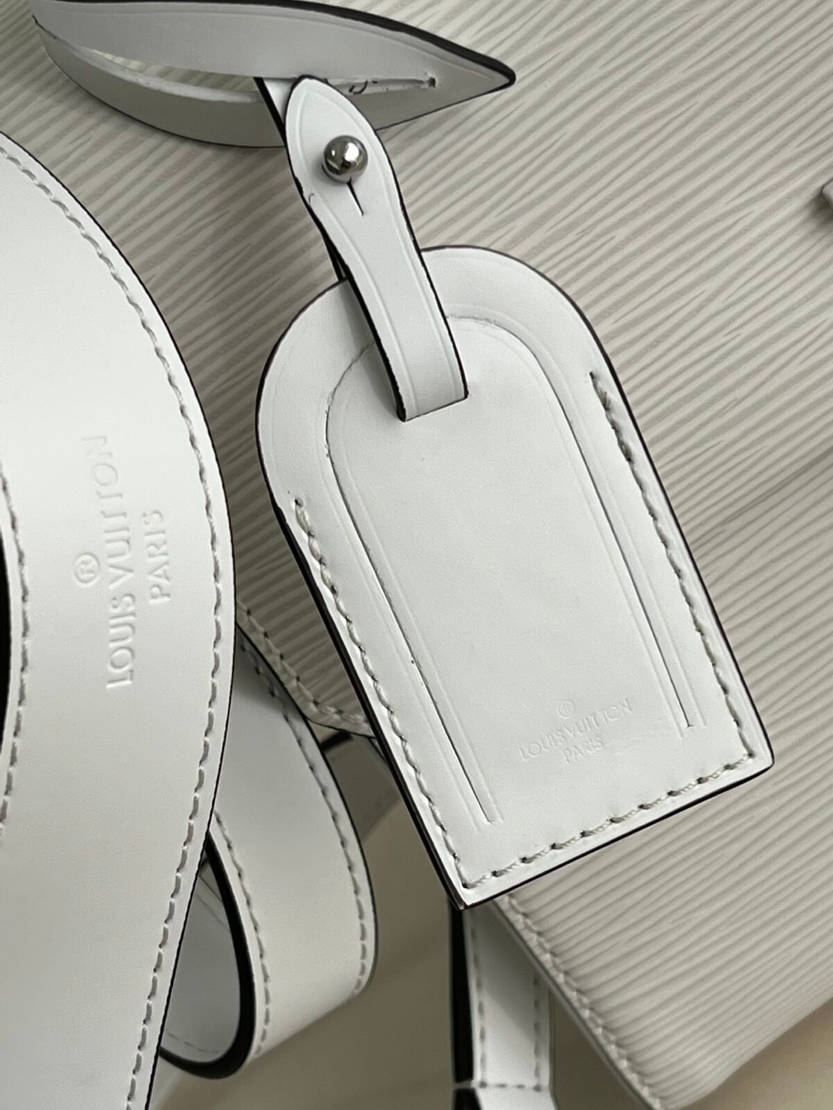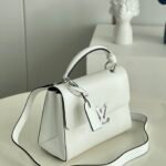 Key Features: Prominent oversized tonal LV signature logo, structured angular silhouette, elegant smooth leather top handle, matching leather luggage tag, fully detachable long leather shoulder strap for versatile wear.
