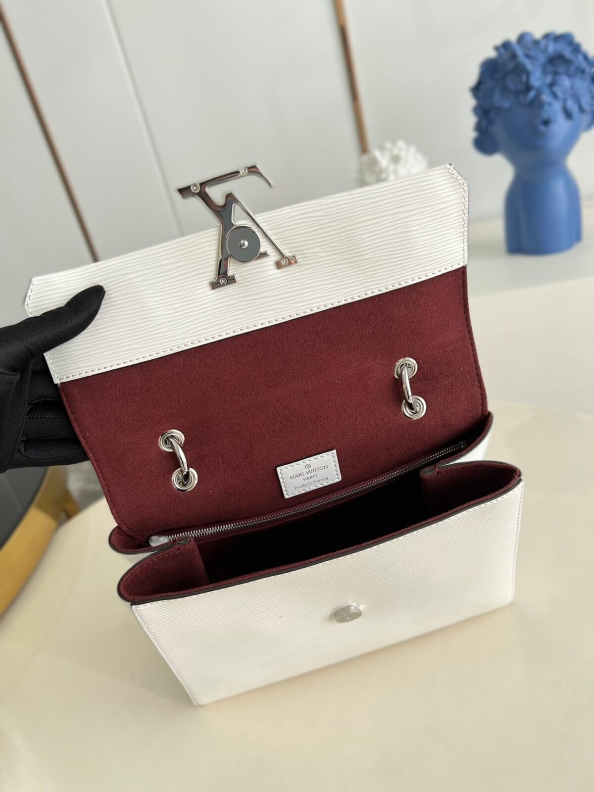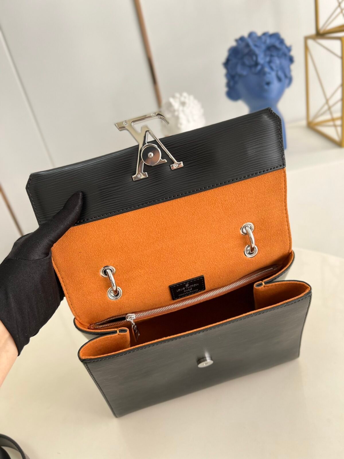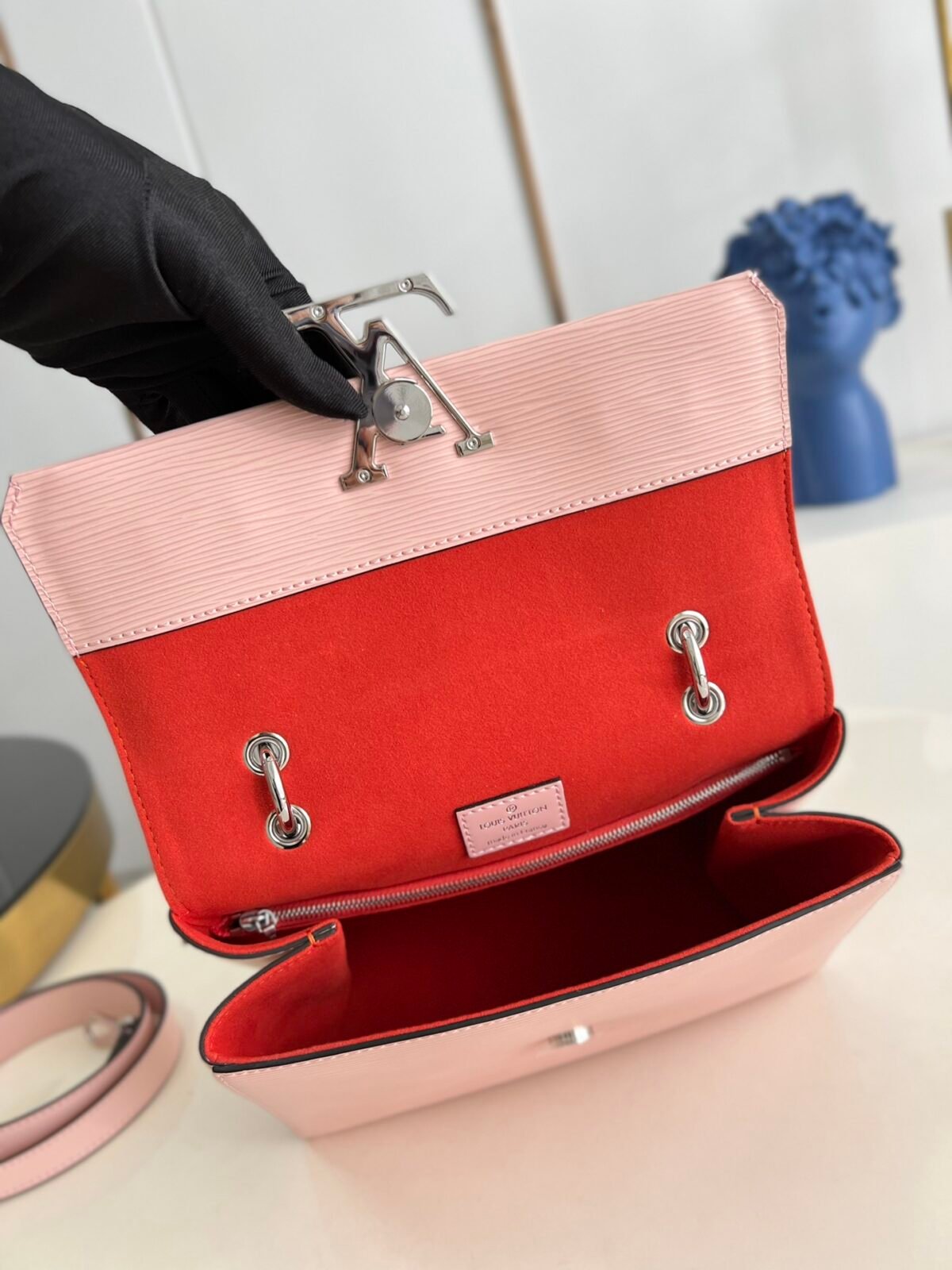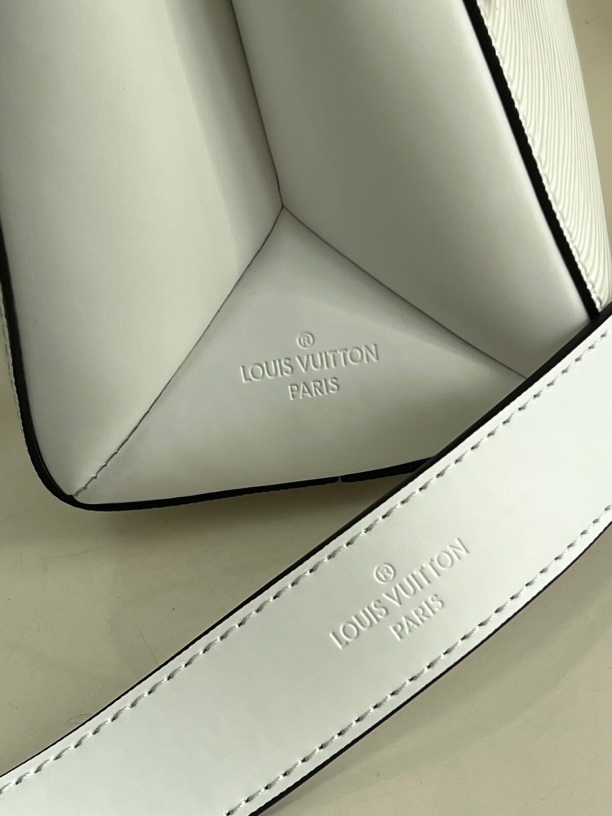 Key Features: Prominent oversized tonal LV signature logo, structured angular silhouette, elegant smooth leather top handle, matching leather luggage tag, fully detachable long leather shoulder strap for versatile wear.
