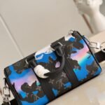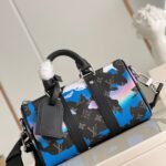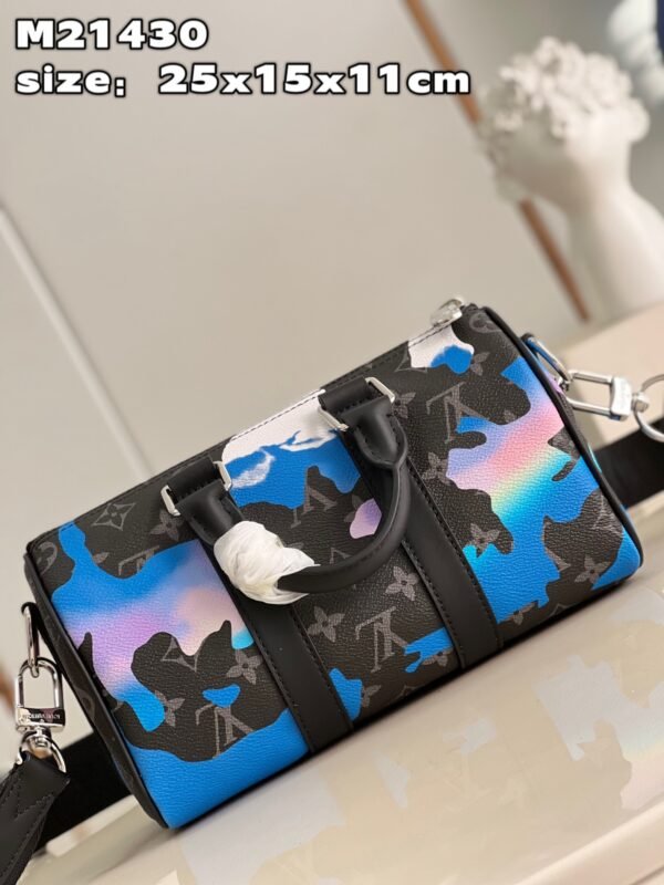 A Poetic Horizon of Freedom and Light Embrace the spirit of artistic travel with the Louis Vuitton Keepall Bandoulière 25 from the exclusive 2022 “Room with a View” Holiday Collection. This limited-edition piece reinterprets the masculine Monogram Eclipse canvas as a canvas for a stunning sunrise. The design features a vibrant, swirling interplay of light and shadow, with dreamy blue and purple clouds that artfully form the iconic LV initials—a symbol of infinite hope and the beauty of a new day.