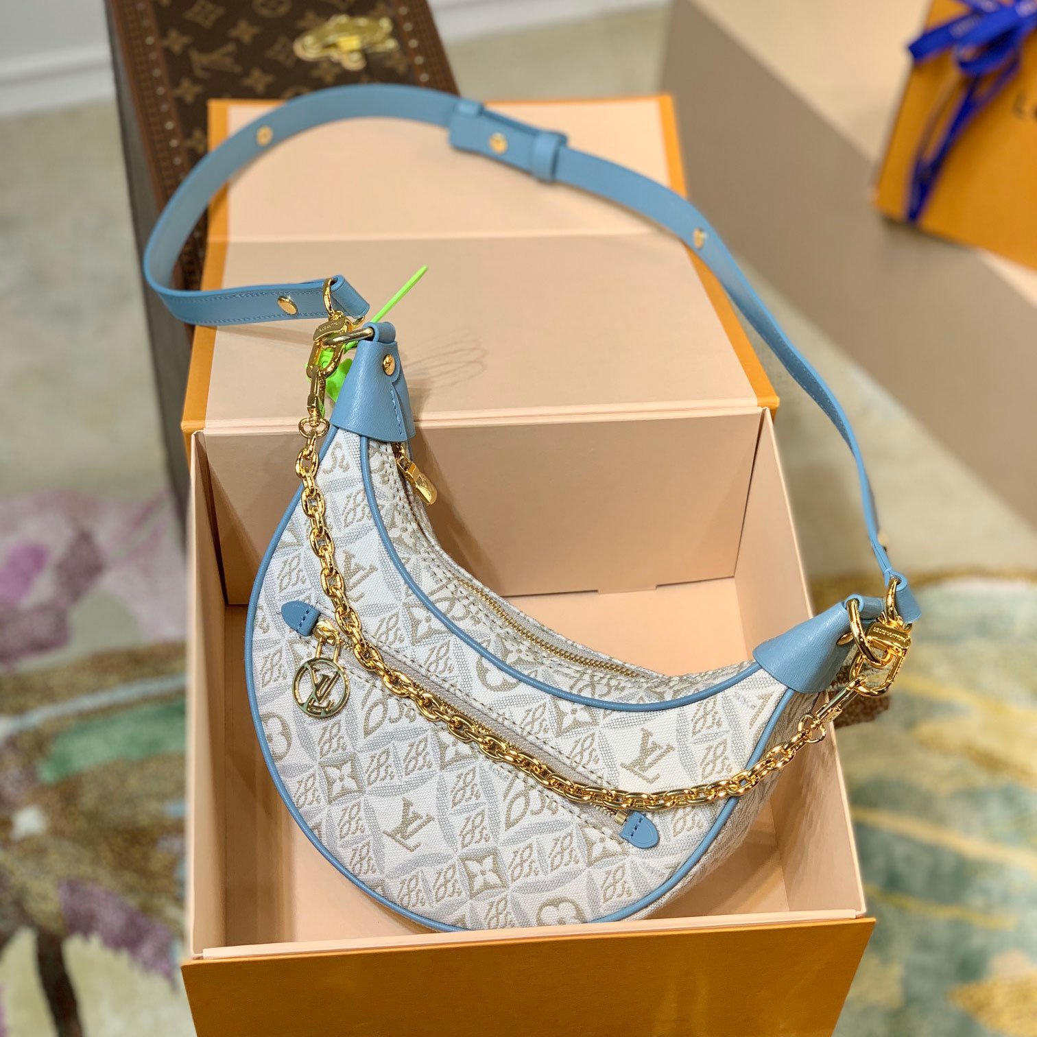 • Key Features: Trendy half-moon/crescent silhouette, front zip pocket with a circular LV logo pull, detachable gold-tone chunky chain, fully detachable leather shoulder strap.