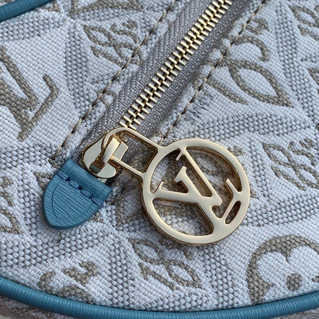 Masterfully crafted from the house’s exclusive “Since 1854” jacquard textile, the intricate woven pattern pays beautiful homage to the year Louis Vuitton was founded. This elegant grey and white textile body is brilliantly framed by fresh, light blue leather trim and features an easily accessible front zipper pocket, perfectly accented with a gleaming gold-tone circular LV signature pull.