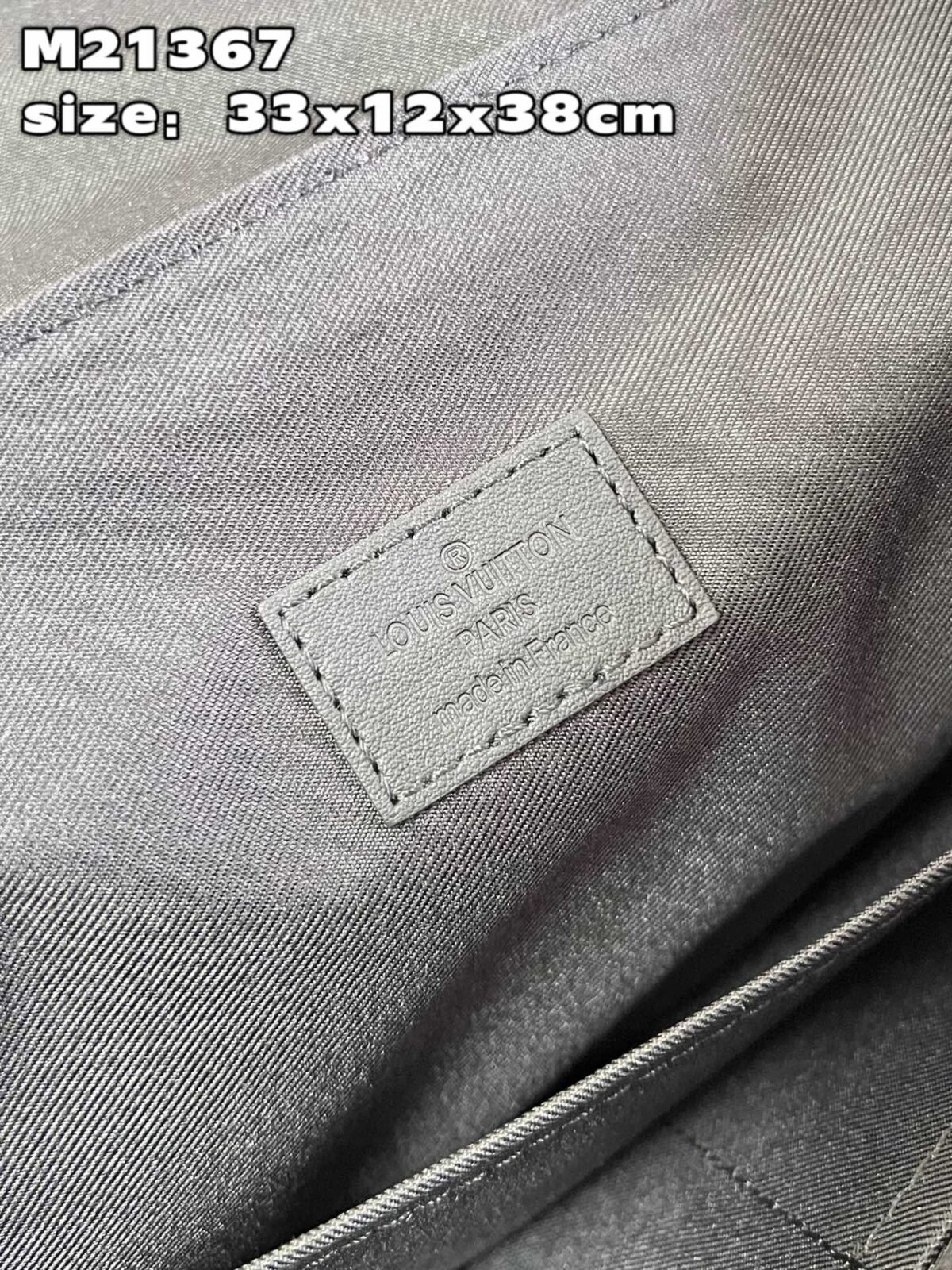 Key Features: Magnetic flap closure, large main compartment, front zipped exterior pocket, matte-black LV signature initials, adjustable textile shoulder straps, top leather handle.