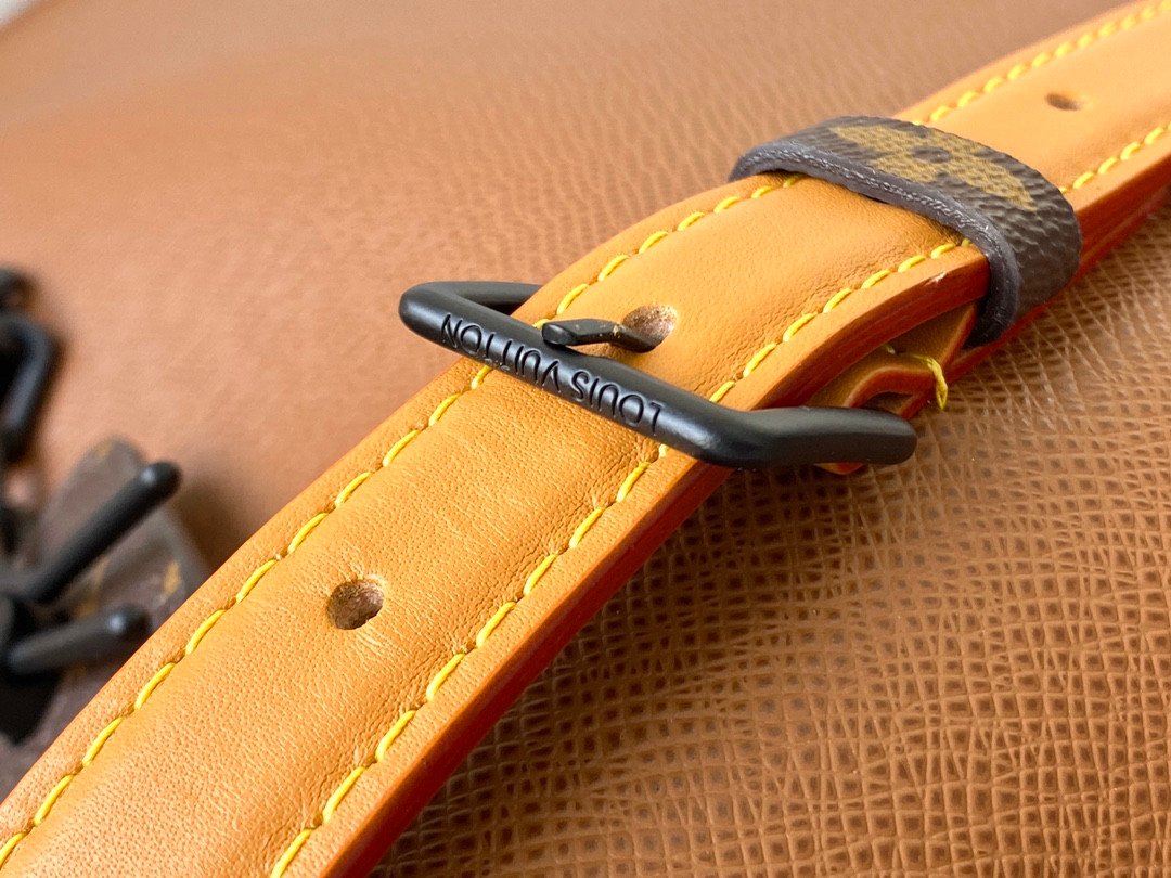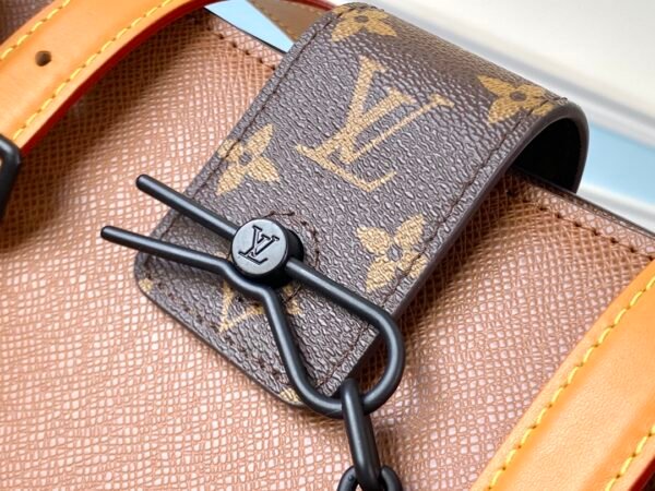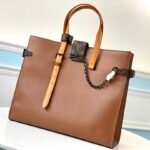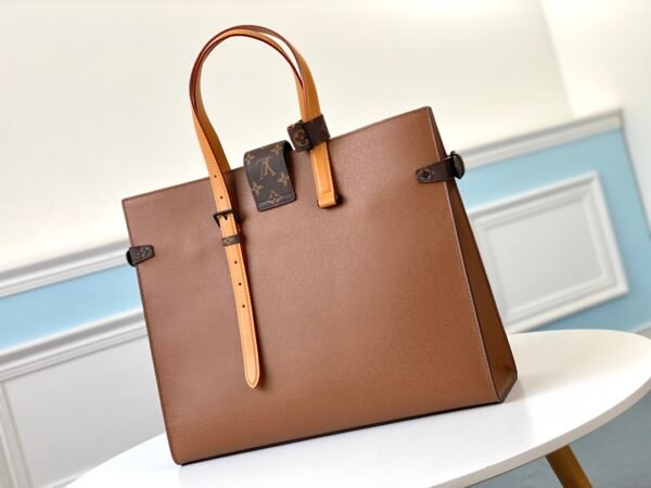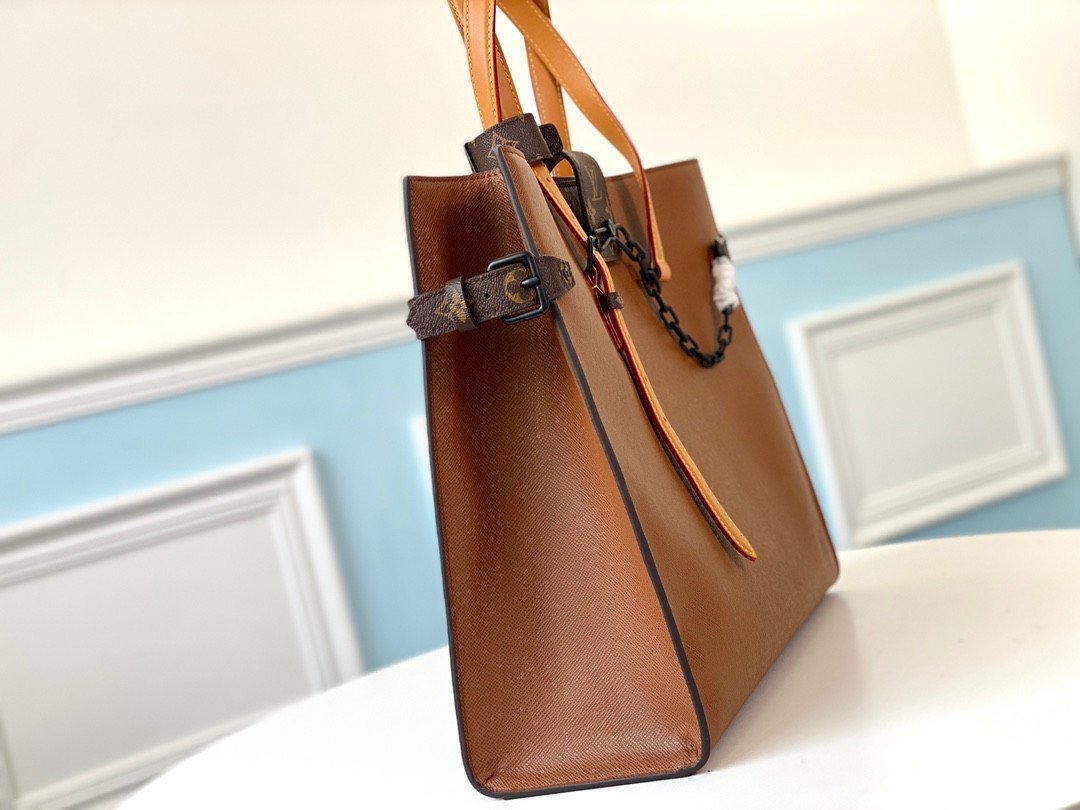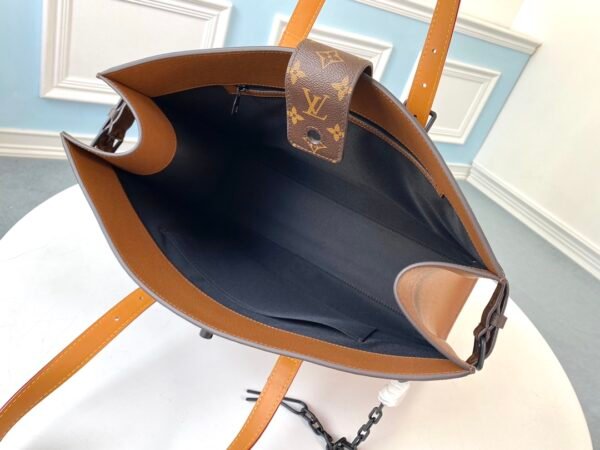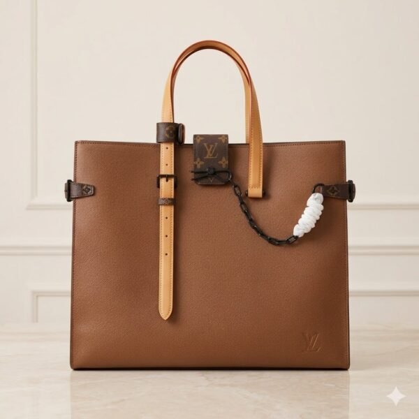 Executive Design & Artistic Accents This tote masterfully balances mature professionalism with contemporary flair. The rich tan Taïga leather is tastefully accented by Monogram canvas details on the straps and trim. The standout feature is the industrial-inspired matte black chain and buckle assembly, providing a rugged yet refined focal point. Whether paired with a sharp formal suit or high-end casual wear, this bag commands a powerful presence that easily outshines smaller, less functional accessories.