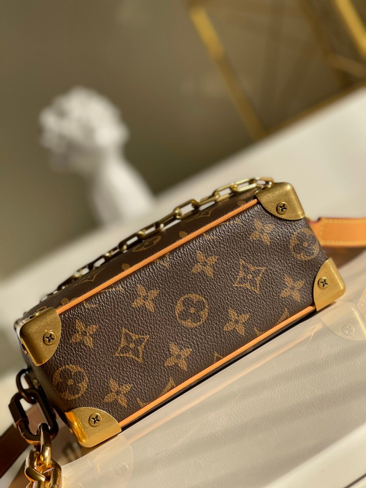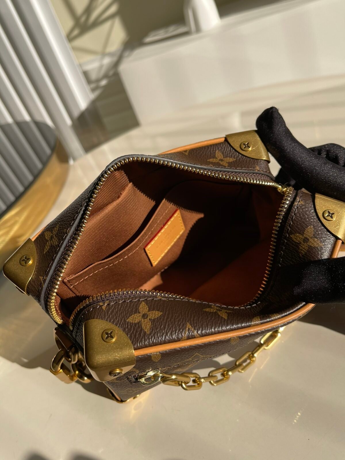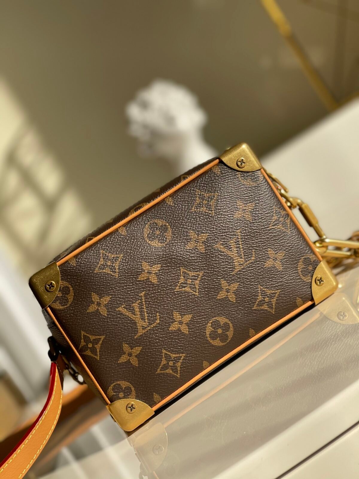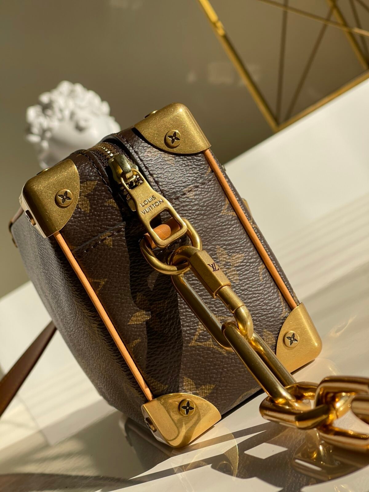 Heritage Trunk DNA Meets Modern Edge This compact crossbody masterfully blends the Maison’s historic trunk-making heritage with contemporary urban fashion. Crafted from the iconic brown Monogram coated canvas, it features contrasting tan cowhide leather piping and a structured, boxy silhouette. The true standout details are the reinforced metallic corners and the signature matte gold-tone hardware, which give the bag its distinctive, rugged-yet-luxurious industrial vibe.