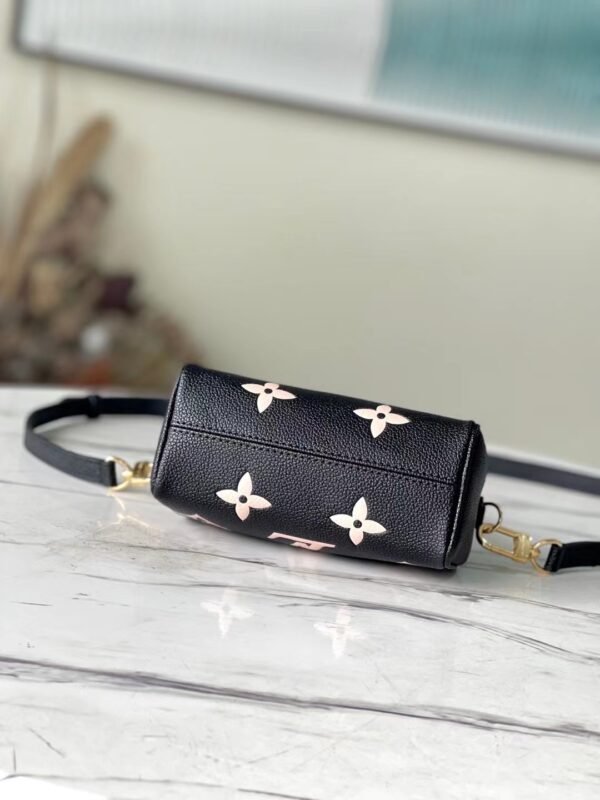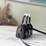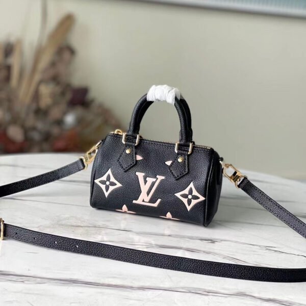 The Nano Speedy is a flawless, miniature replica of Louis Vuitton’s iconic Speedy “pillow bag,” radiating ultimate feminine charm. Moving beyond the classic canvas, this specific high-end edition is exquisitely crafted from supple, full-grain leather. It makes a bold statement with a deeply embossed and meticulously silk-screened oversized Monogram motif in a striking, soft pinkish-cream against a sleek black backdrop.