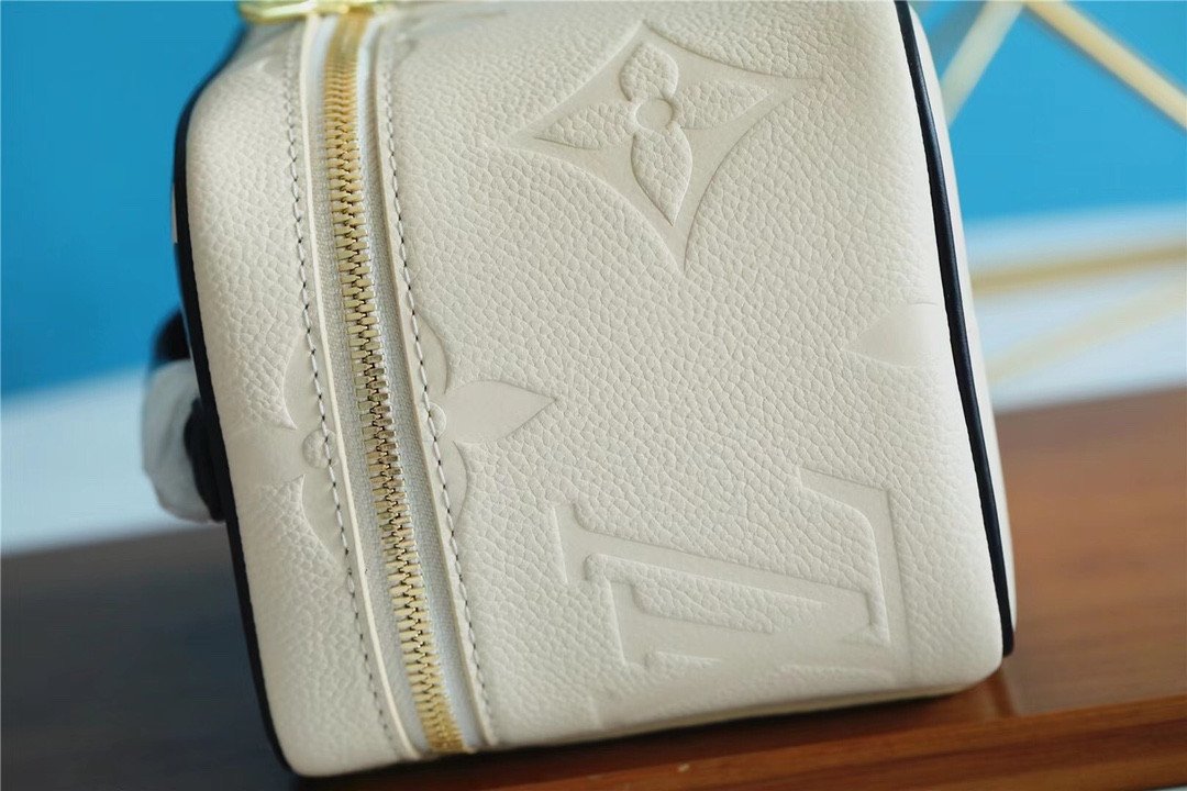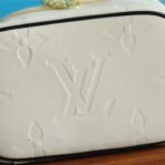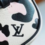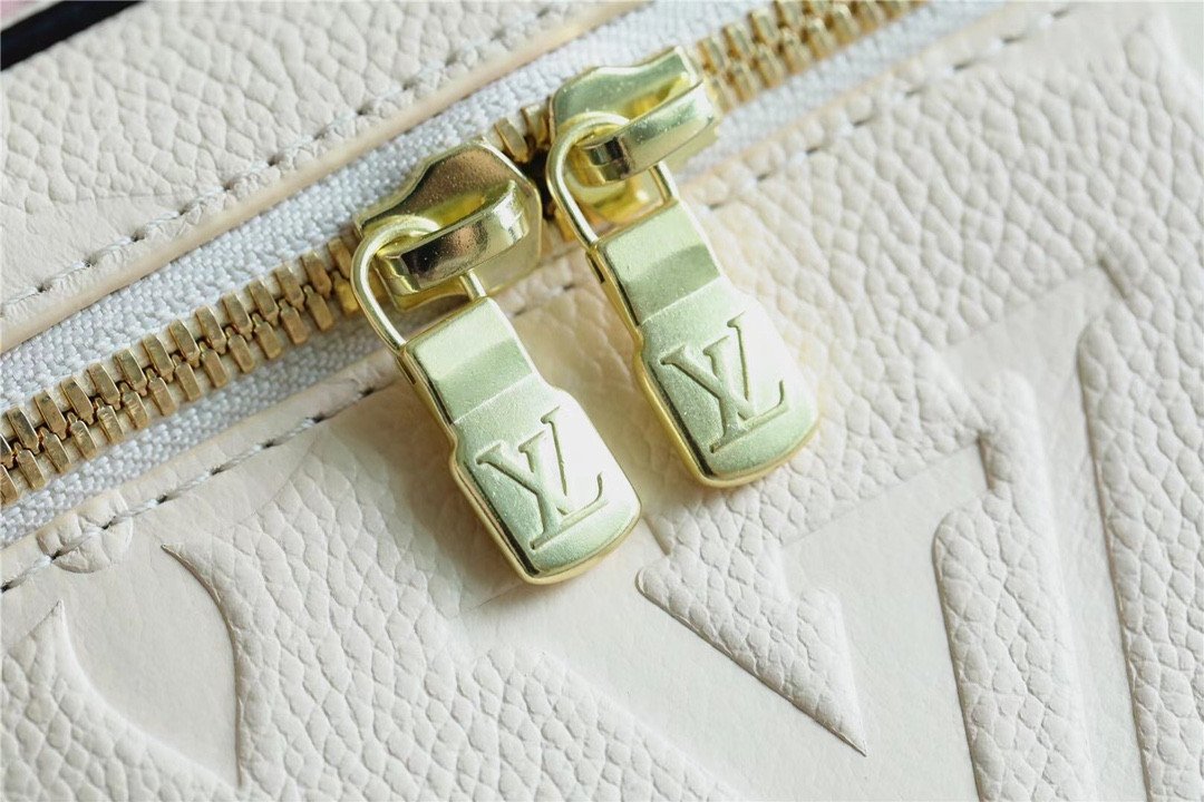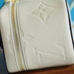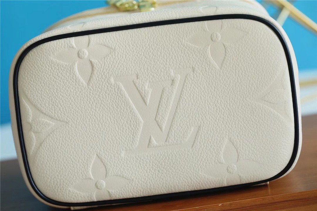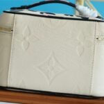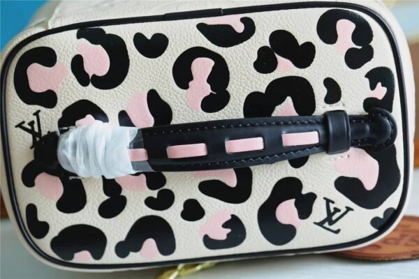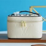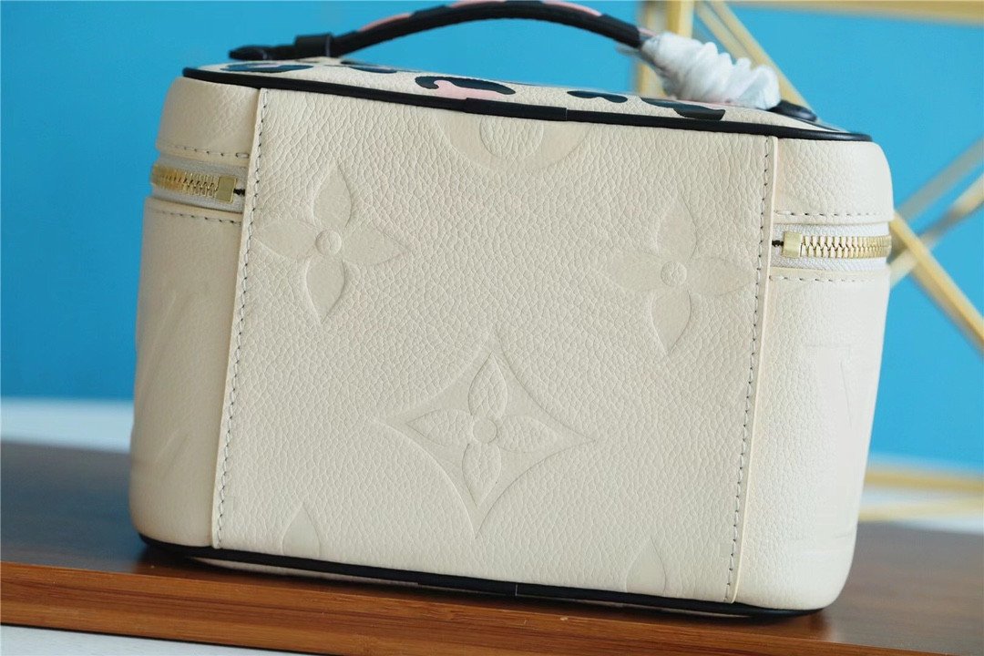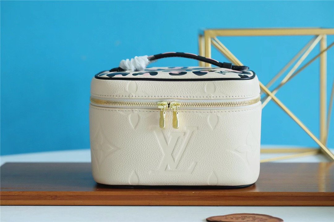 The body is crafted from cream-colored Monogram Empreinte leather, featuring an elegant, oversized embossed LV pattern. In a striking contrast, the top lid and handle are adorned with a vibrant, silk-screened leopard print, adding a touch of untamed sophistication. Compact yet functional, it is designed to store your beauty essentials in style, whether tucked into a travel bag or displayed on your vanity. The piece is finished with gleaming gold-tone hardware and signature LV-engraved zipper pulls.