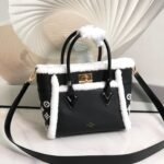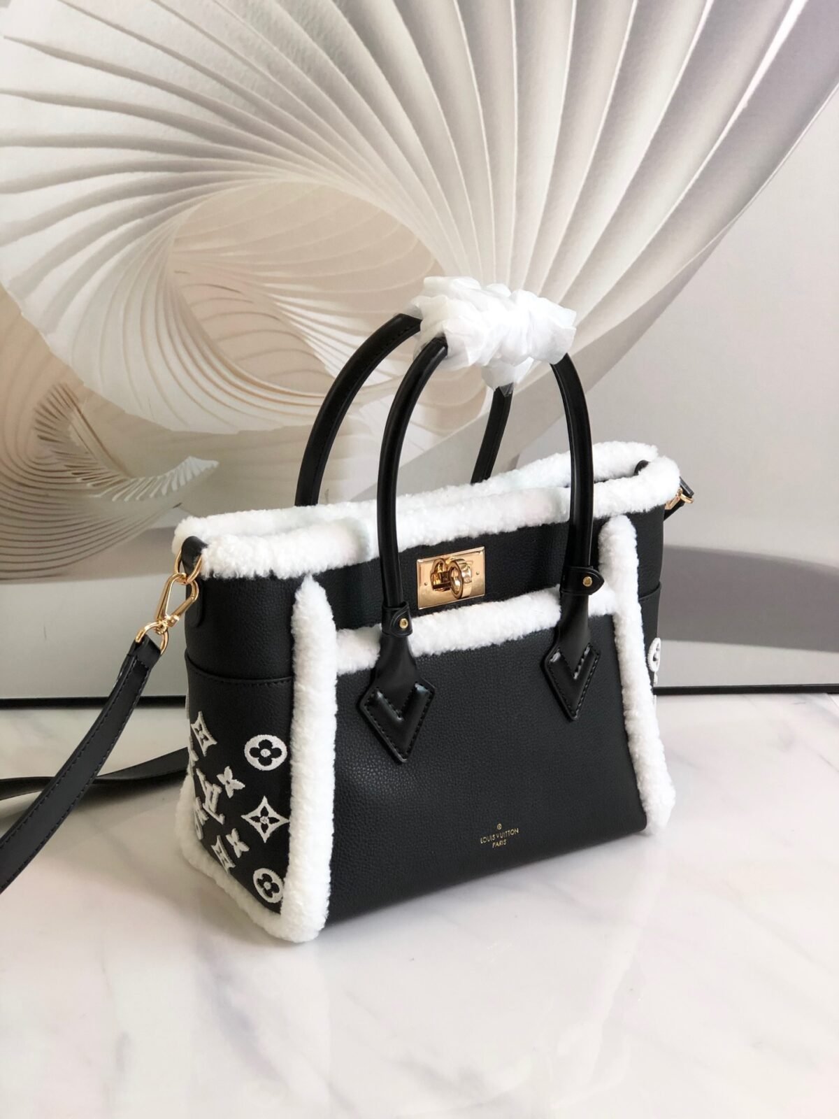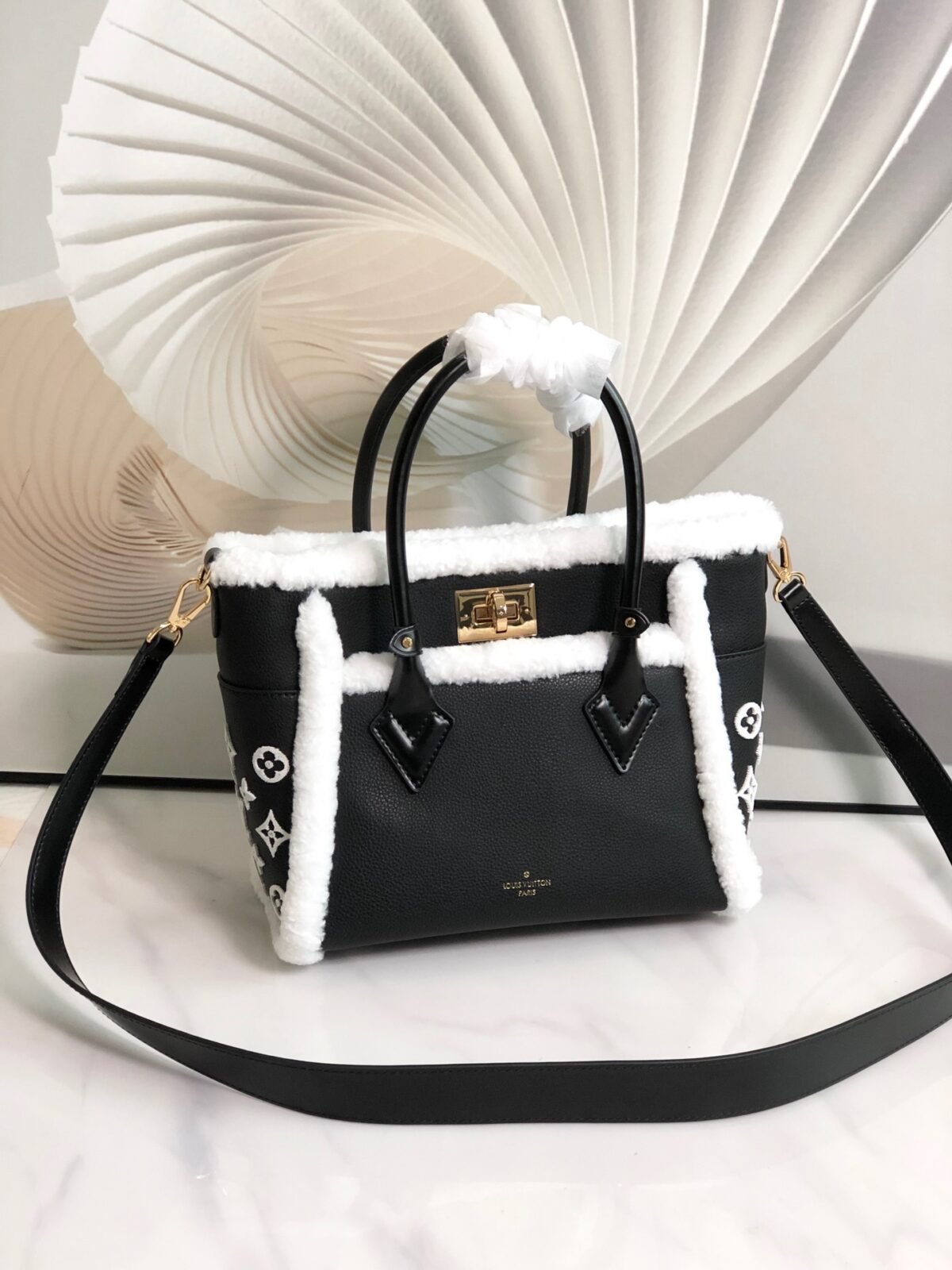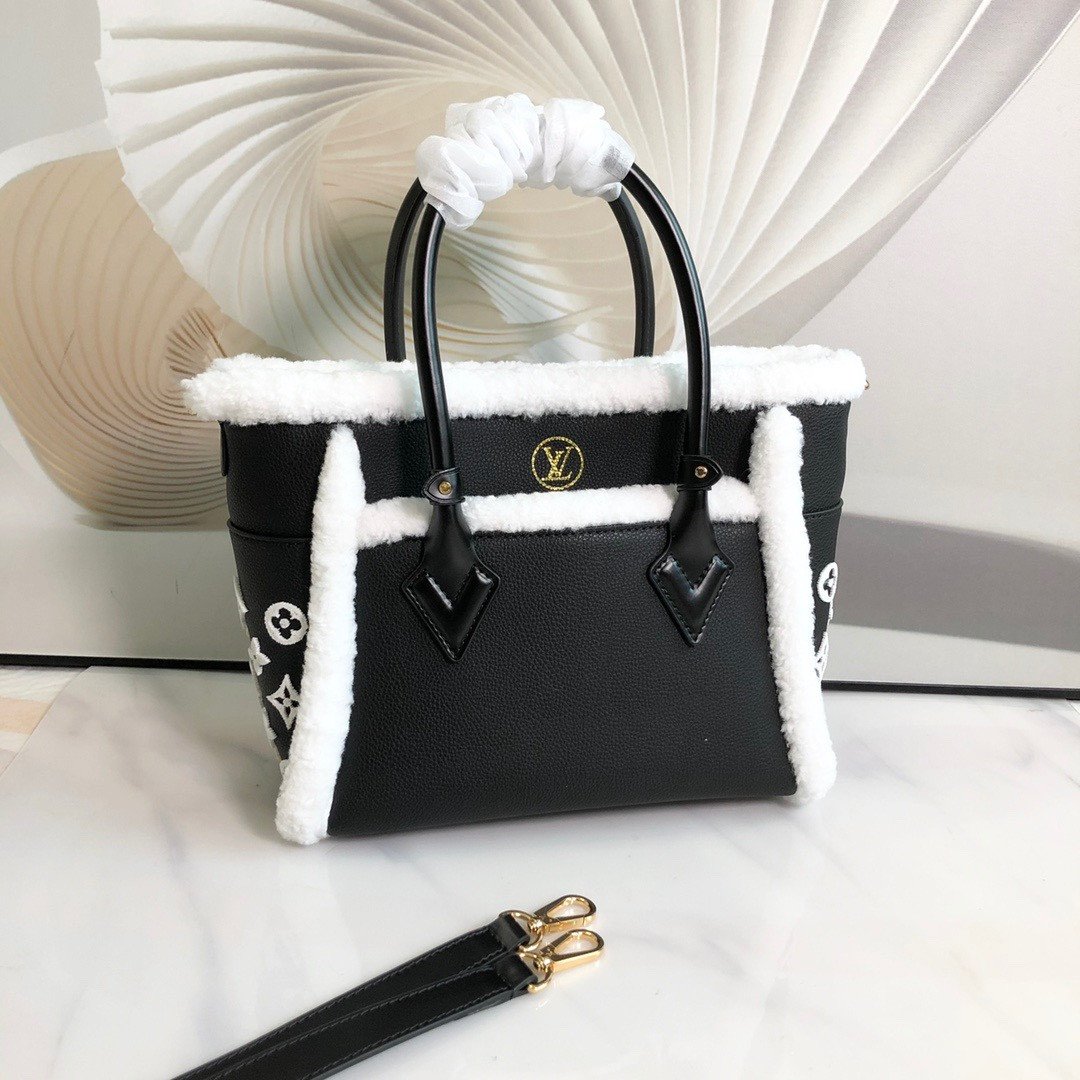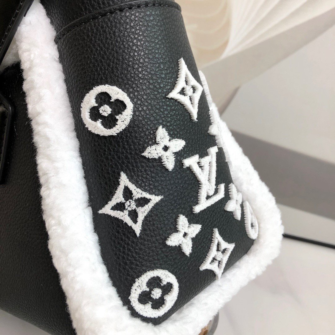 Key Features: Winter-ready fluffy shearling trim, tactile tufted Monogram side panels, dual leather top handles, and a detachable leather shoulder strap for multiple carrying options.