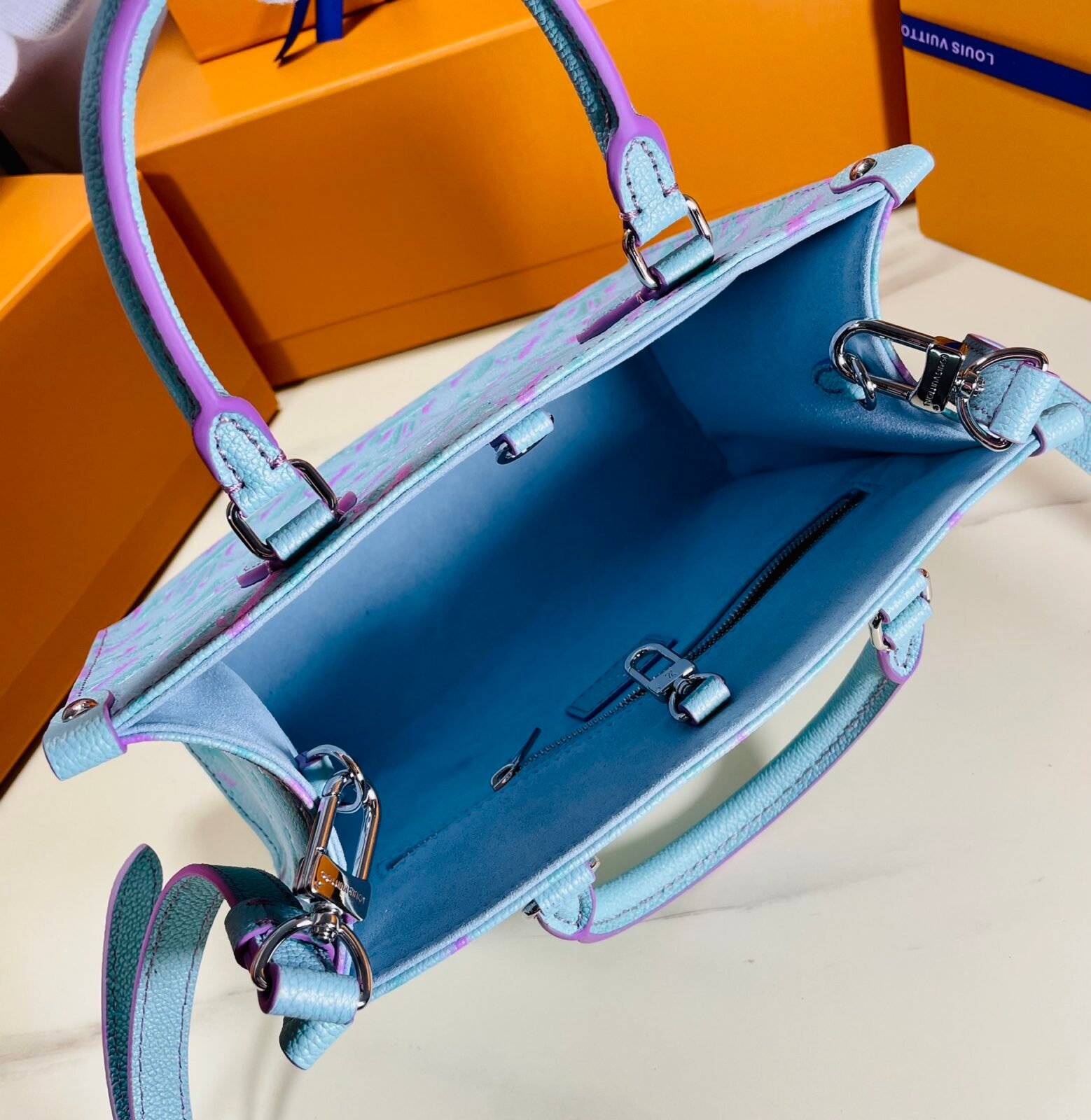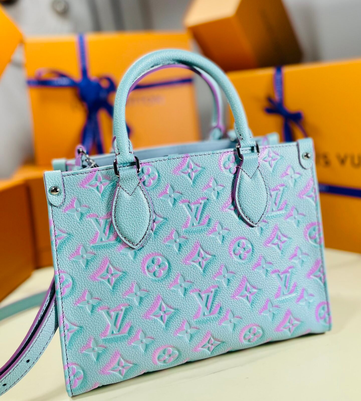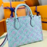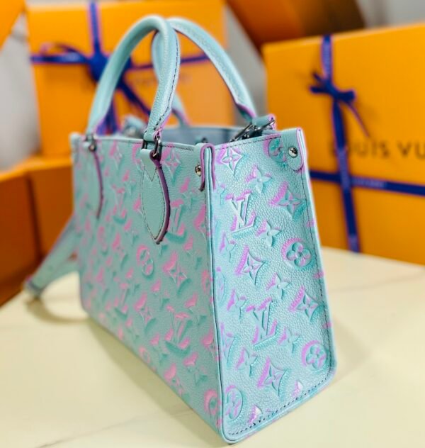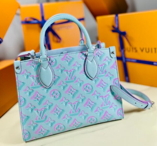 A Splash of Springtime Joy Celebrate the vibrant energy of the Spring/Summer season with this striking edition of the Louis Vuitton Onthego PM tote. This special release breathes fresh life into the Maison’s signature aesthetics, featuring a breathtaking pastel gradient. The luminous aqua-blue base is deeply embossed with the oversized Monogram Giant motif, beautifully highlighted in a shifting pink and purple gradient that perfectly captures the joy of sunny days.
