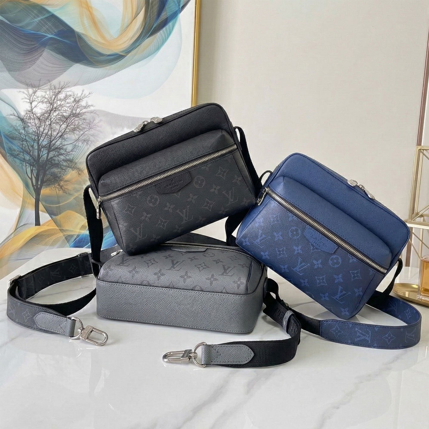 The bag showcases the iconic LV Monogram pattern elegantly integrated into a textured finish. It features a spacious main compartment alongside a convenient front zippered pocket for quick access to your essentials. Complete with a wide, adjustable shoulder strap, it ensures comfortable all-day wear. To suit your personal style, this model is available in three striking colorways: a sleek Silver/Grey, a classic stealthy Black, and a bold, vibrant Blue.