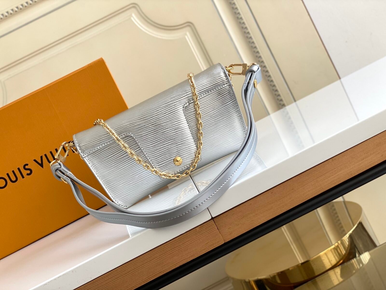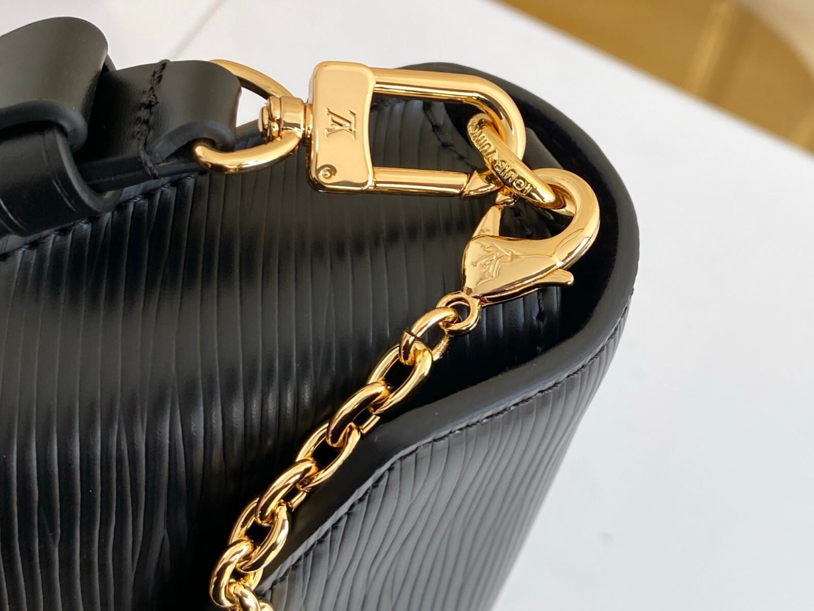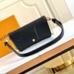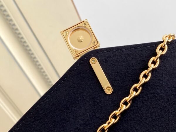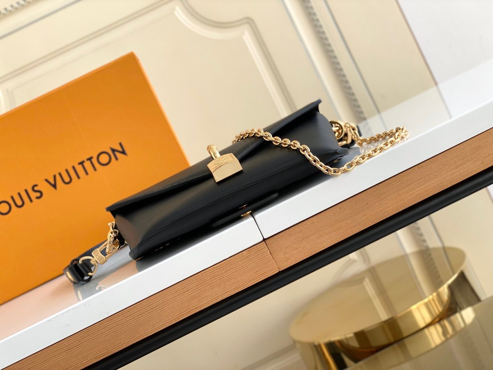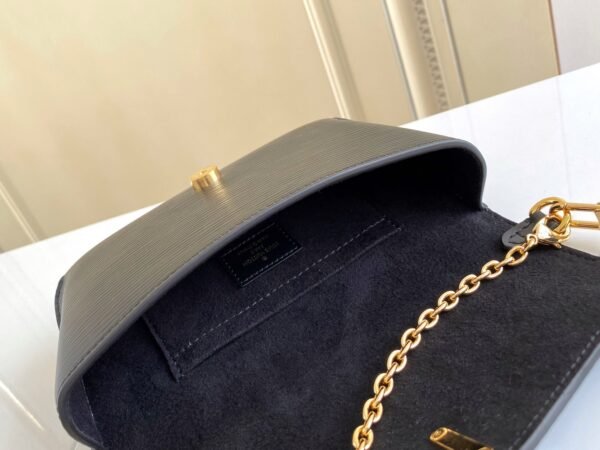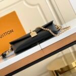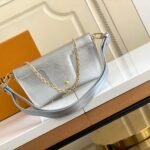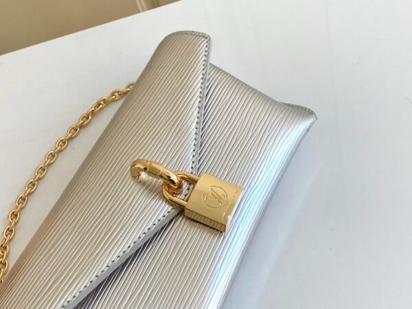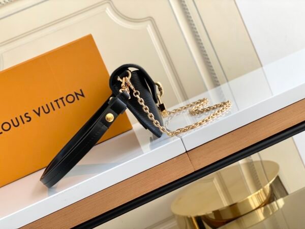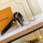 The bag is secured by a secure magnetic closure, elegantly highlighted by a signature gold-tone padlock engraved with the iconic LV logo. Designed for ultimate adaptability, the bag features a clever belt loop on the back, alongside a removable golden chain and a detachable, adjustable leather shoulder strap. This allows you to effortlessly transition between shoulder carry, crossbody wear, or even attaching it to a belt.