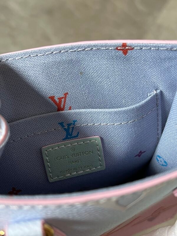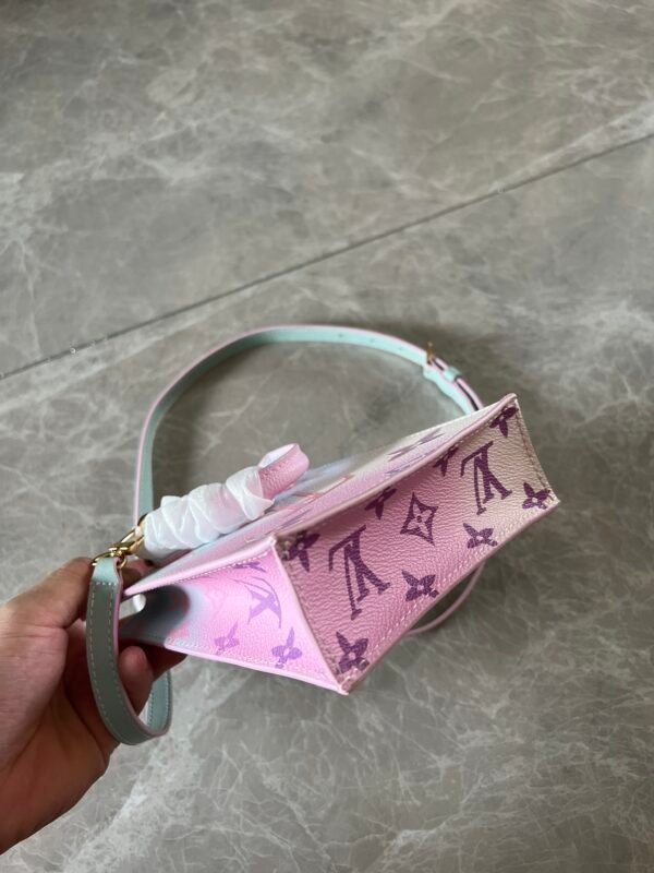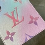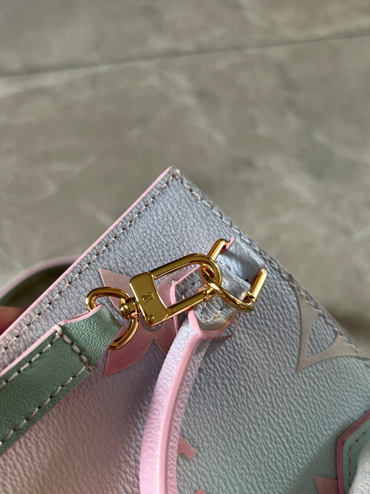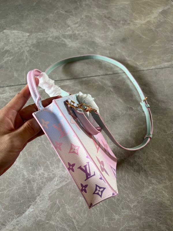 Key Features: Sunrise pastel gradient print, oversized Monogram motif, double top handles, removable and adjustable leather shoulder strap.