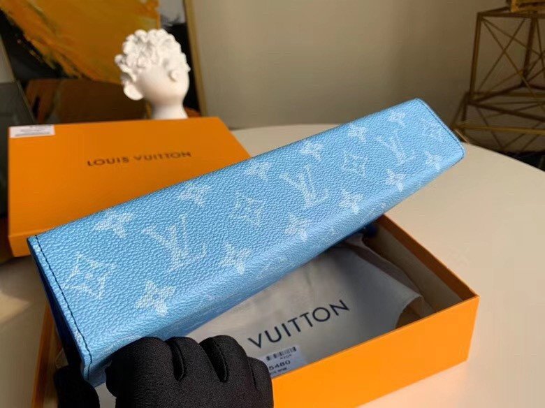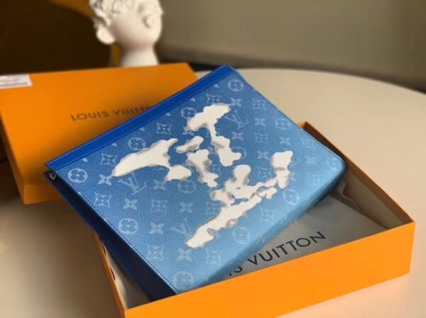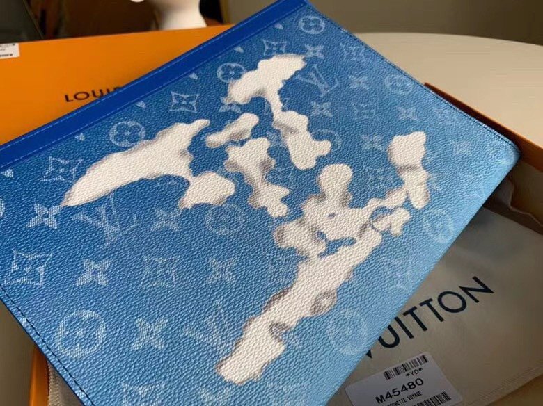 Step into the visionary world of Virgil Abloh with this highly collectible Pochette Voyage, beautifully reimagined for the Autumn/Winter collection. This exceptional statement piece fully embraces a dreamlike “Clouds” theme, showcasing ethereal, cloud-shaped LV initials floating across a stunning, sky-blue Monogram canvas background.