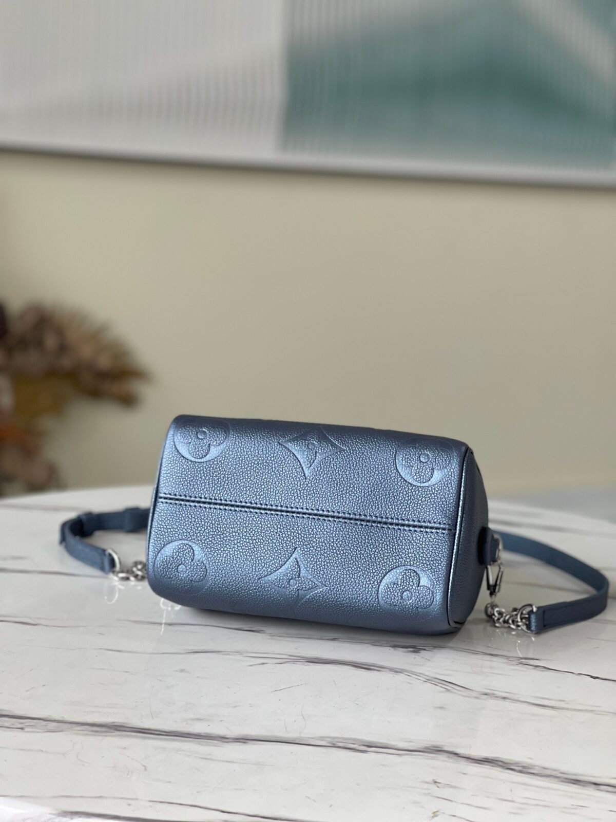 Pearlescent Blue: A shimmering, metallic finish that catches the light beautifully, paired with elegant silver-tone hardware.