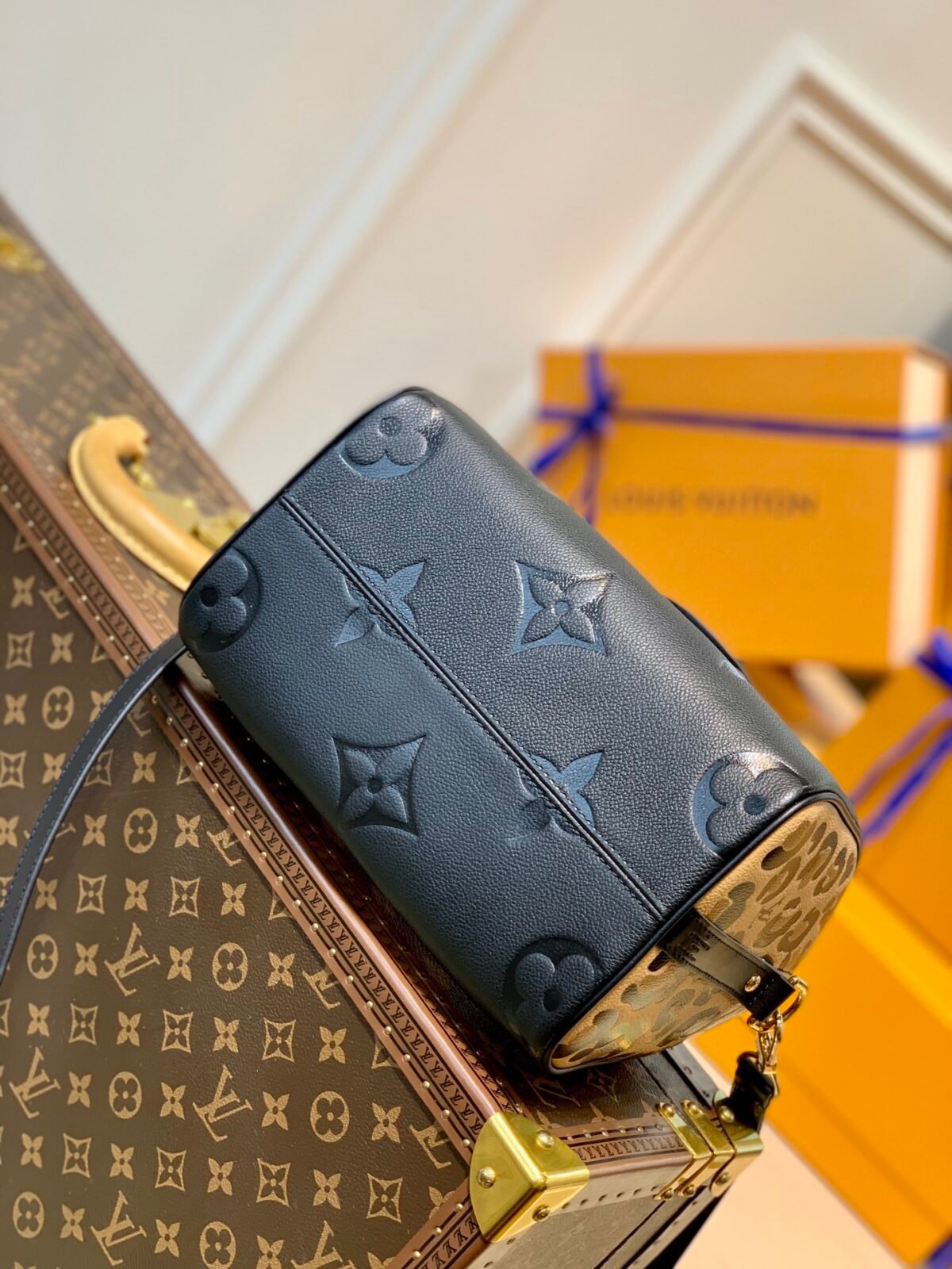 The bag is masterfully crafted from supple Monogram Empreinte leather, featuring oversized, deeply embossed LV initials and Monogram flowers that make an instant statement. The sleek front and back panels are beautifully contrasted by striking animal/leopard print detailing on the side gussets, perfectly capturing the adventurous spirit of the collection.