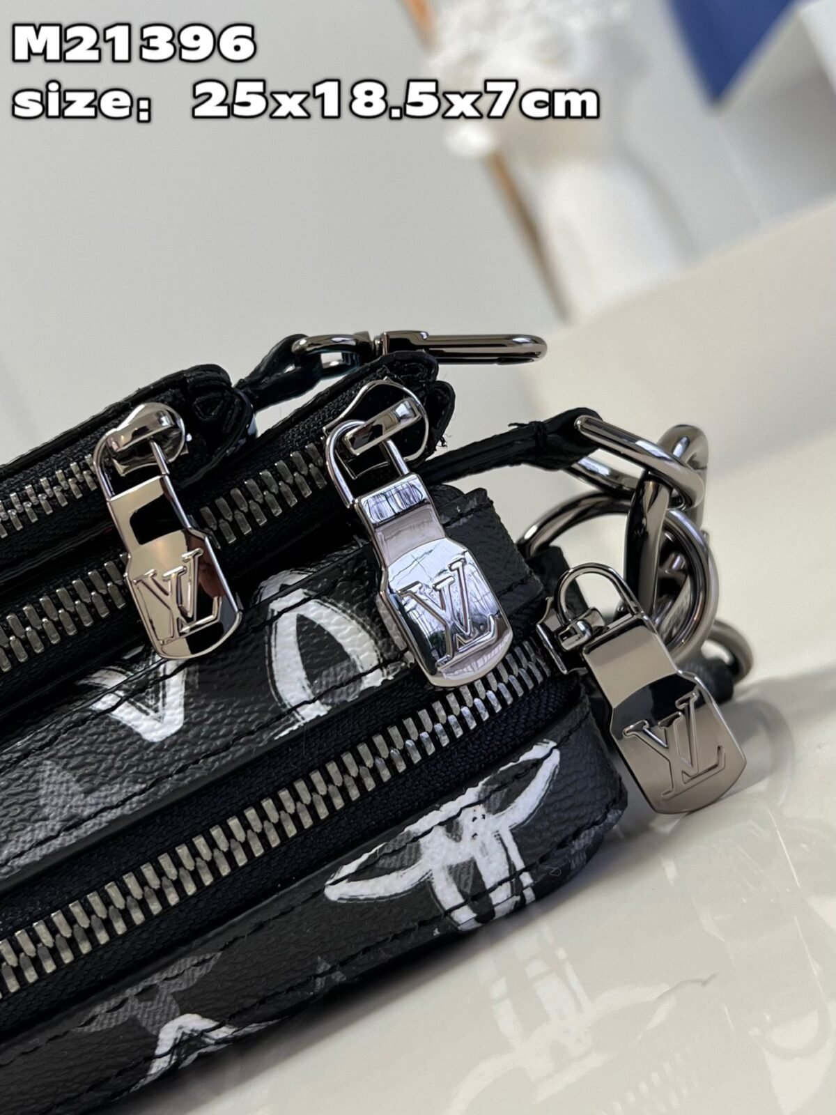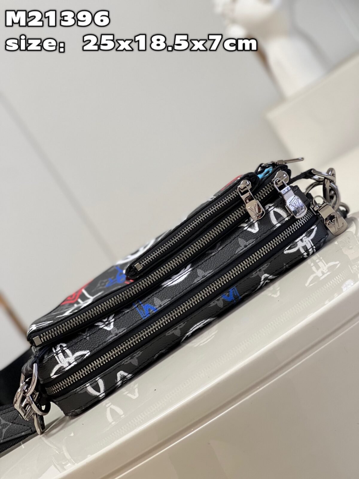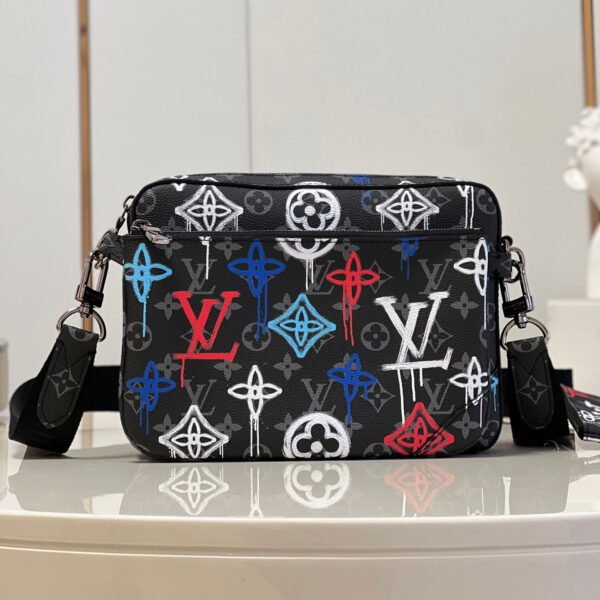 A Vibrant Masterpiece of Street Luxury Redefine your urban style with the Louis Vuitton Trio Messenger. This avant-garde edition takes the masculine Monogram Eclipse canvas and transforms it into a canvas for street art. Featuring a dynamic, multicolor spray-paint effect, the iconic LV initials and Monogram flowers appear as if freshly tagged by a graffiti artist. It is the perfect statement piece for the modern man who lives at the intersection of high fashion and underground culture.