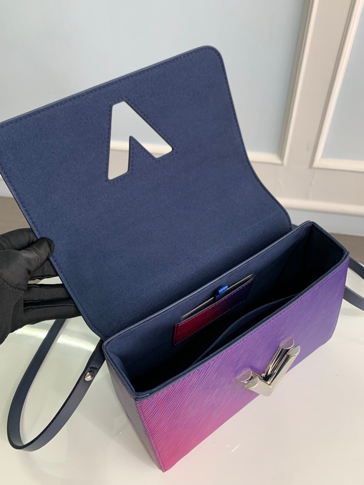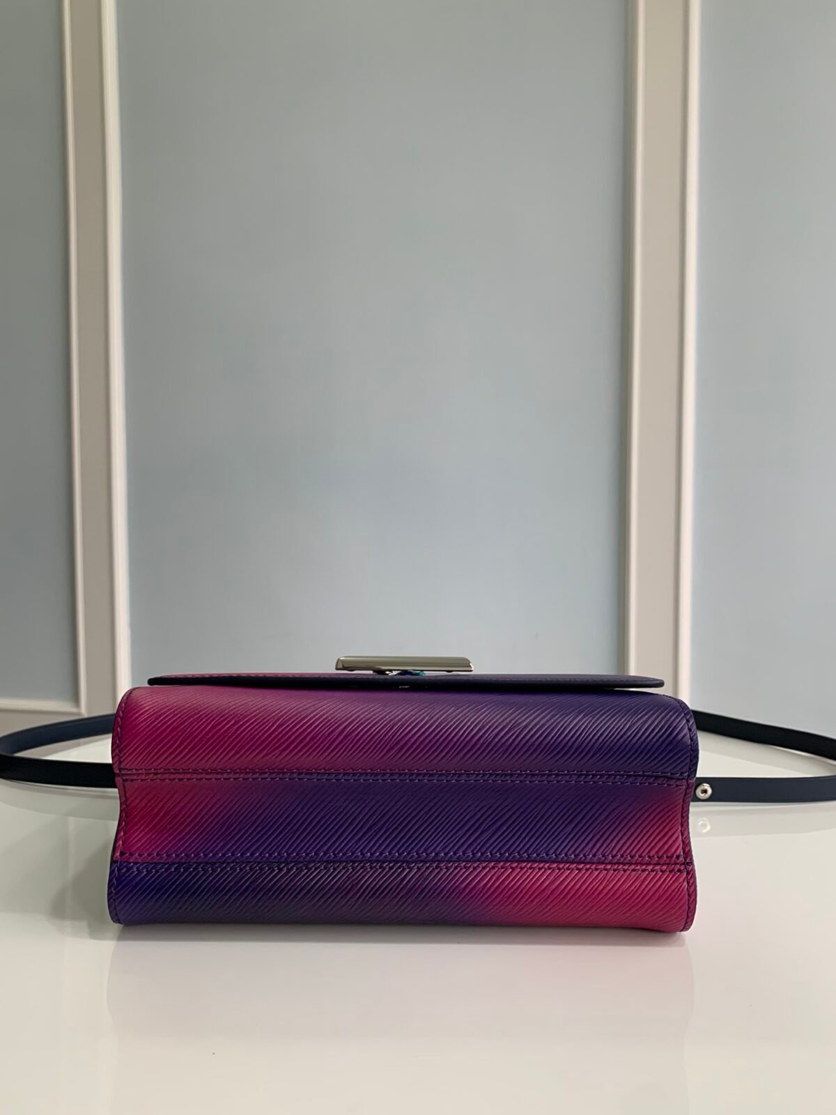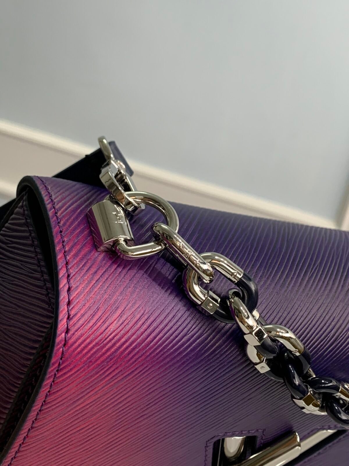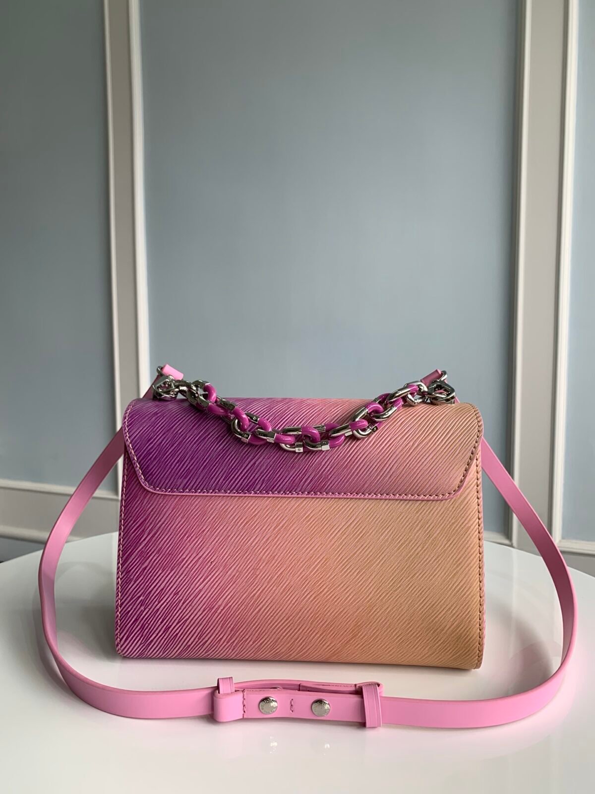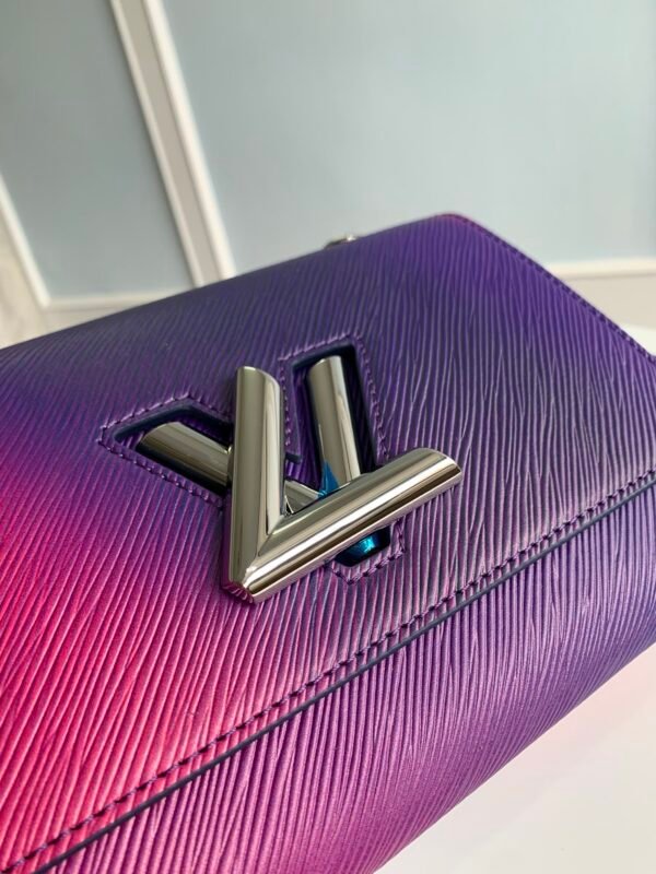 Key Features: Breathtaking gradient finish, sculptural transforming LV Twist lock with iridescent shine, chunky metallic chain, detachable and fully adjustable leather shoulder strap.