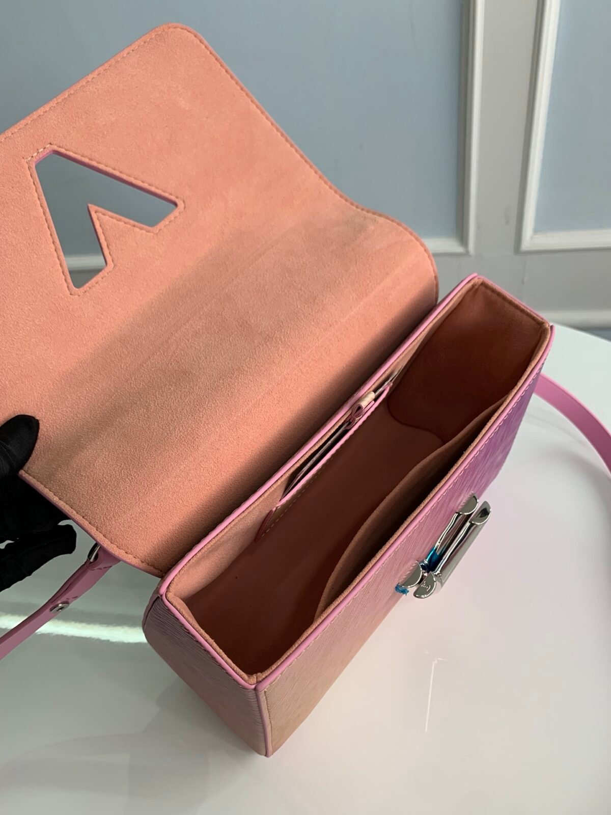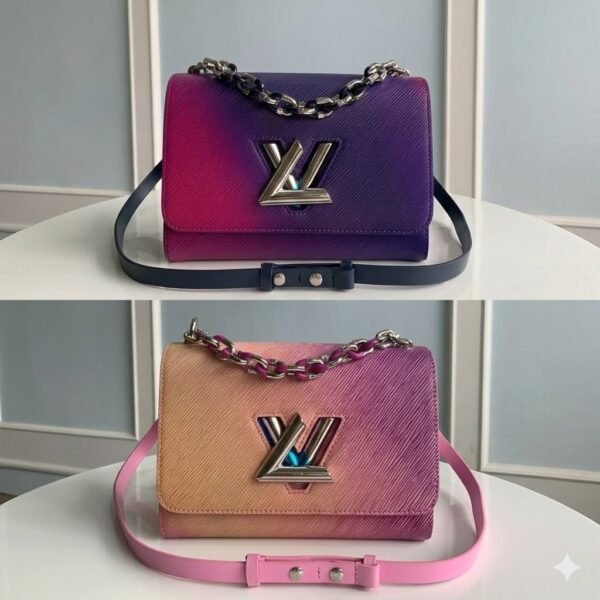 The visual centerpiece of this design is the iconic, sculptural LV Twist lock resting on the front flap, which boasts a dazzling, iridescent metallic luster that perfectly complements the bag’s vibrant tones. Adding an edgy touch, the bag features a chunky, color-coordinated metallic chain for a glamorous short-shoulder carry. Designed for ultimate versatility, it also includes a fully detachable and adjustable leather shoulder strap, allowing you to effortlessly “unlock” multiple carrying styles, including a comfortable, hands-free crossbody look.