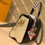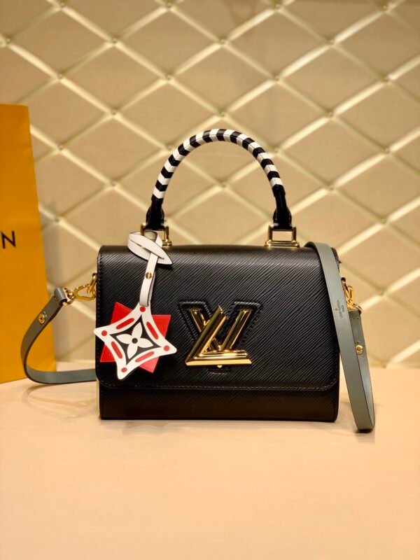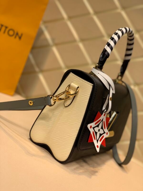 The centerpiece of this stunning design is the gleaming gold-tone LV Twist sculptural lock, which seamlessly secures your belongings with a satisfying turn. This specific edition is brilliantly elevated by a chic black-and-white striped leather top handle, alongside an oversized, vibrant Monogram Flower leather bag charm and name tag that adds a striking pop of colorful energy. Designed for ultimate daily versatility, it comes equipped with a fully detachable, contrasting leather shoulder strap, allowing you to effortlessly transition from a sophisticated hand-carry to a comfortable shoulder or crossbody drape.