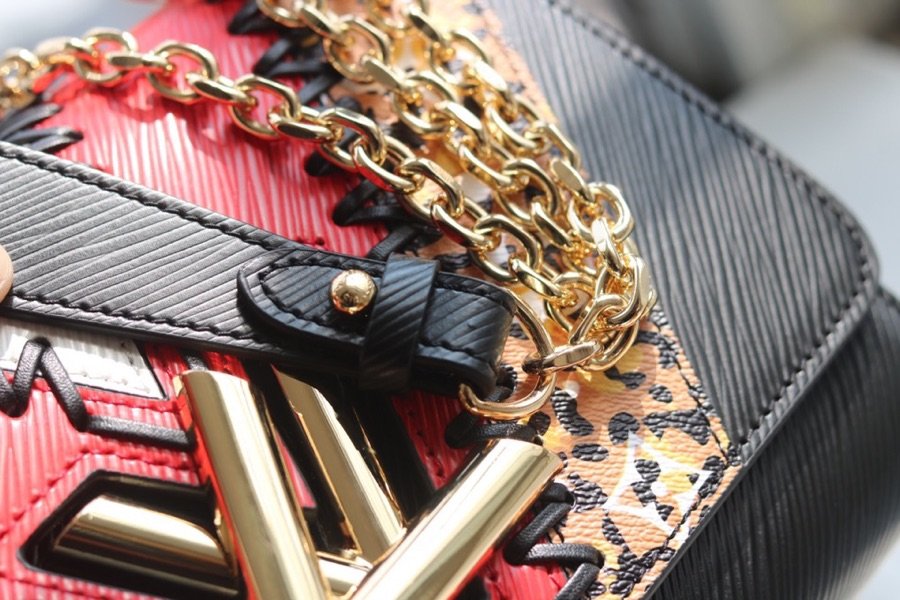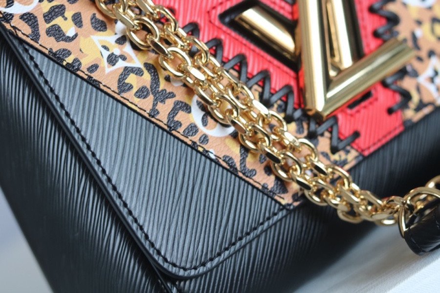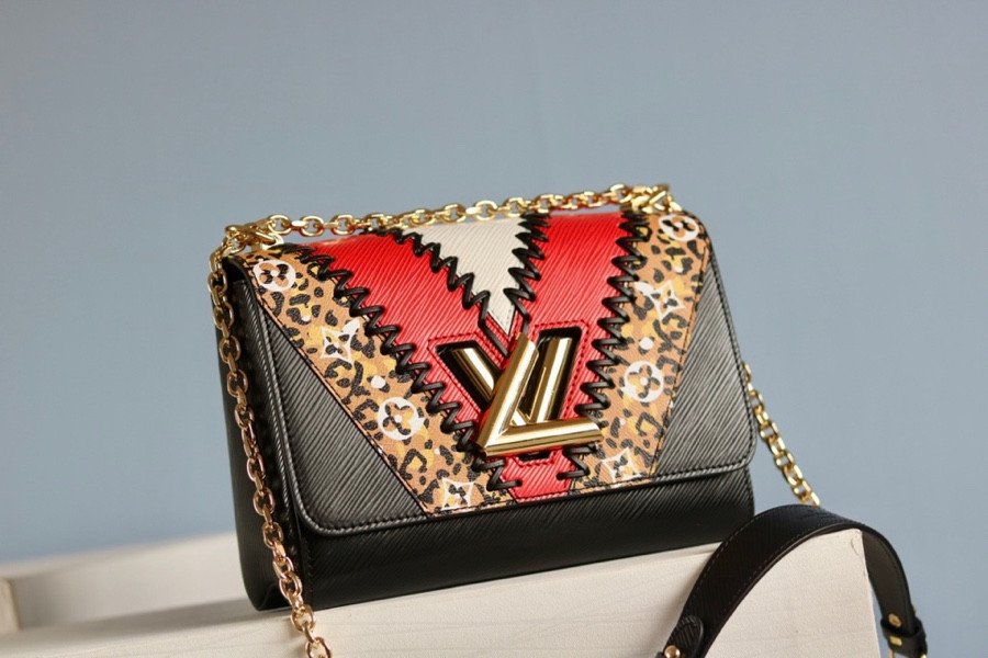 Make a bold statement with the Twist Medium (MM) Handbag from the exclusive Jungle Series. This striking piece features an eye-catching collision of black, red, and white Epi leather, beautifully contrasted with a fierce animal print Monogram canvas.