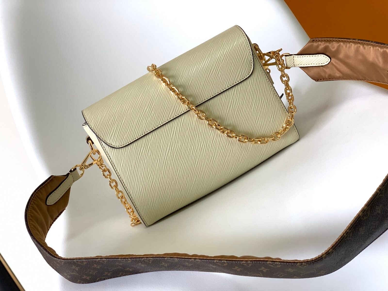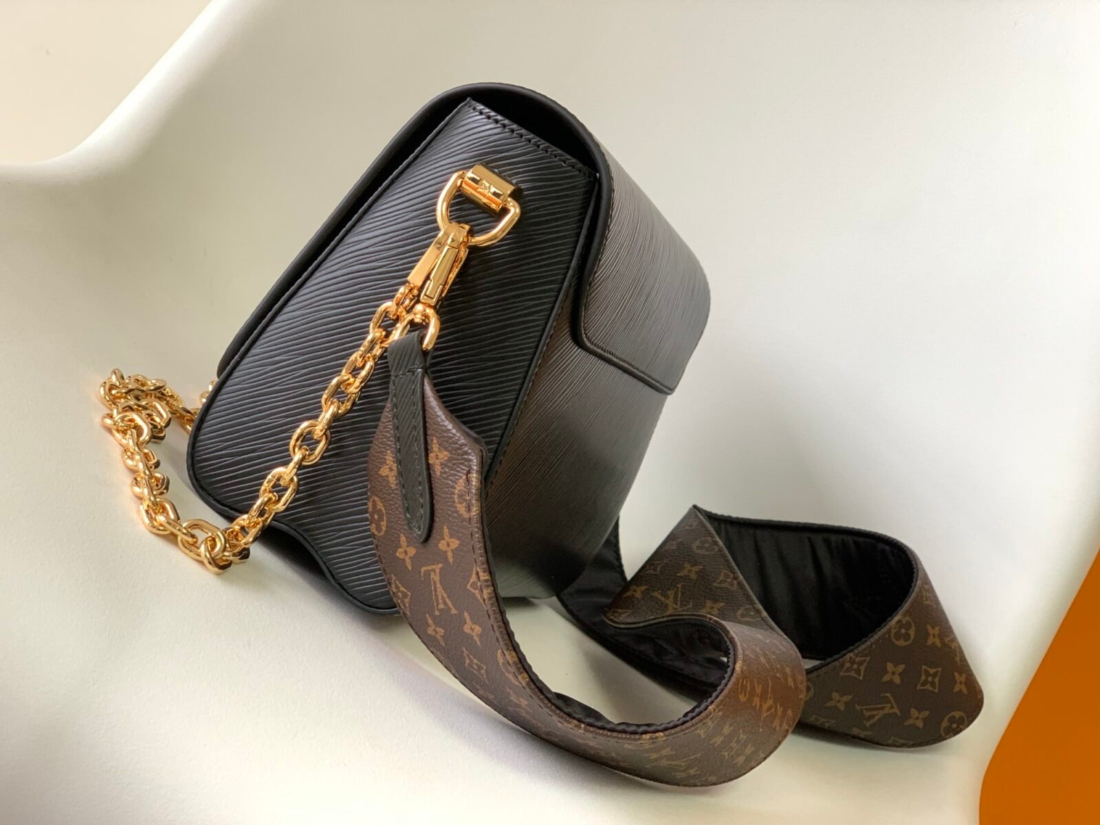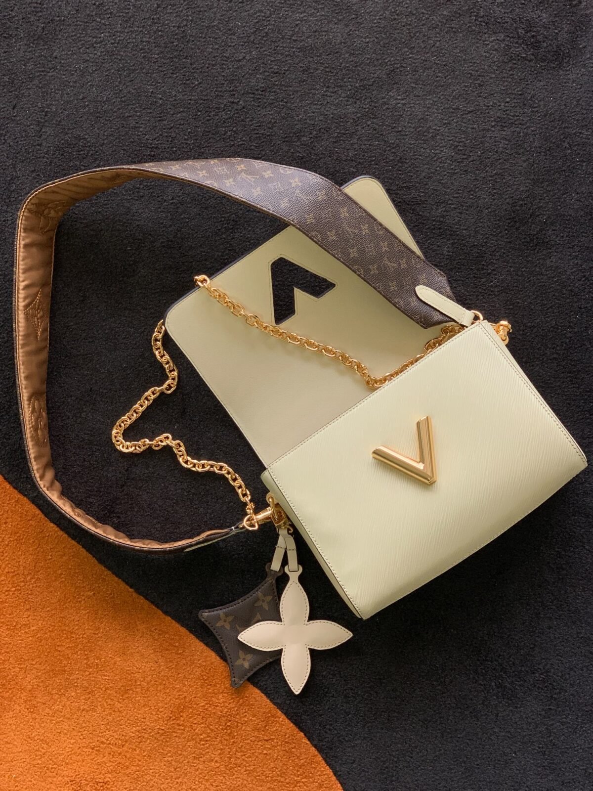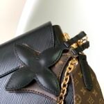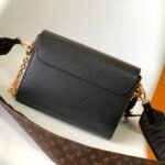 The centerpiece of this striking design is the gleaming gold-tone LV Twist sculptural lock, which seamlessly secures your belongings with a satisfying turn. This specific, highly versatile edition is elevated by playful and luxurious details: it features a beautiful Monogram Flower leather charm, a classic removable gold-tone chain, and a wide, detachable shoulder strap. The wide strap showcases intricate embroidery on one side to give a padded Monogram Flower texture, while the reverse side reveals the classic Monogram canvas pattern. Featuring the signature “wave” base, the bag’s intelligent design provides a surprisingly spacious interior to accommodate all your daily essentials.