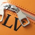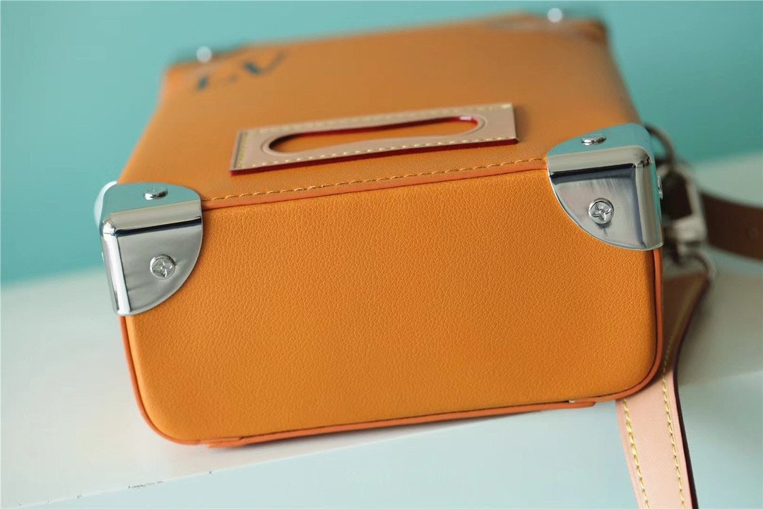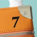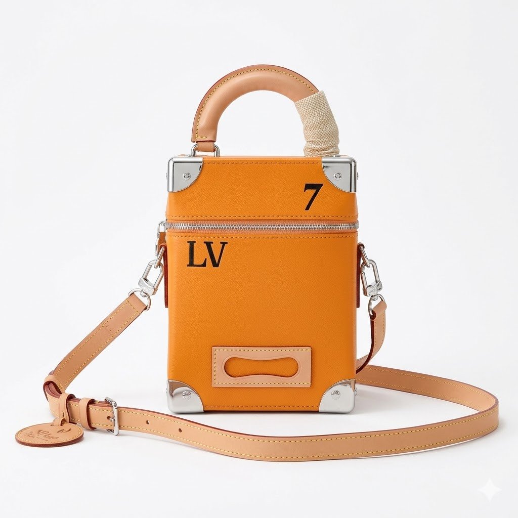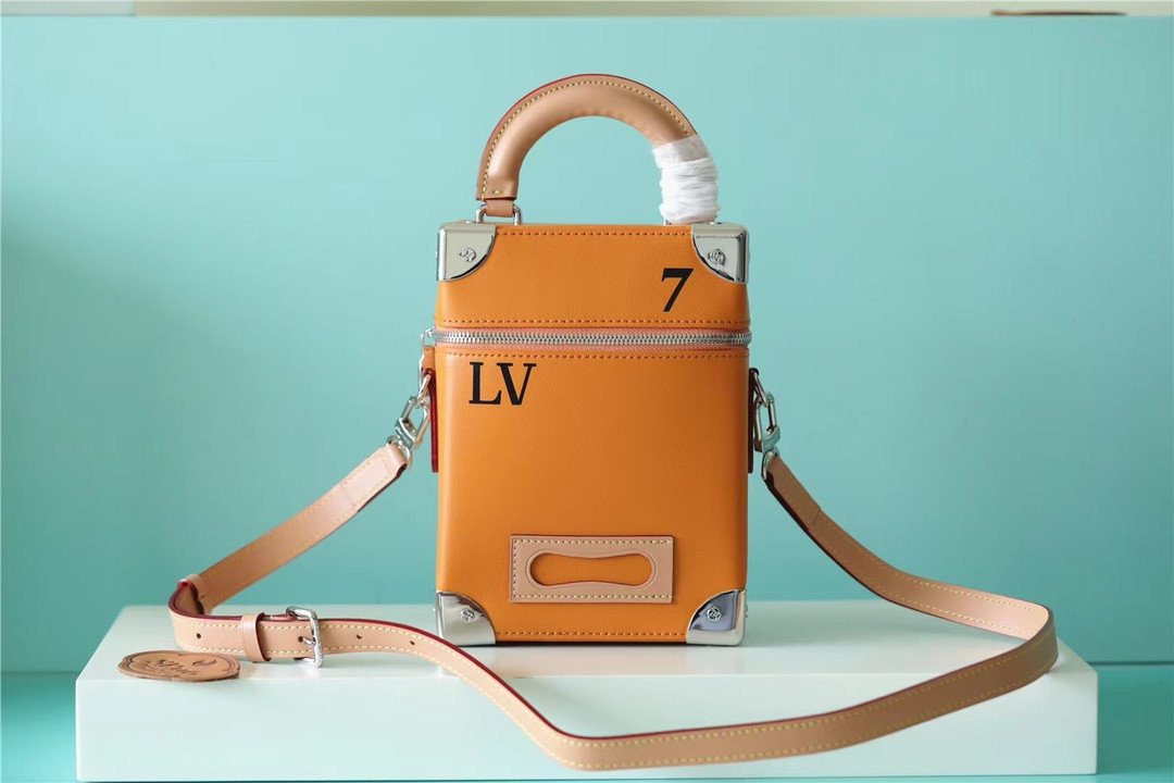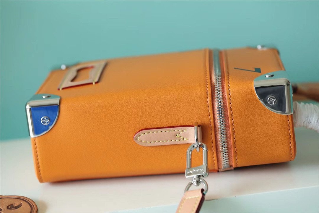 Masterfully crafted from supple, vibrant saffron-orange cowhide leather, the bag features a striking silk-screened “LV” signature and the number “7”—symbolizing Abloh’s seventh collection for Louis Vuitton. The vertical silhouette is brilliantly accented with classic trunk-inspired details, including reinforced silver-tone metallic corners and a structured base.