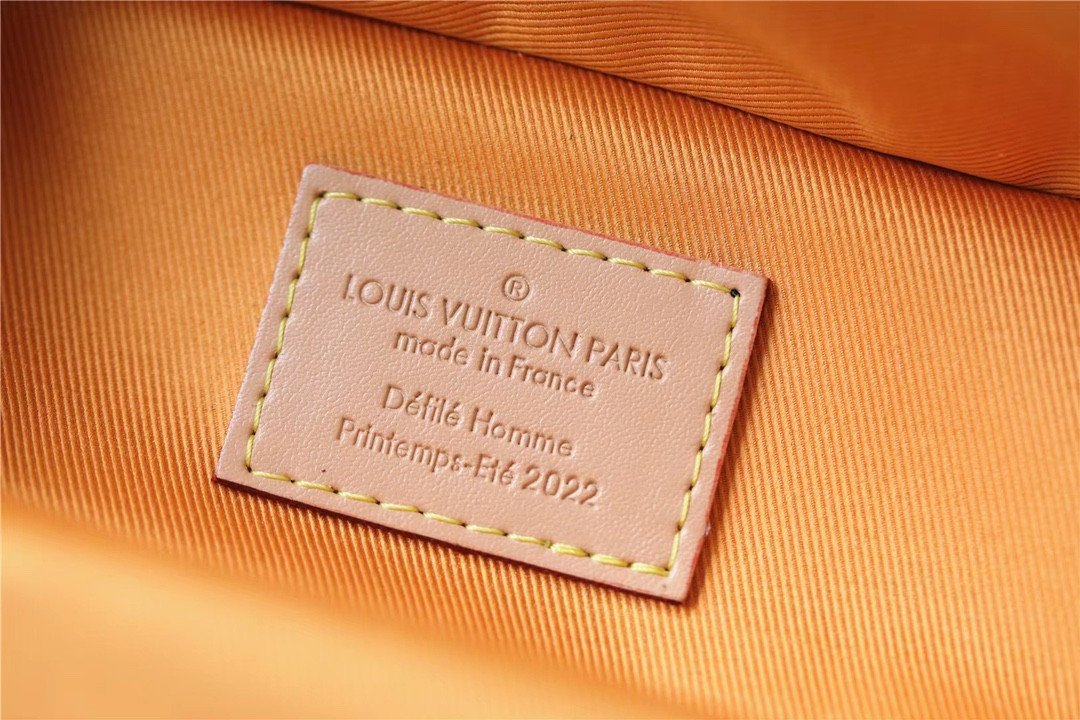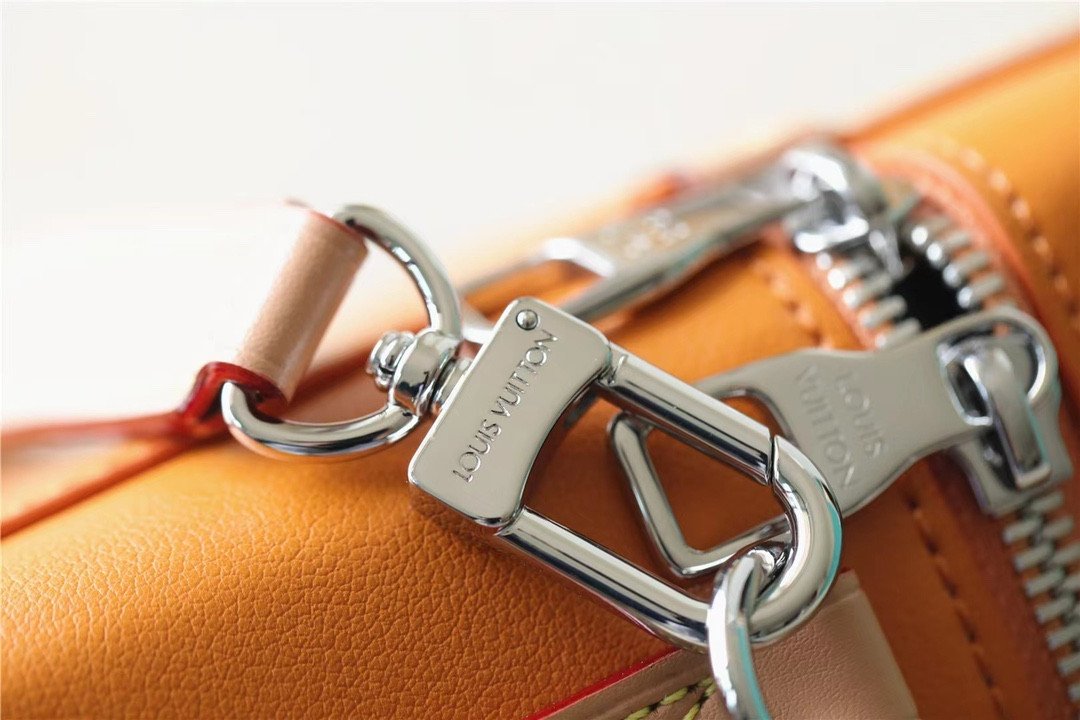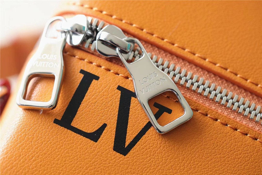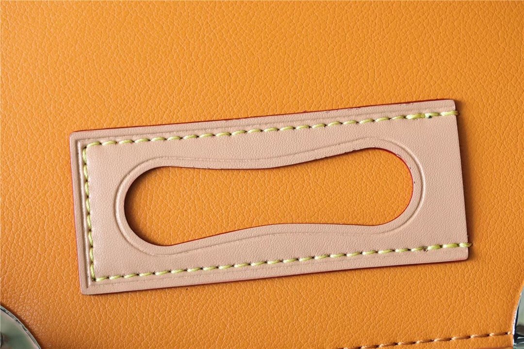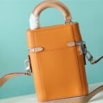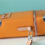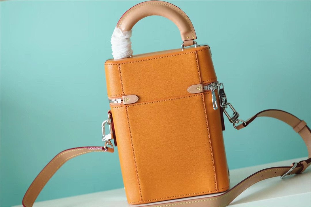 Masterfully crafted from supple, vibrant saffron-orange cowhide leather, the bag features a striking silk-screened “LV” signature and the number “7”—symbolizing Abloh’s seventh collection for Louis Vuitton. The vertical silhouette is brilliantly accented with classic trunk-inspired details, including reinforced silver-tone metallic corners and a structured base.