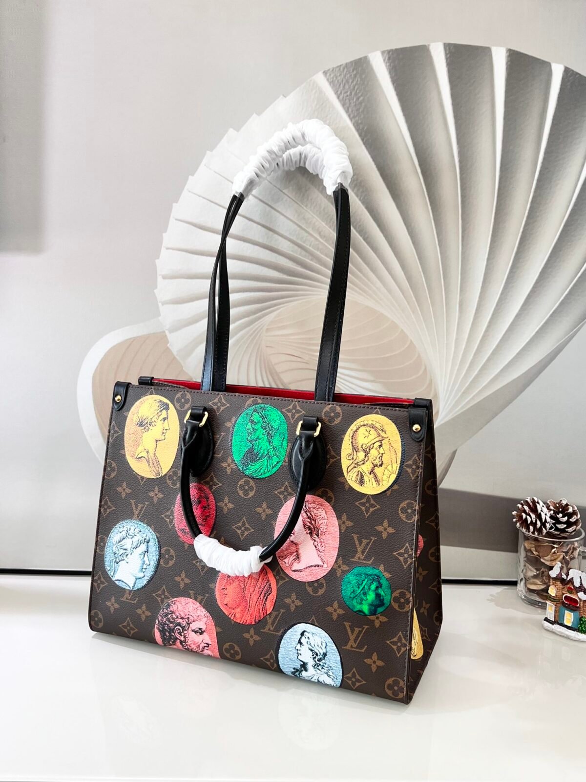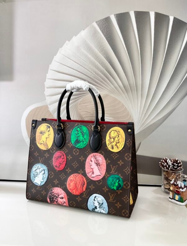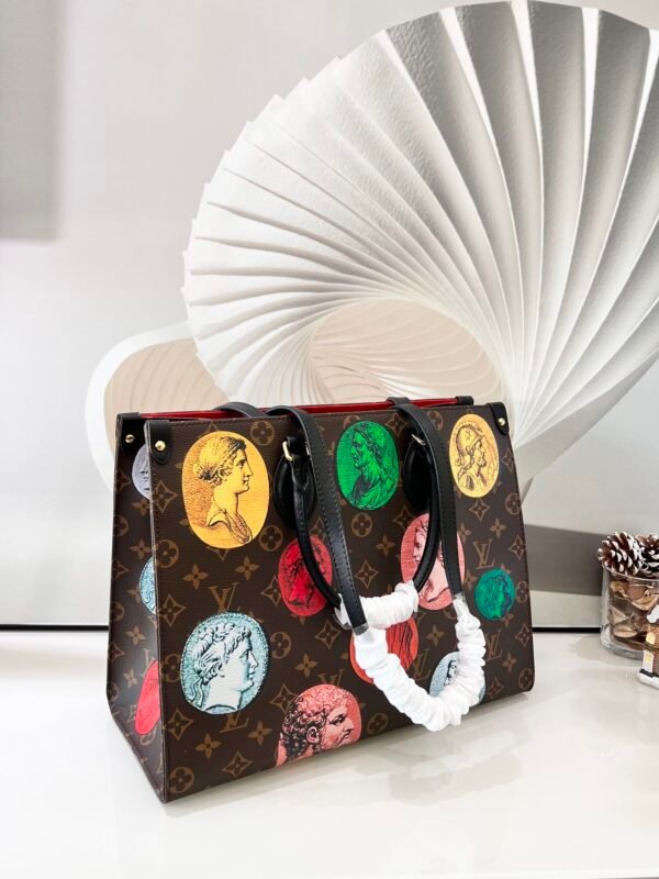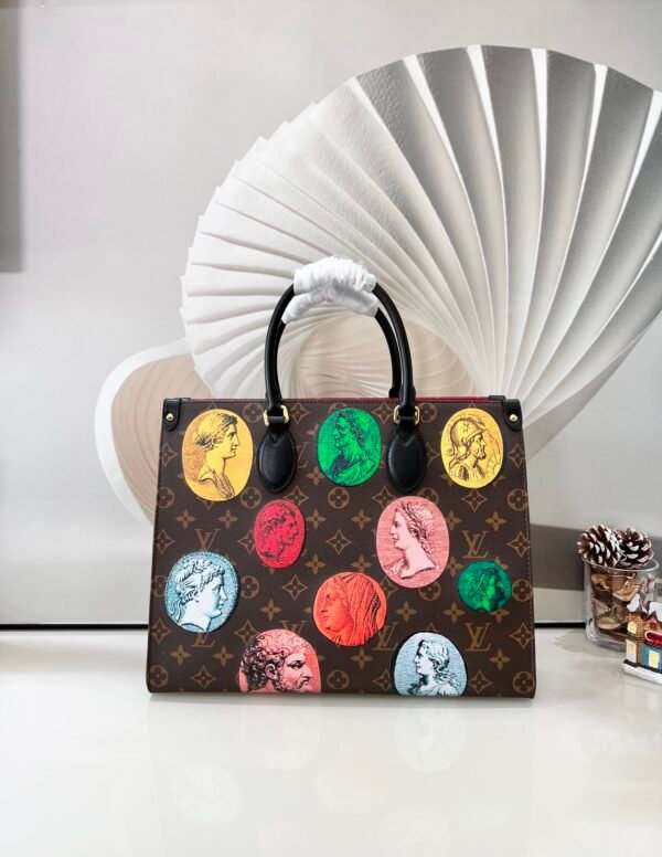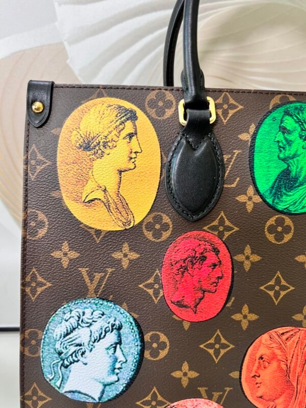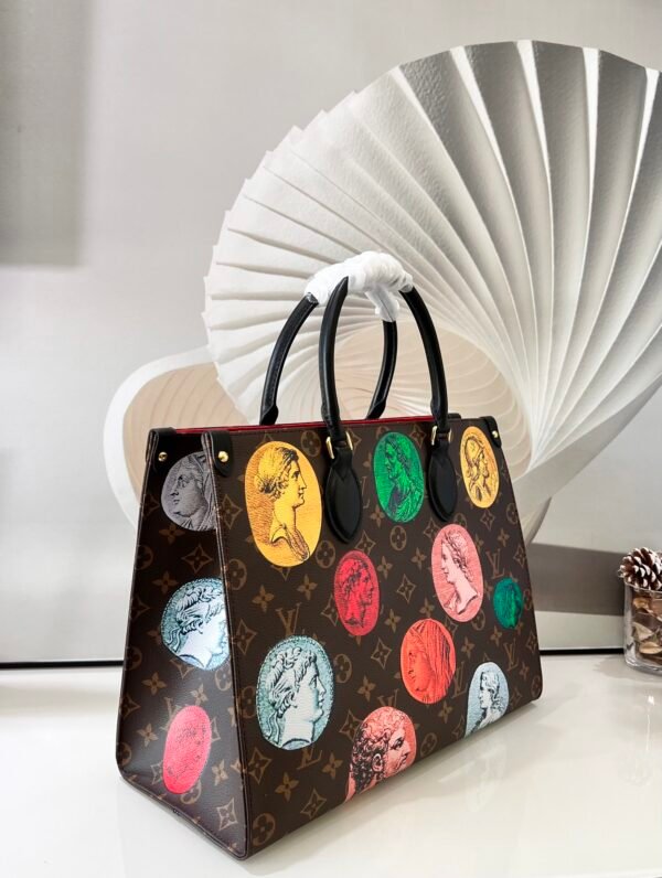 • Key Features: Colorful Fornasetti ancient coin motifs, classic Monogram background, black leather Toron top handles, integrated long shoulder straps, and a highly spacious interior.