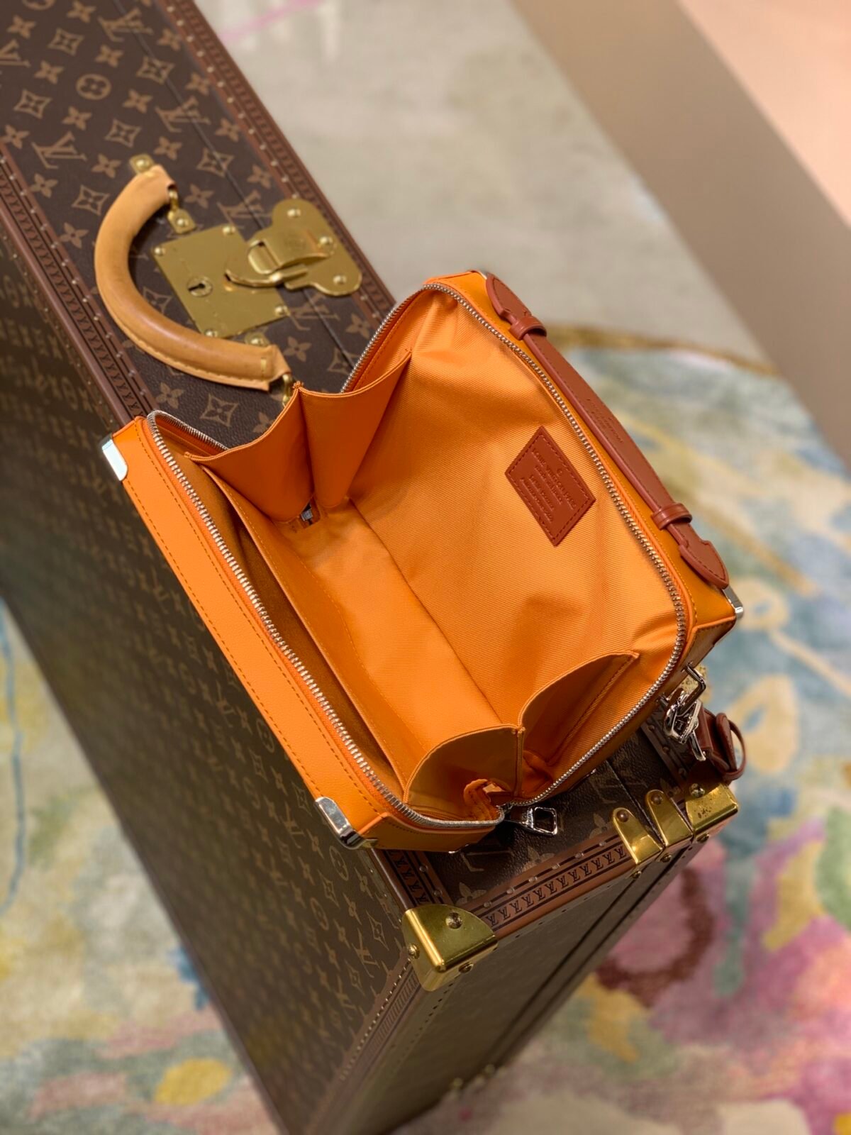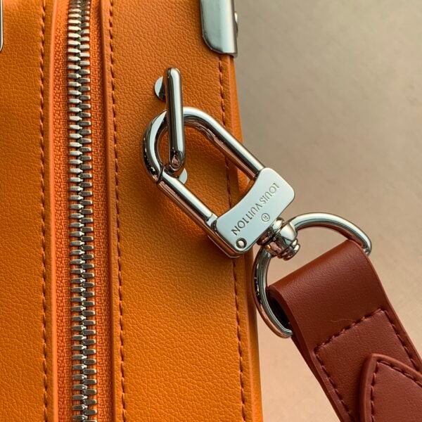 Signature Details and Versatile Wear. The most prominent detail is the oversized, contrasting ‘LV’ initials on the side, serving as a powerful emblem of the brand. Every element, from the reinforced silver-tone metal corners to the secure double zipper, speaks to uncompromising quality. For versatile carrying, it is equipped with a sturdy top handle and a detachable, adjustable leather shoulder strap, allowing it to be carried by hand, on the shoulder, or crossbody. The interior is thoughtfully designed to secure your essentials.