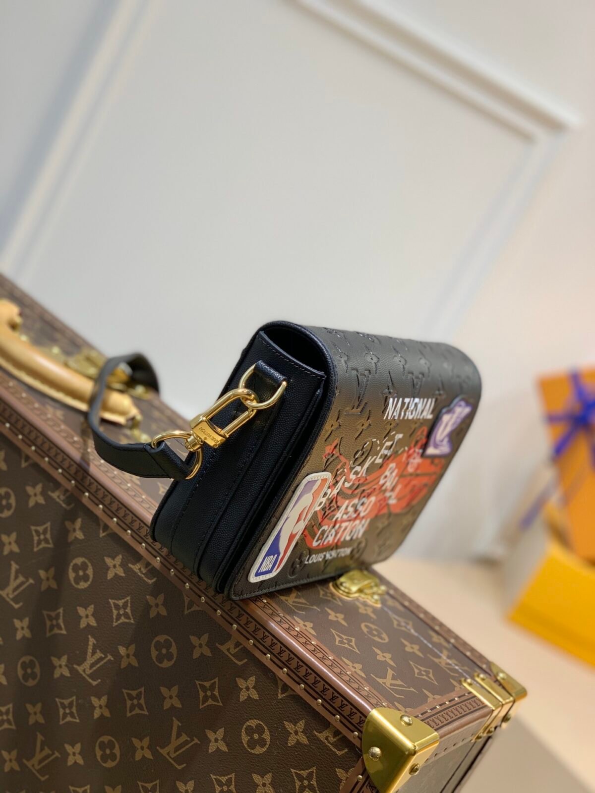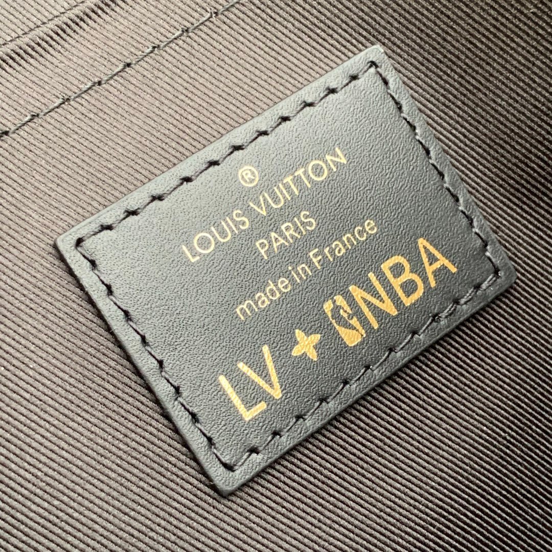 Crafted from the house’s luxurious black Monogram Empreinte (embossed cowhide) leather, the sleek body of the bag serves as the perfect canvas for a series of vibrant prints and embroidered patches that seamlessly bridge the basketball universe with Louis Vuitton’s iconic heritage. Distinctive, eye-catching details include the official NBA logo patch, striking red and white “National Basketball Association” typography graphics, and a prominent blue LV logo patch.