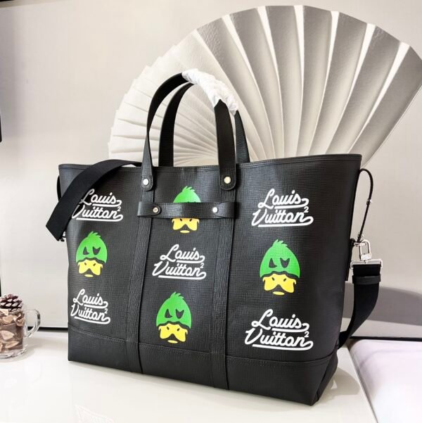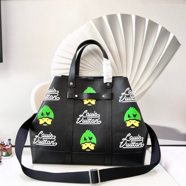 A sleek Black leather version featuring playful green “Duck” graphics alongside vintage-style Louis Vuitton typography.