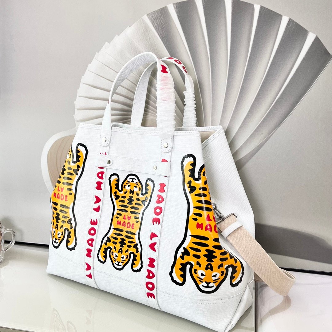 A crisp White leather version showcasing striking, oversized “Tiger” motifs with bold red “LV MADE” lettering.