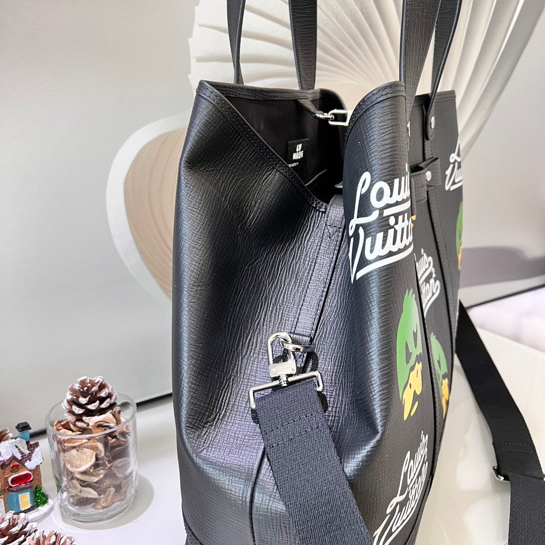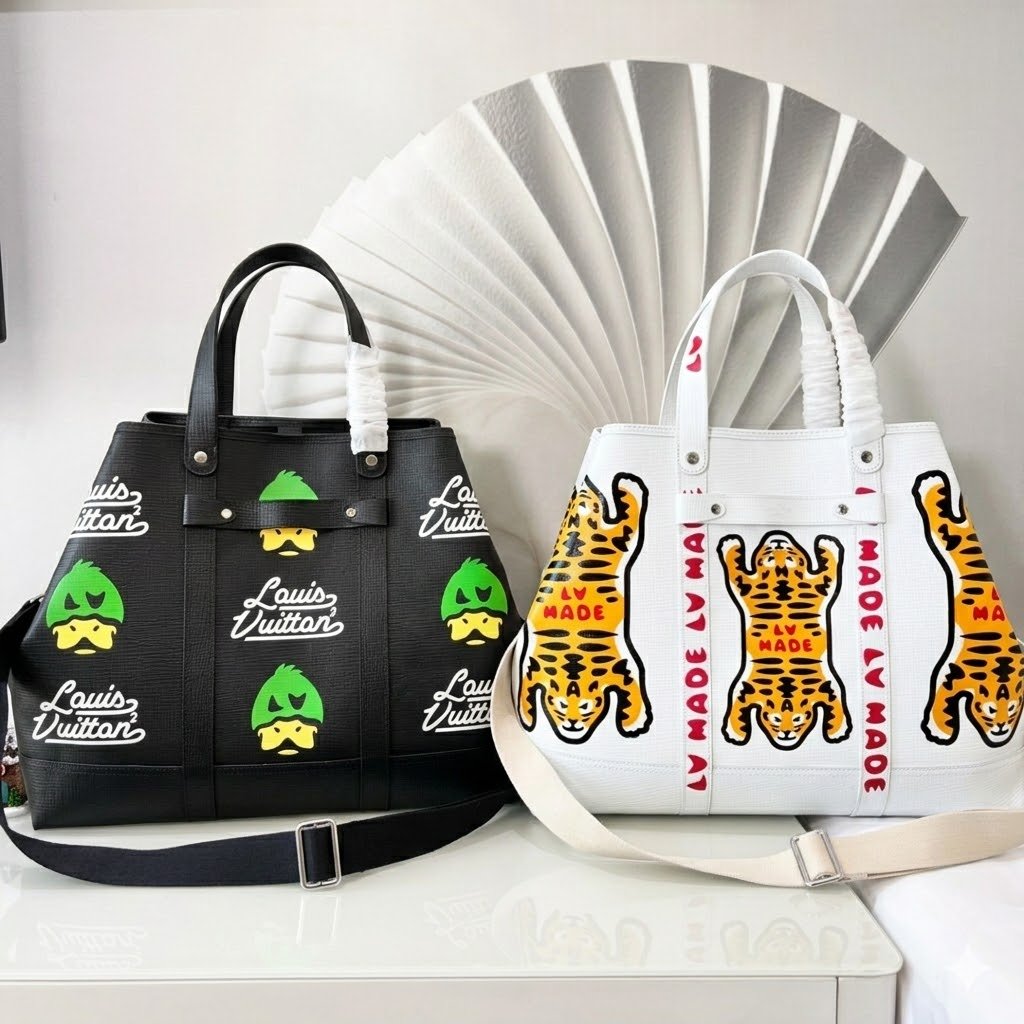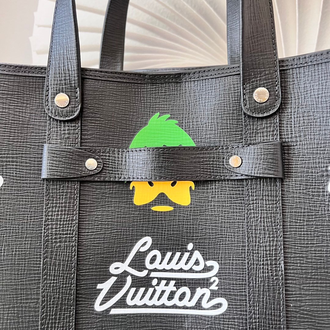 The bag’s structured silhouette is beautifully reinforced with vertical and horizontal leather strapping and signature metallic rivet elements, directly paying homage to classic LV luggage. The textured leather exterior serves as a playful canvas for Nigo’s iconic graphic artistry. Despite its bold, artistic exterior, the Tote Journey does not compromise on practicality. It boasts an incredibly spacious interior, making it the ultimate companion for busy daily commutes, shopping trips, or stylish weekend getaways. For maximum comfort, it is equipped with sturdy leather top handles and a wide, adjustable canvas shoulder strap.