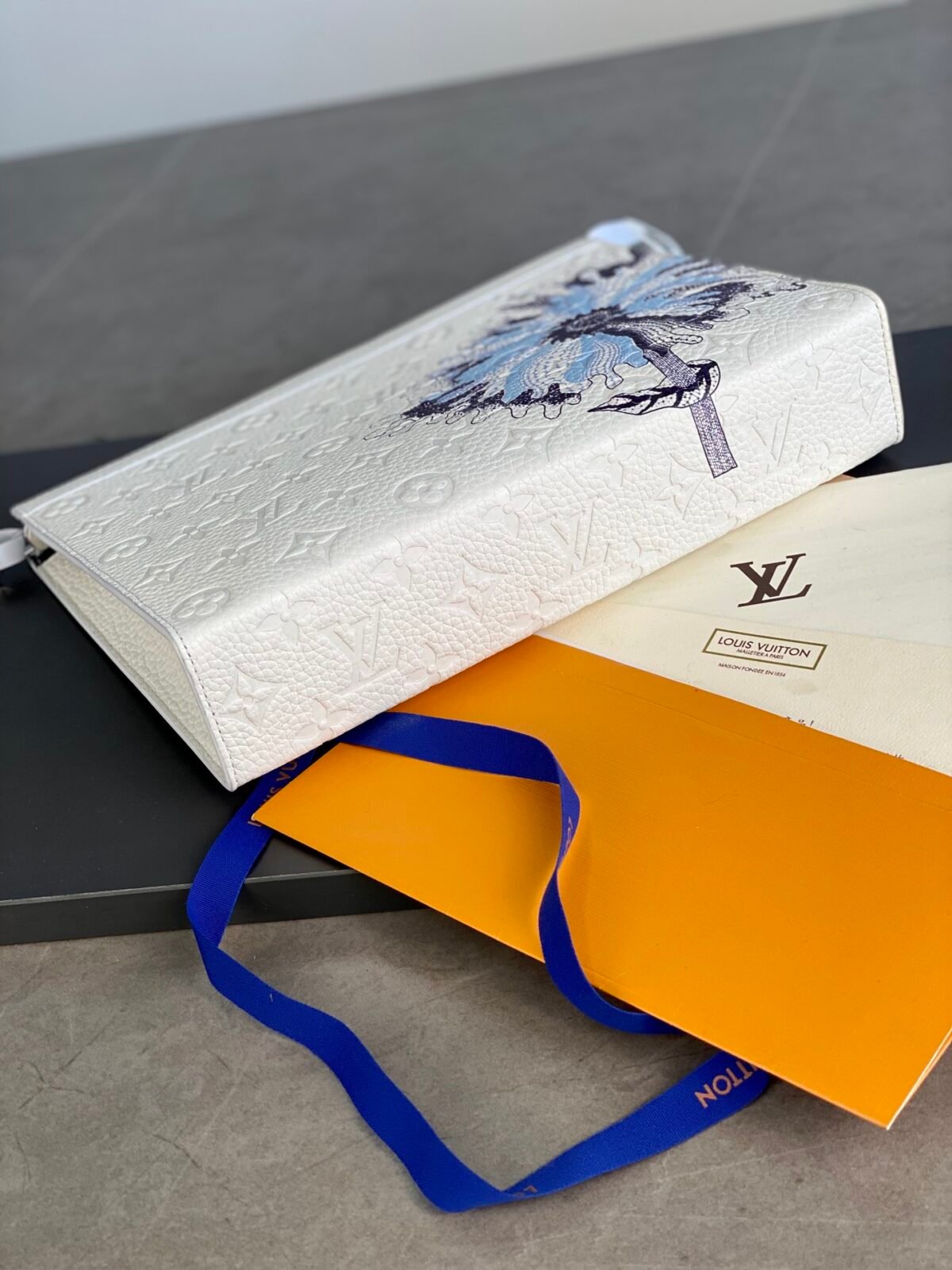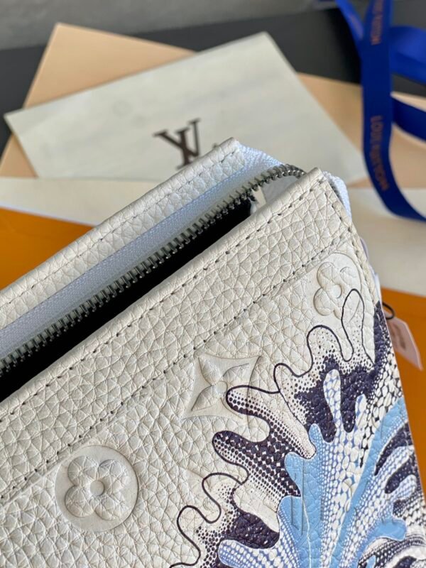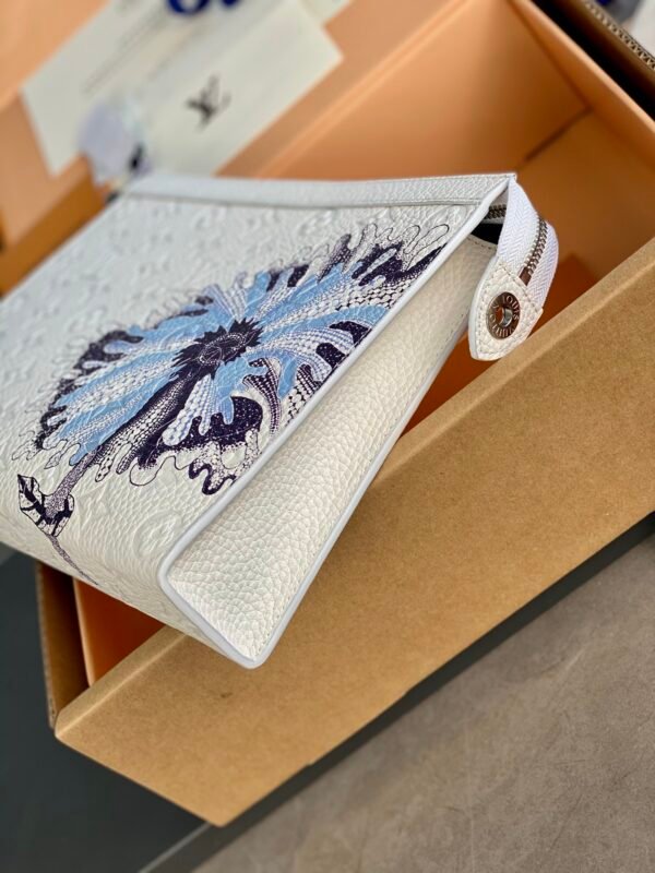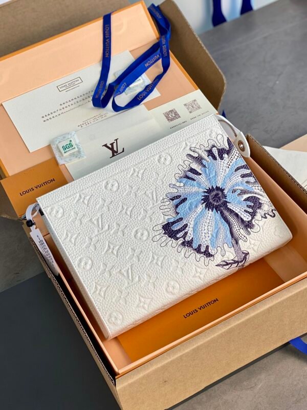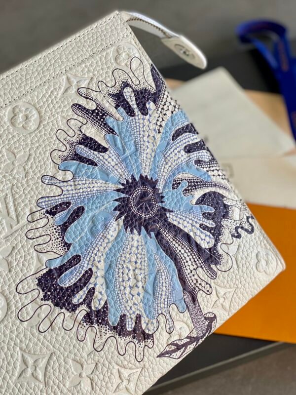 Signature Craftsmanship meets Avant-Garde Vision The pouch is dominated by a striking, oversized floral motif, rendered in a series of intricate blue and purple “Painted Dots.” This artisanal print perfectly captures the hand-painted feel of Kusama’s work, bringing a vibrant, organic energy to the structured silhouette. Finished with polished silver-color hardware and a discreet LV signature, this accessory is a bold statement of creative prestige and timeless craftsmanship.