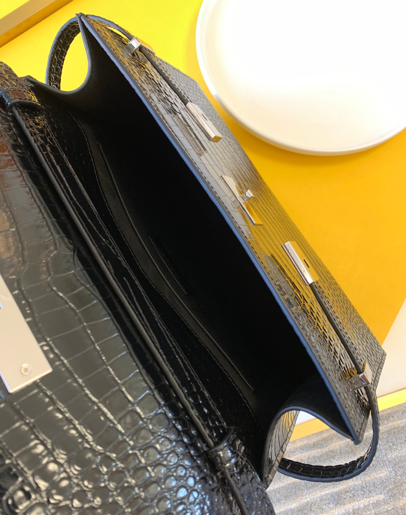 Exquisite Leather: Crafted from selected “Original Factory Leather,” featuring a stunning glossy crocodile/toothpick grain embossing that adds a rich, textured depth to the black leather.