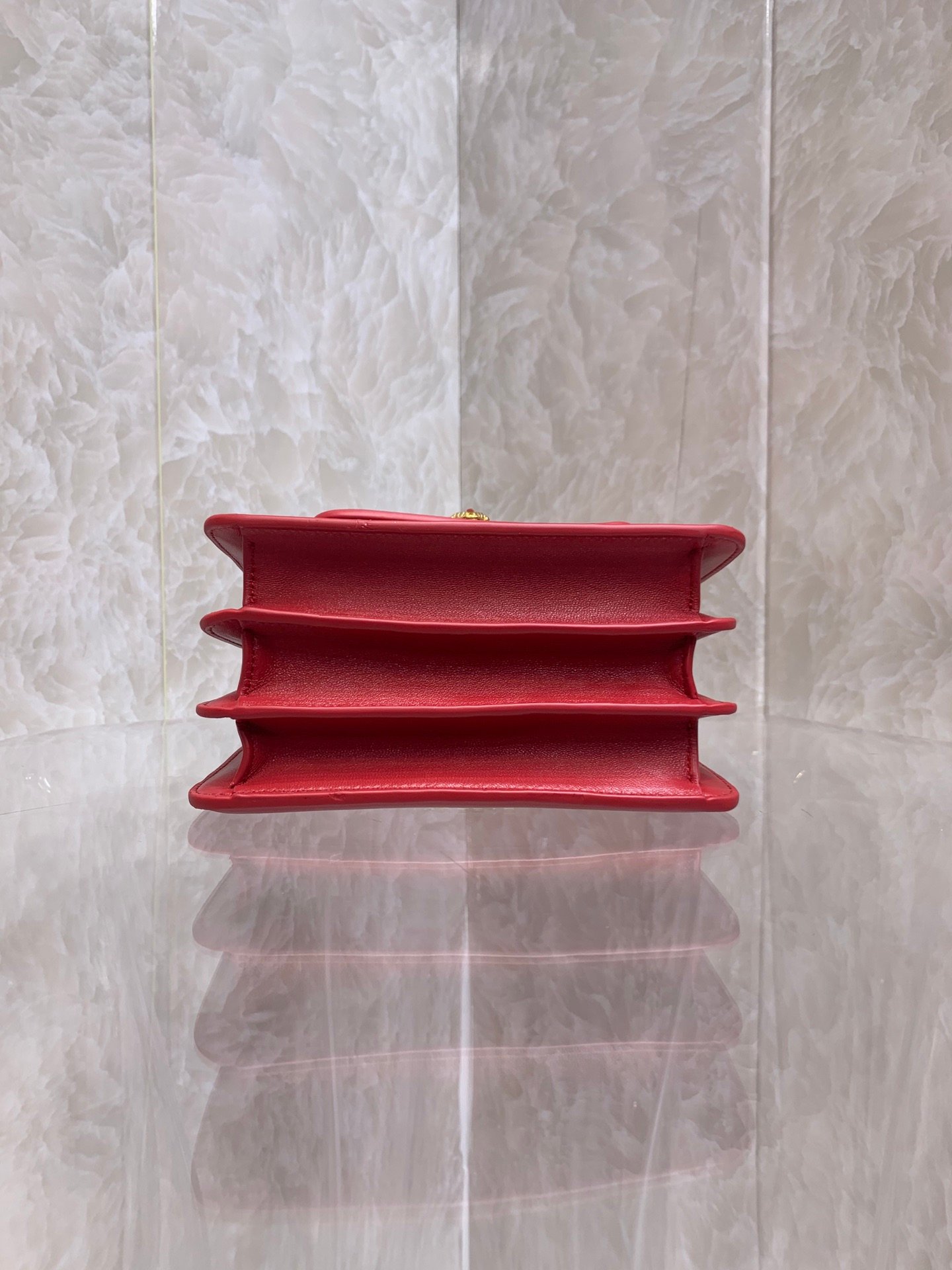 Modern Versatility Designed for the dynamic lifestyle, this 18cm small model is surprisingly functional. It features three well-organized compartments, a frontal pocket, and a back patch pocket to keep items secure. While the chain handle offers a chic evening look, the wide, detachable leather strap provides comfort for casual crossbody wear, making it the perfect day-to-night companion.