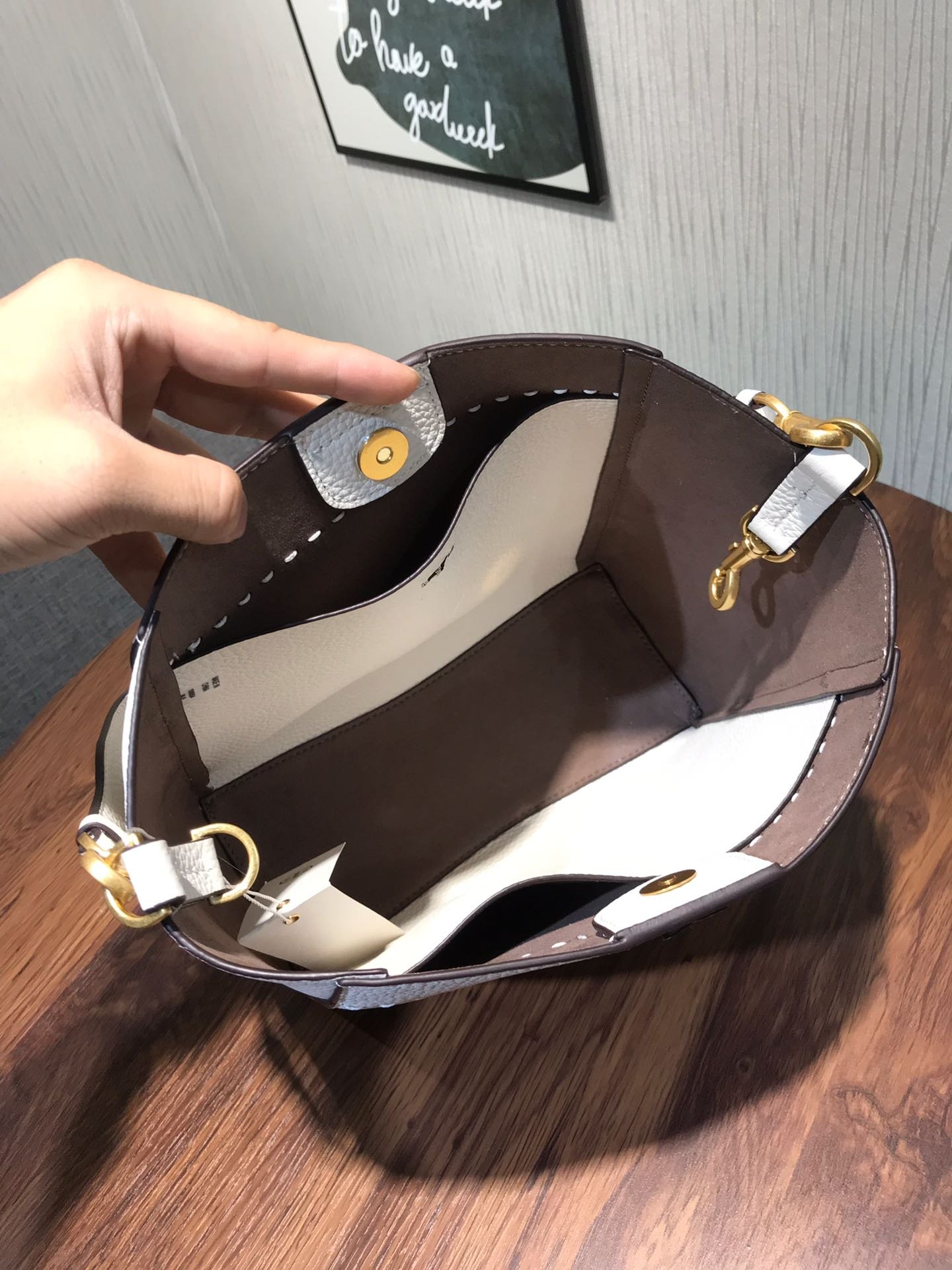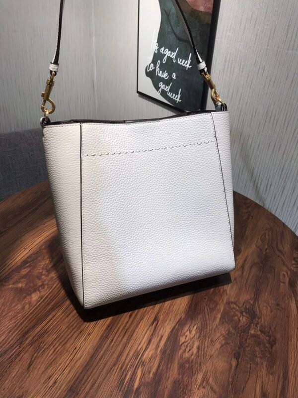 Strap: Features a comfortable leather shoulder strap attached with vintage-style dog-leash clips.