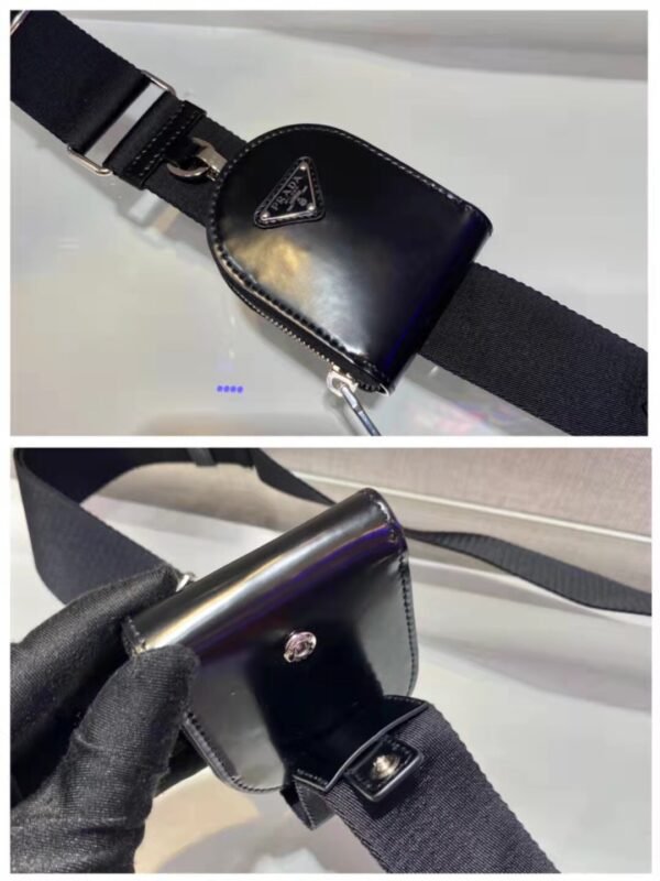 Function meets high fashion with its classic “camera bag” shape, offering a streamlined yet surprisingly practical compartment for your daily essentials. It features a wide, comfortable woven nylon strap that is fully adjustable for crossbody or shoulder wear. Adding a unique, utilitarian edge is the distinctive, detachable glossy leather mini pouch hooked onto the strap, providing the perfect quick-access spot for your smallest items.